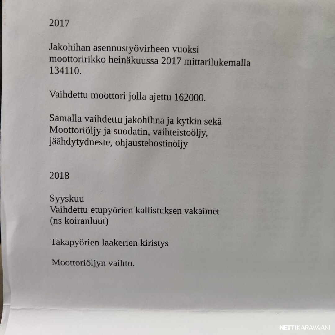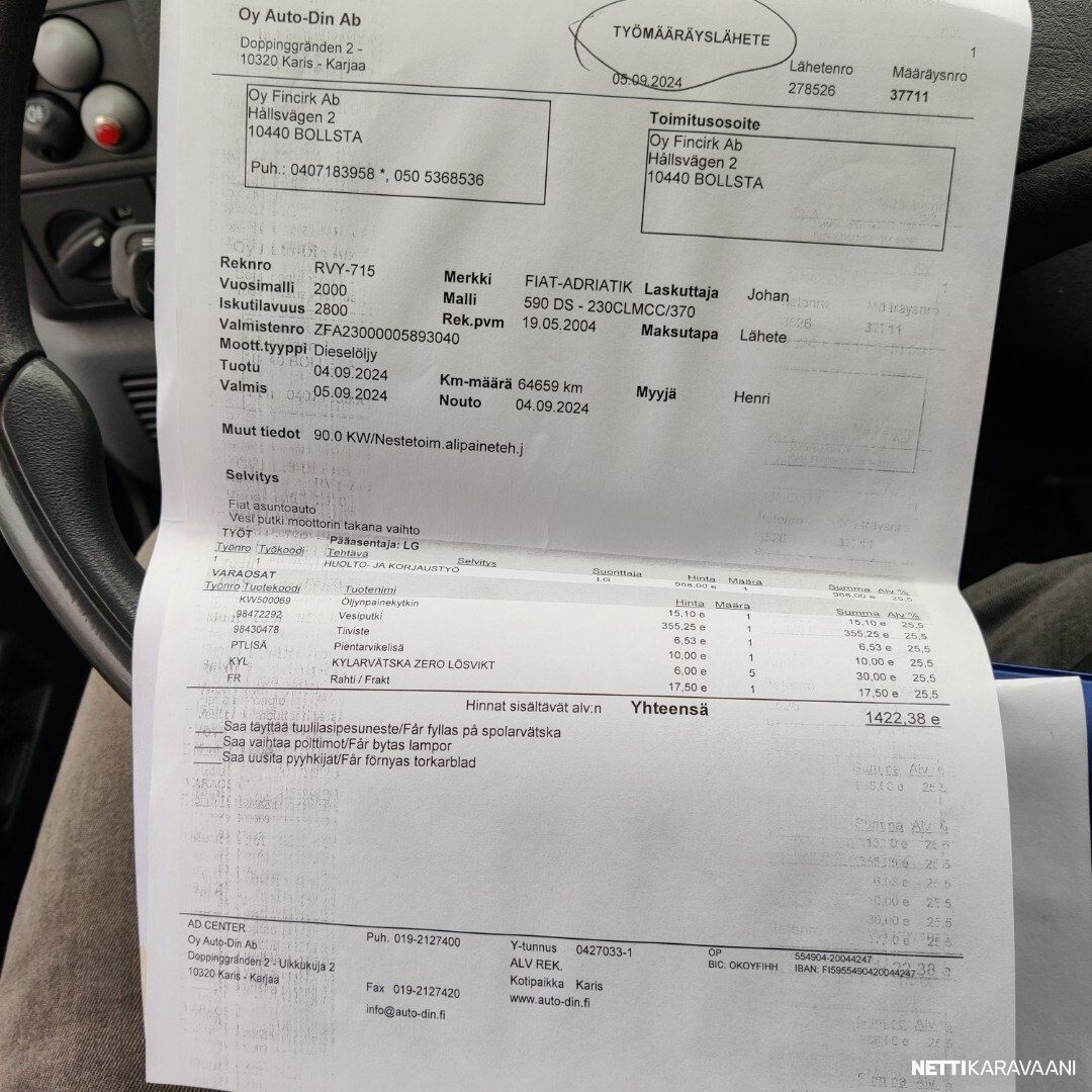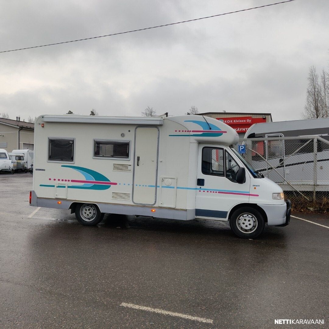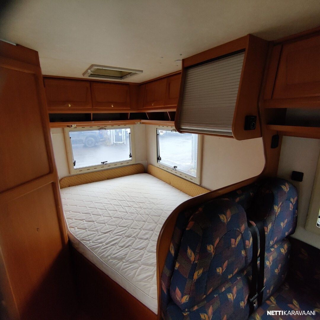 Vaihteisto: Manuaali Polttoaine: Diesel Vetotapa: Etuveto Leveys: 222 cm Pituus: 608 cm Rekisteröity: 01.09.2000 Matkustajat: 5 Kokonaismassa: 3 500 kg Oma massa: 2 805 kg Makuupaikat: 2 Ajokortti: B Lämmitys: Ei määritelty