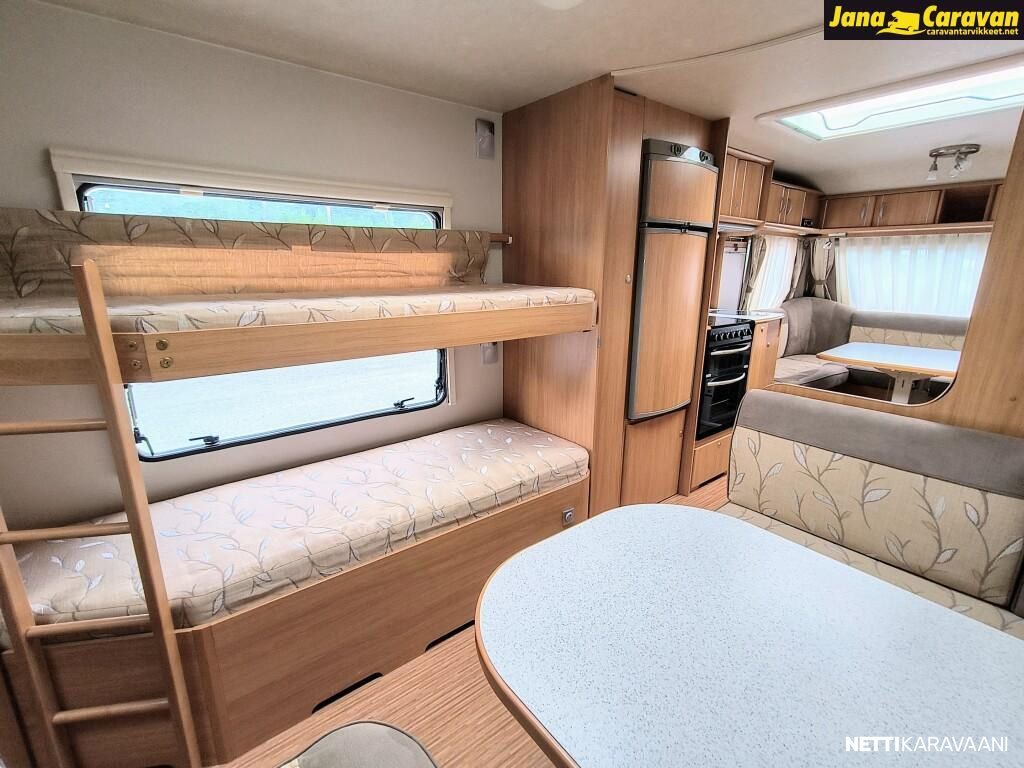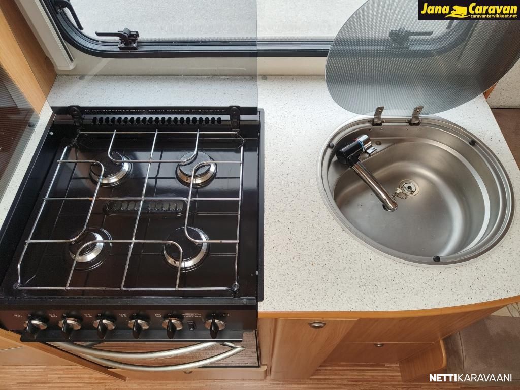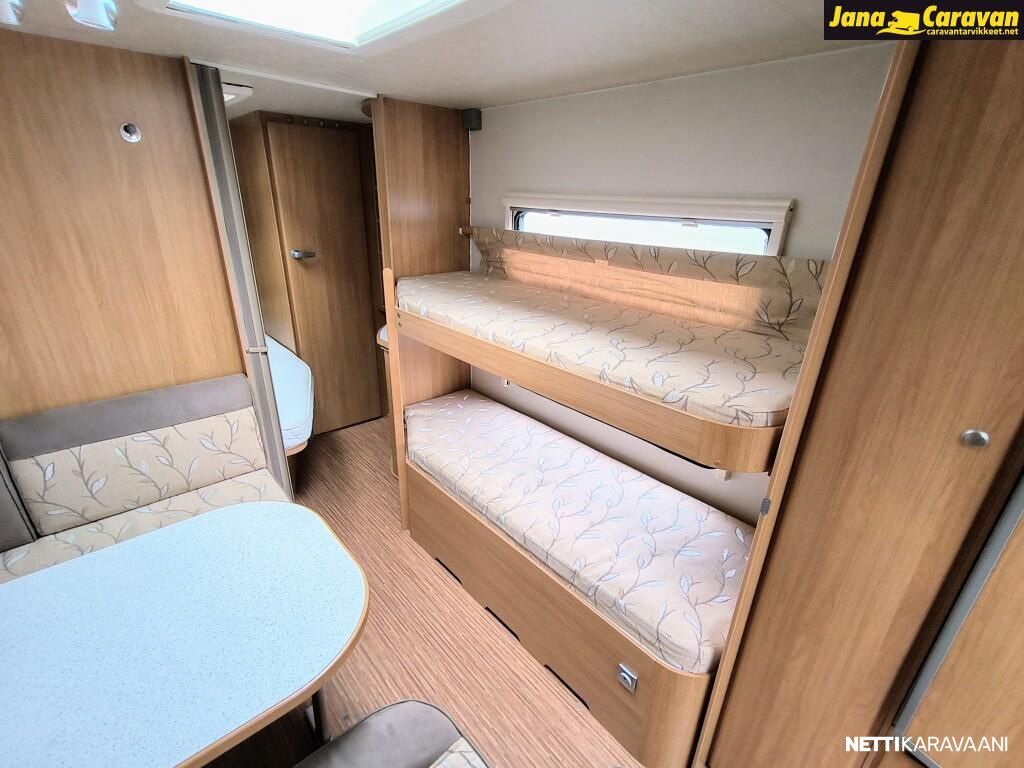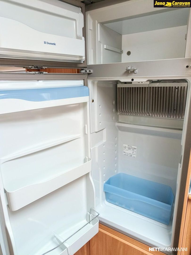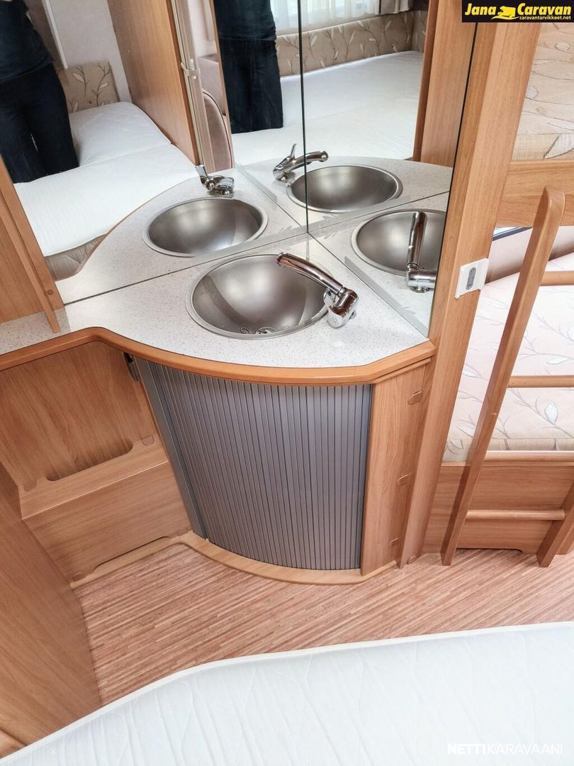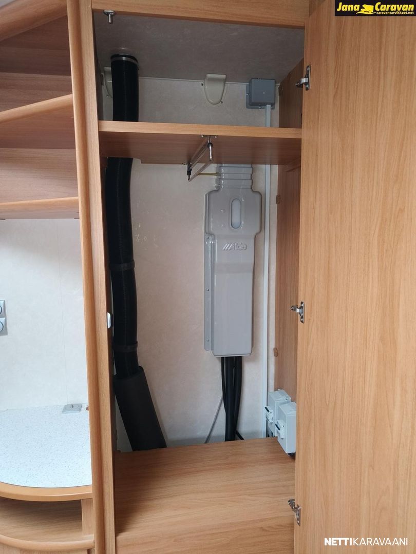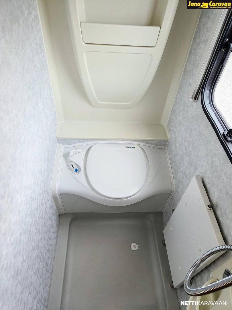 Erikoisvanteet, Kattoluukku, Kasetti WC, Suihku, Lämminvesiboileri, Pyöräteline, Liesi, Jääkaappi, Pakastelokero, Kaasu-uuni, Kasettiverhot, Tukijalat, Pesuallas, Lattialämmitys, Sähköpatruuna, Alde