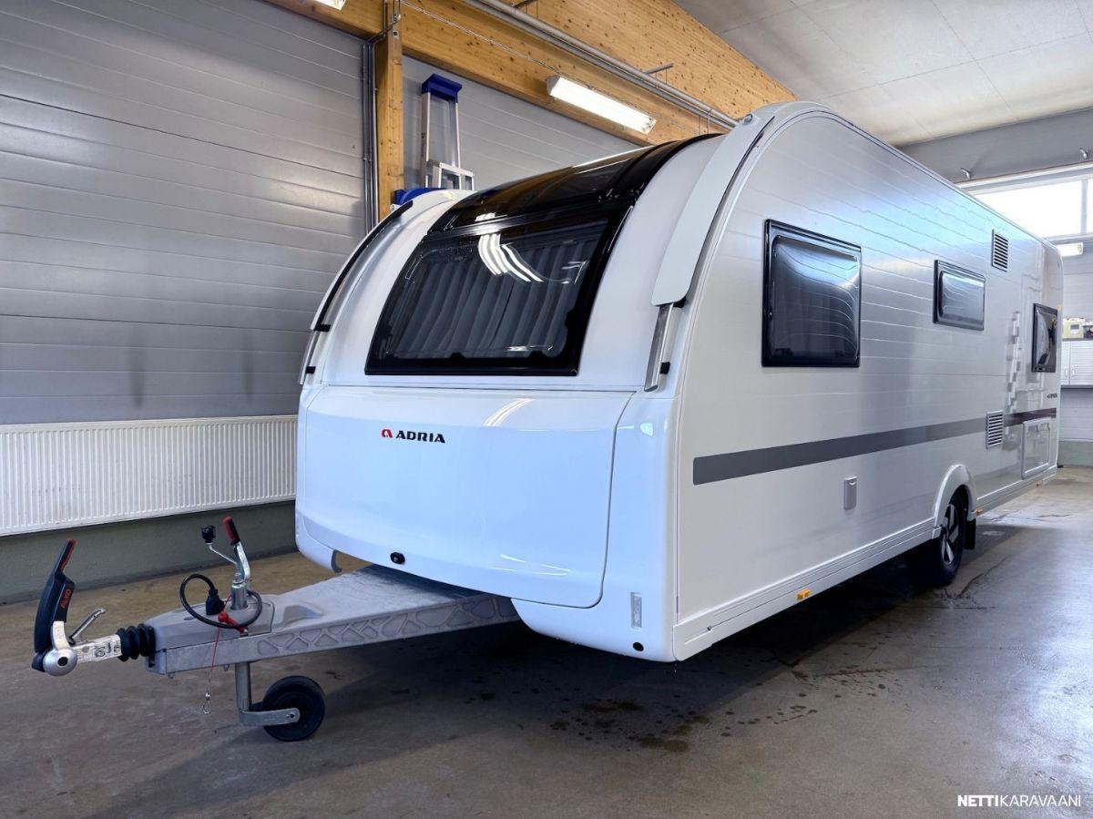 Alde -nestekeskuslämmitys, lattialämmitys, leveä ulko-ovi ikkunalla ja kätevällä irroitettavalla roskakorilla, jossa kantokahva, Led valaistus ja epäsuora tunnelmavalaistus himmennyksellä, patjanpääliset ja koristetyynysarja, suuri 140 l. jääkaappi, liesituuletin, Bluetooth -audiojärjestelmä, USB-pistorasiat, kitkavetopää, roiskeläpät, Adria Ergo -pesuhuone, kätevä muunneltava hylly/lokero järjestelmä, upea keulan panoraama kattoikkuna.