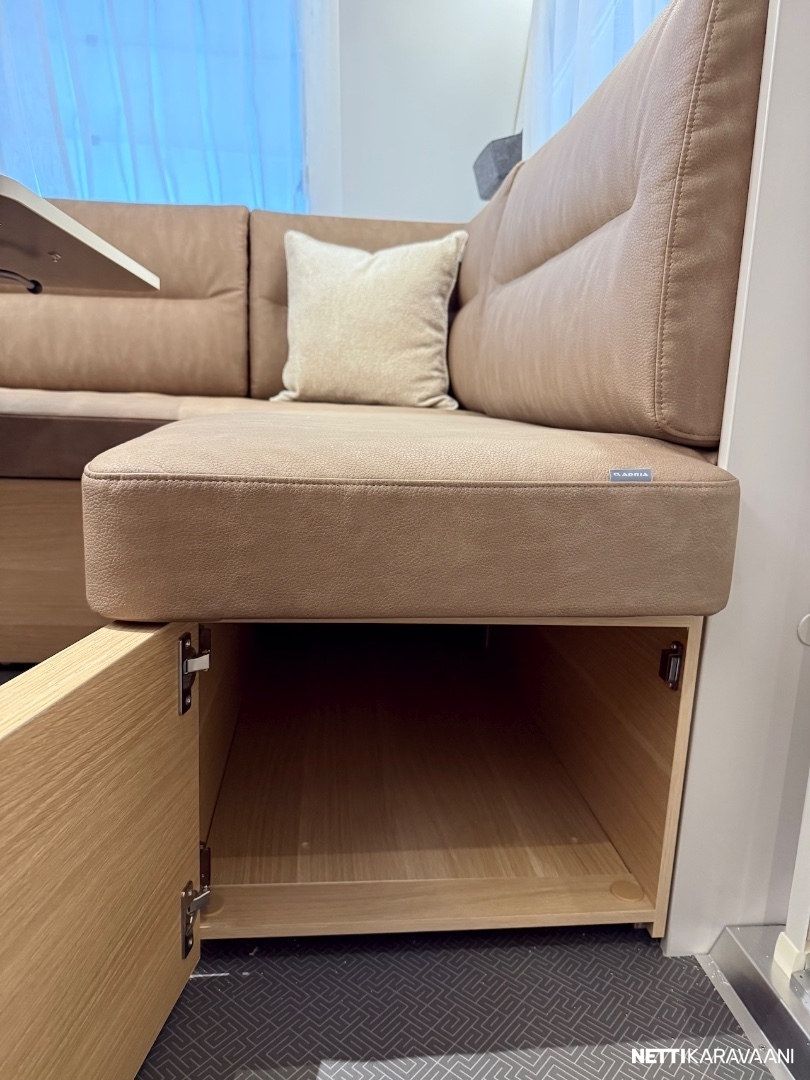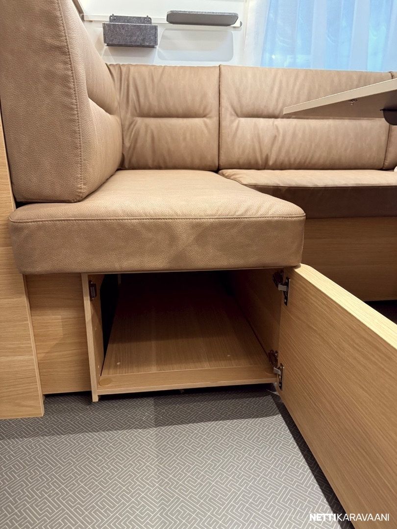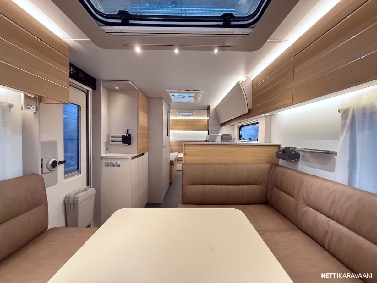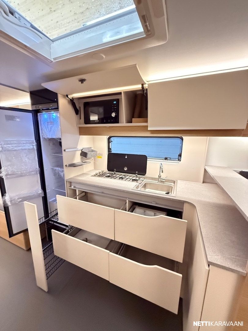 Plus paketti (sis. alumiinivanteet, hyttysverkko-ovi, TV-teline, teleskooppi pöydänjalka, MidiHeki -kattoikkuna), mattosarja, mikrouuni yläkaapissa, helppohoitoinen Morgan -keinonahkaverhoilu, tehokas 100 AH AGM -akku.