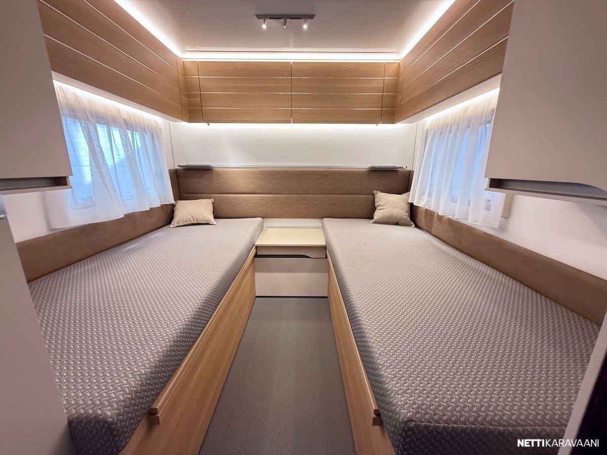 Tässä vaunussa käden käänteessä yhdistettävissä olevat erillisvuoteet, helppohoitoinen Morgan -keinonahkaverhoilu ja tehokkaampi 100 AH AGM -akku!