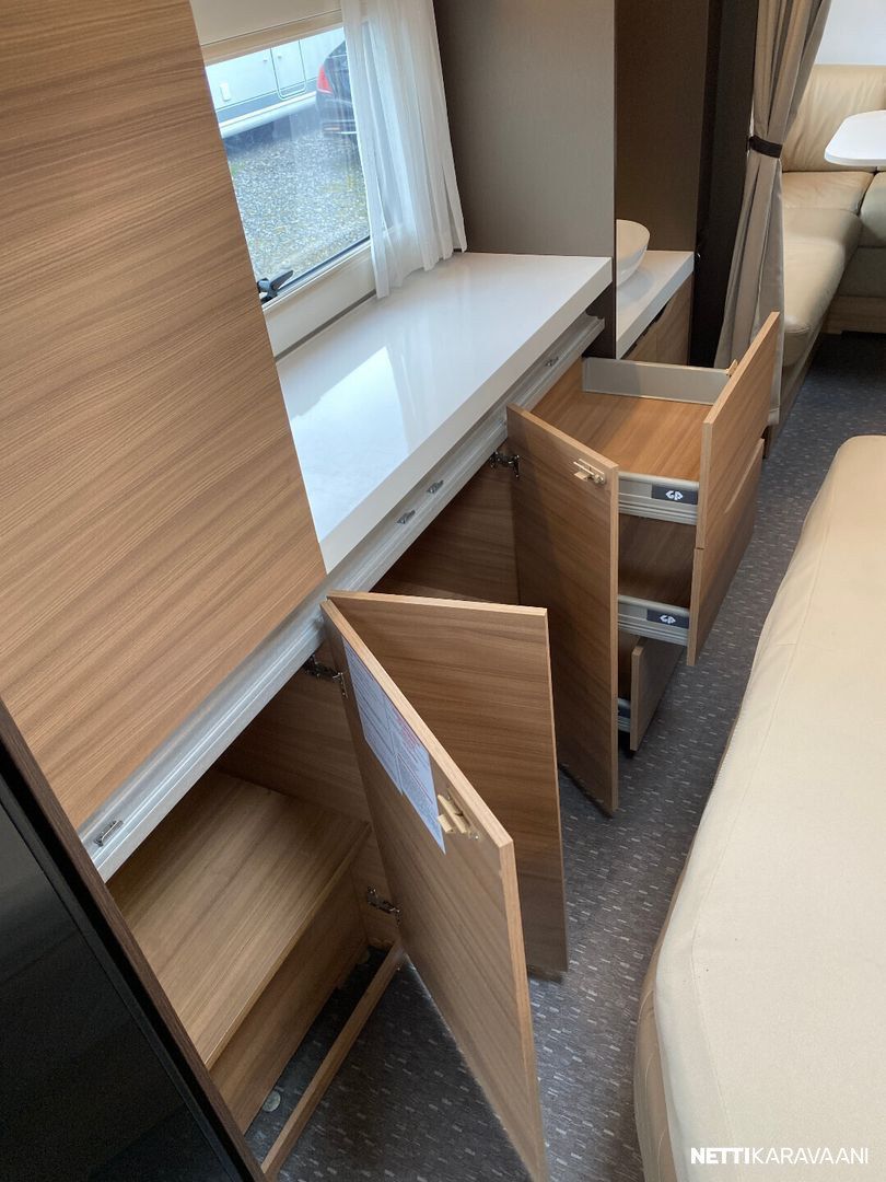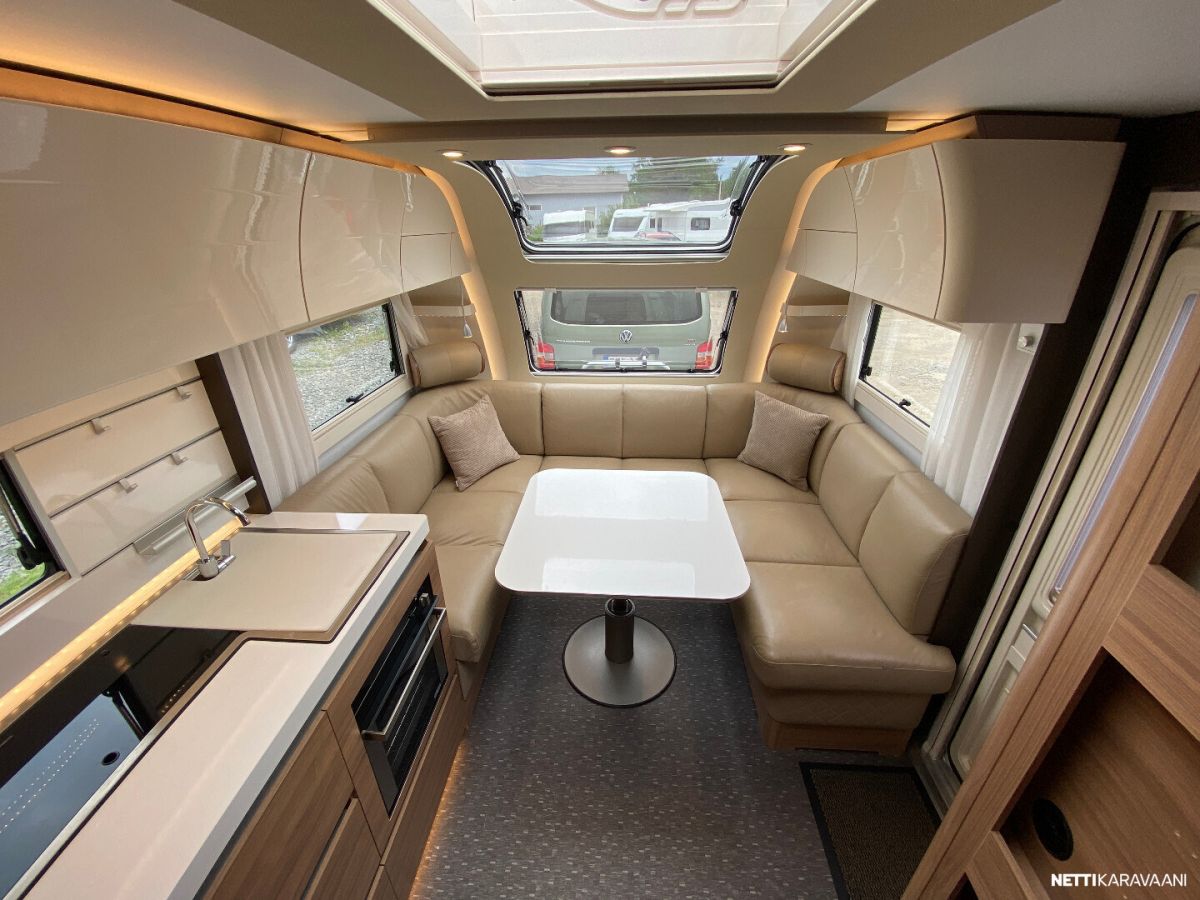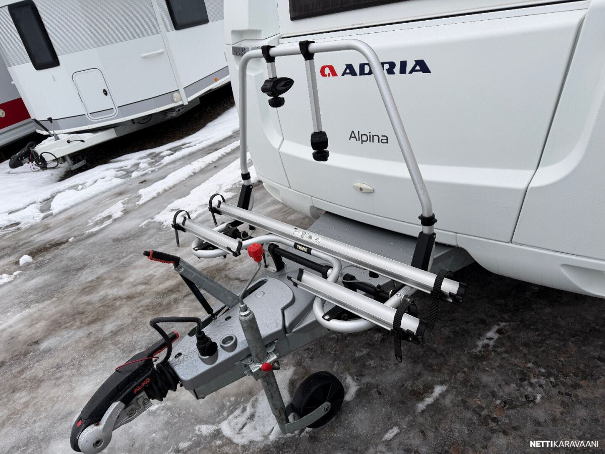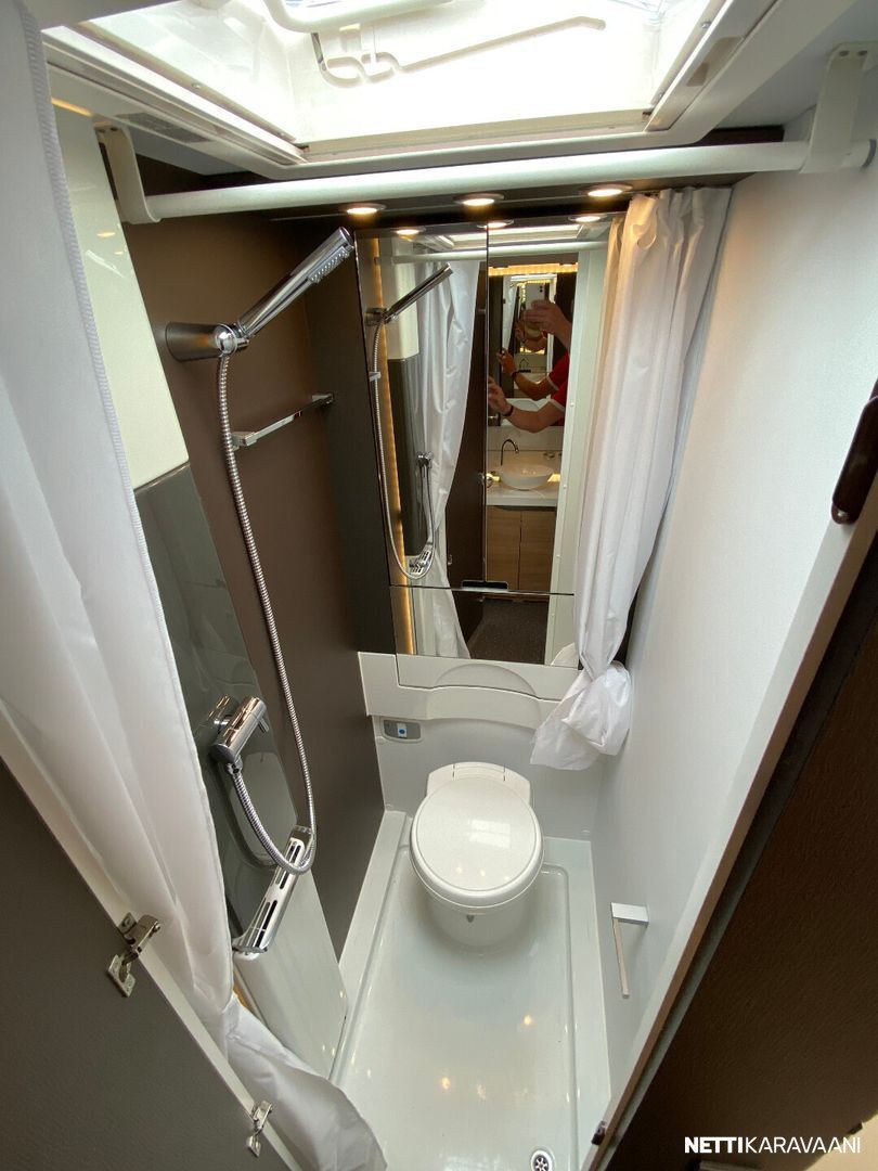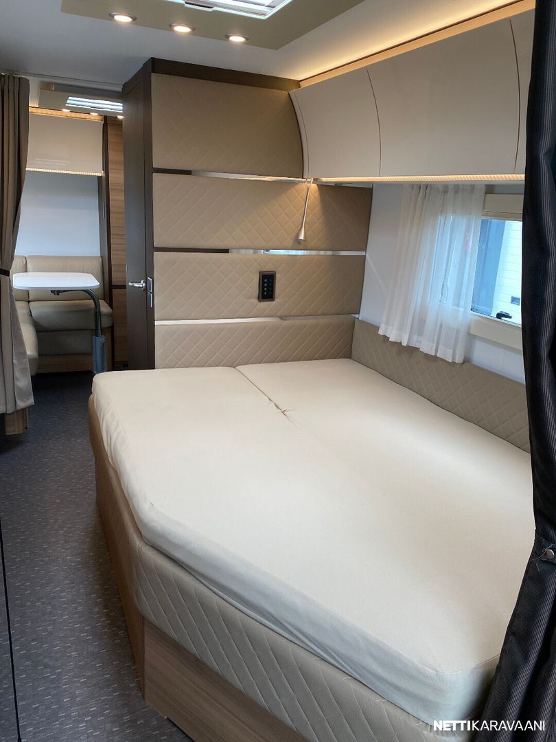 Nahkaverhoilu, Alde-nestekeskuslämmitys, nestekiertoinen lattialämmitys, sähköpatruuna, lämmin vesi, suihku, liesi uuni,, liesituuletin, iso jääkaappi/pakastin, mikro, kiinteä raikasvesisäiliö, kiinteä harmaavesisäiliö, niskatyynyt istuinruhmässä, kolmikerrosvuode, kasetti-wc, kasettiverhot, bluetooth , akku-/ laturivarustus, telttapalvelu, tv-teline, suksiluukku x 2, tavaraluukku, kitkavetopää, hyttysovi, alu-vanteet, pyöräteline edessä, aurinkopaneeli, kaasupullo...