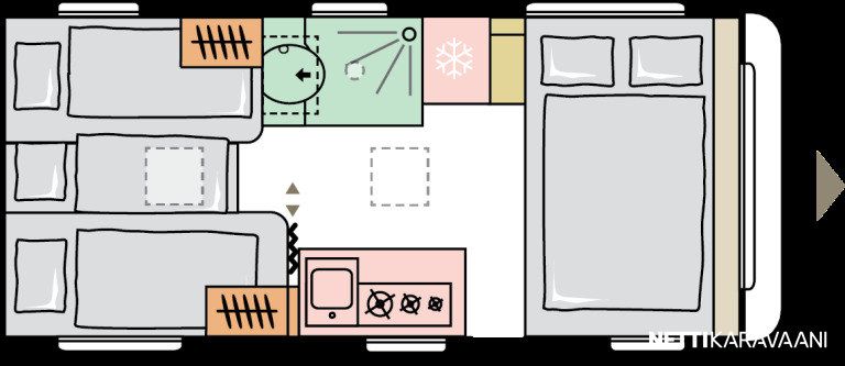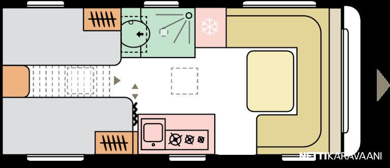 -Pluspaketti joka sisältää: Truma UltraHeat sähkölämmitys, Aluvanteet, TV-Teline, Hyttysverkko oven yläosassa.