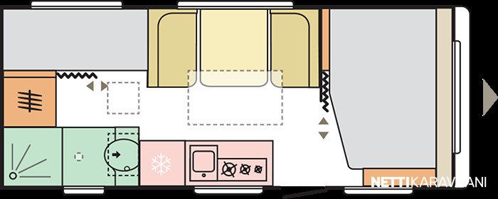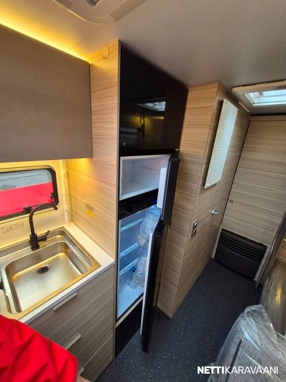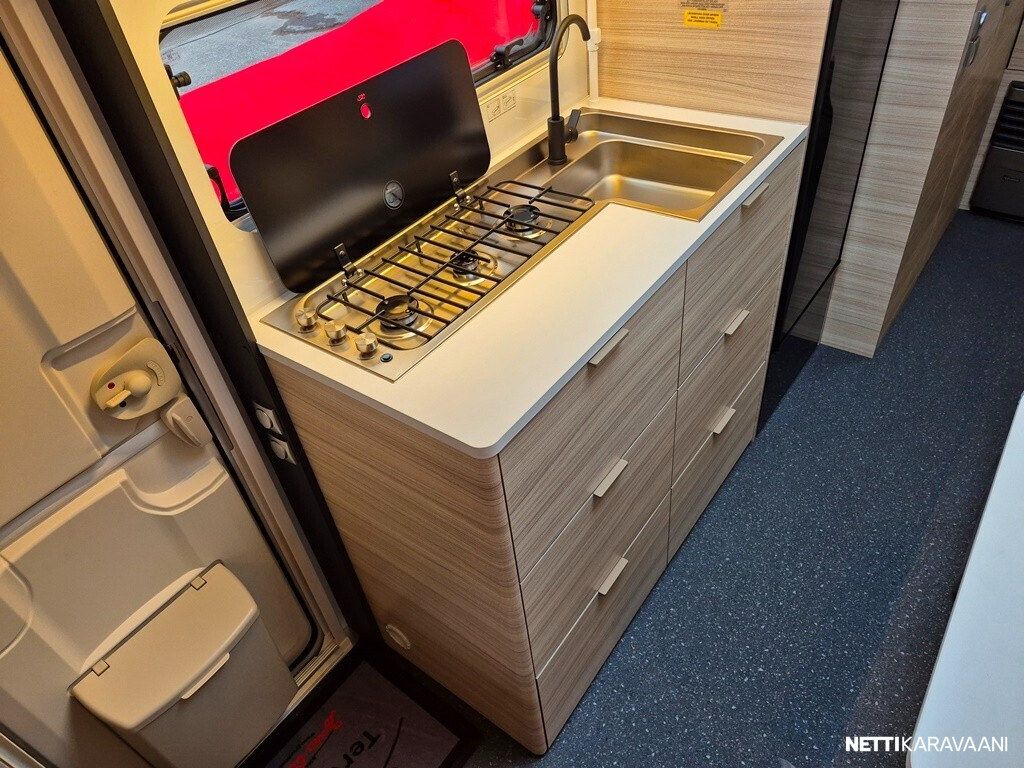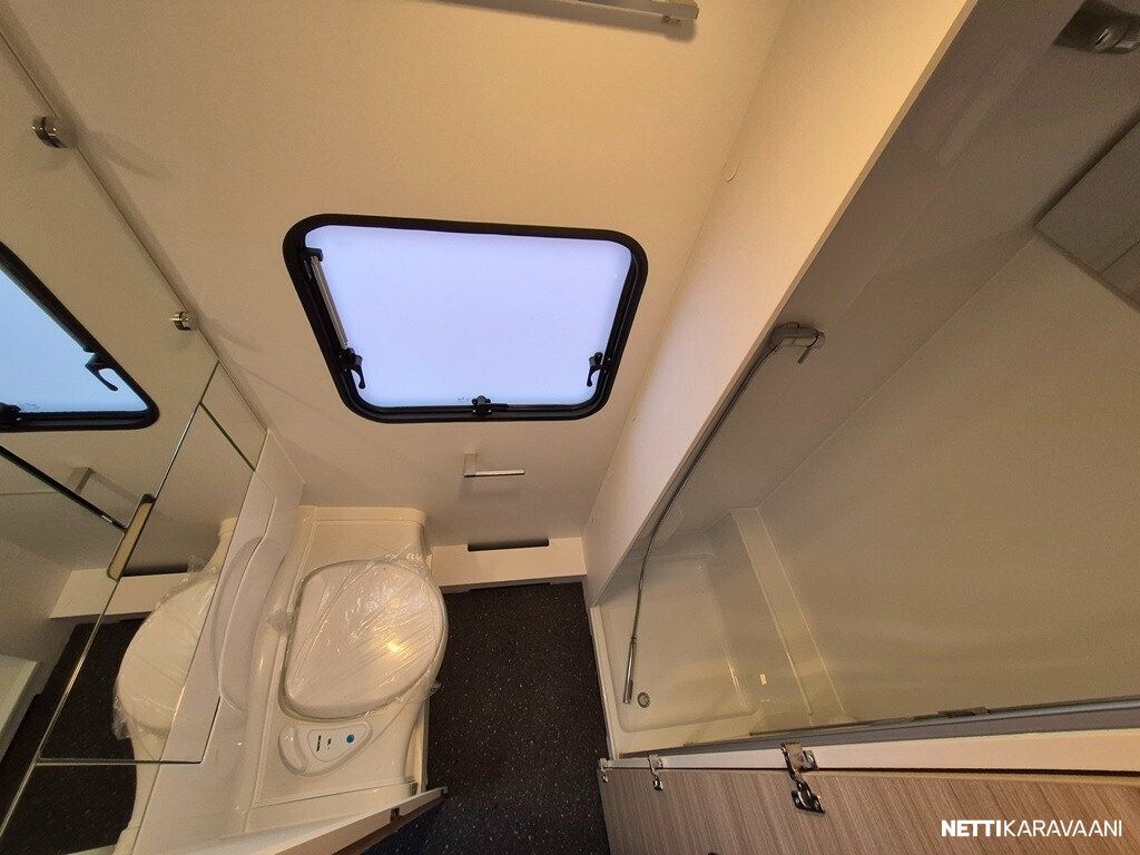 Jääkaappi, Kasetti WC, Kasettiverhot, Liesi, Lämminvesiboileri, Pakastelokero, Pesuallas, Sisätilanpistoke, Suihku, Erikoisvanteet, Kattoluukku, Lattialämmitys, Trumatic, Tukijalat