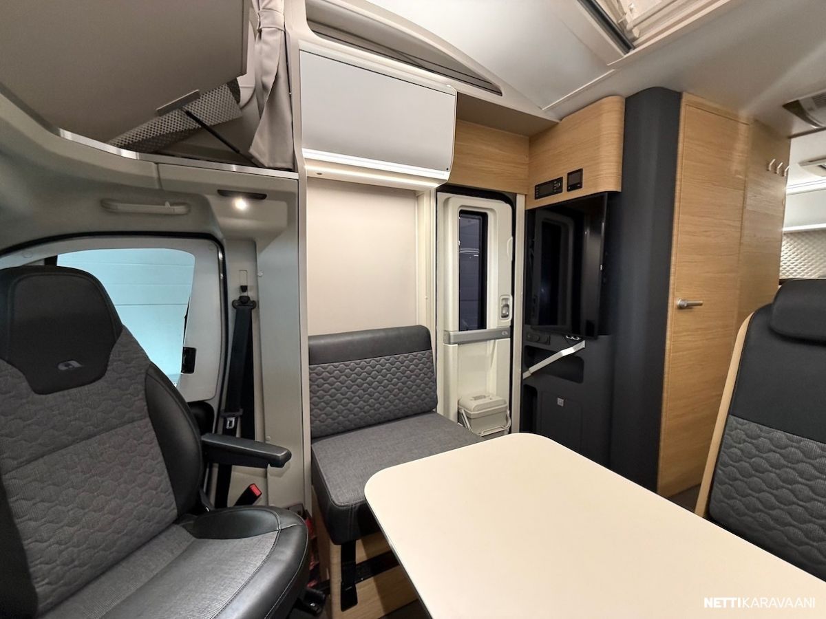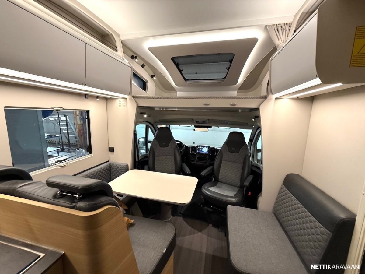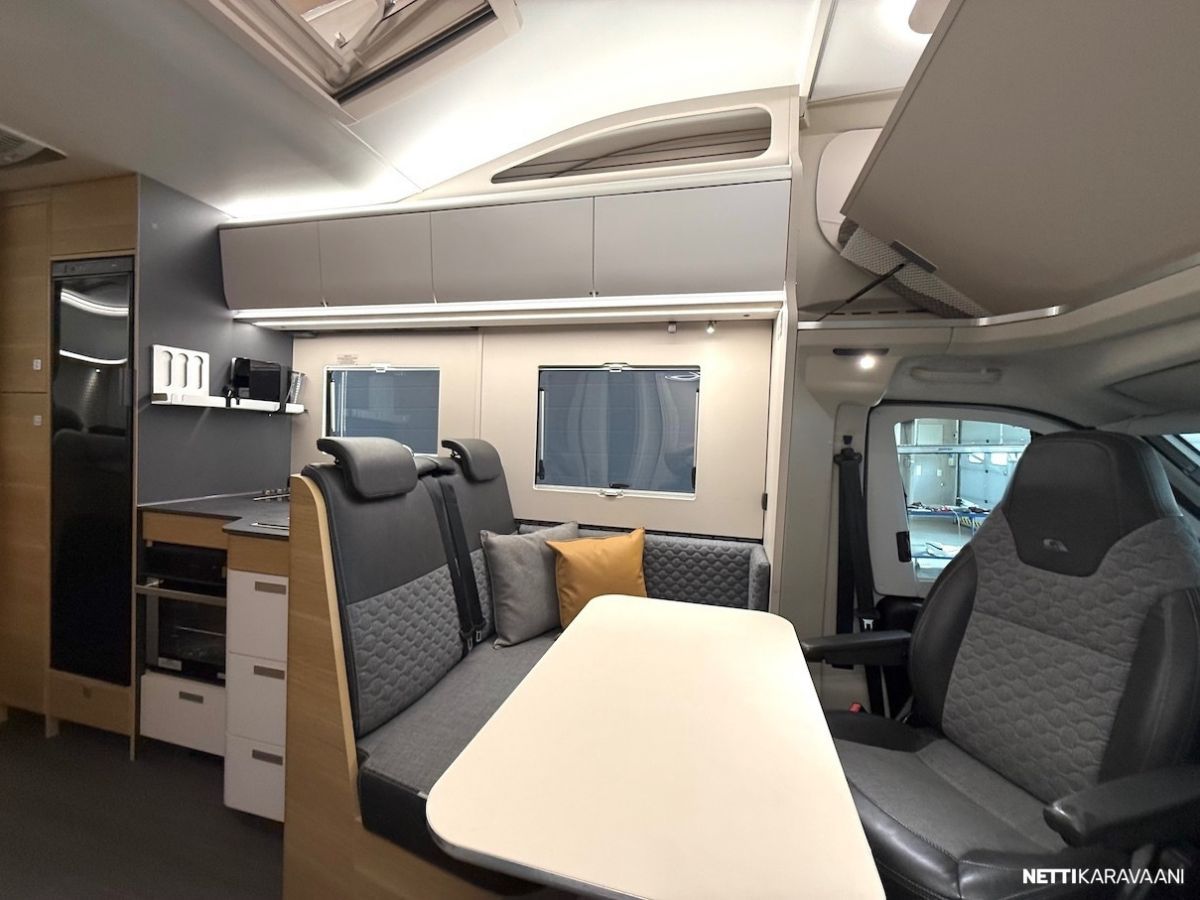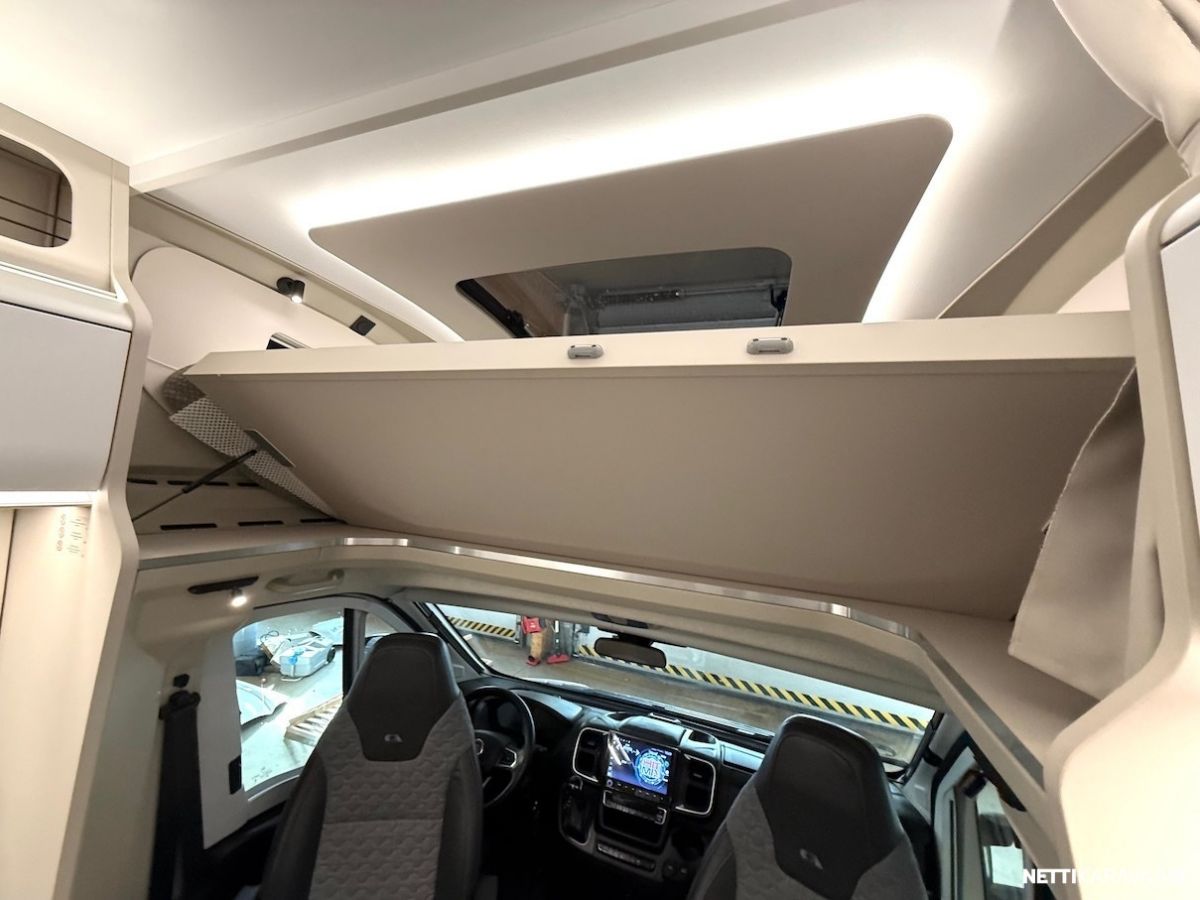 Nostovuoteellisista puoli-integroiduista malleista poiketen, ohjaamon päällä oleva, ylös käännettävä, lisävuode mahdollistaa todella tilavan oleskelutilan vaikka vuodetta käytetään.