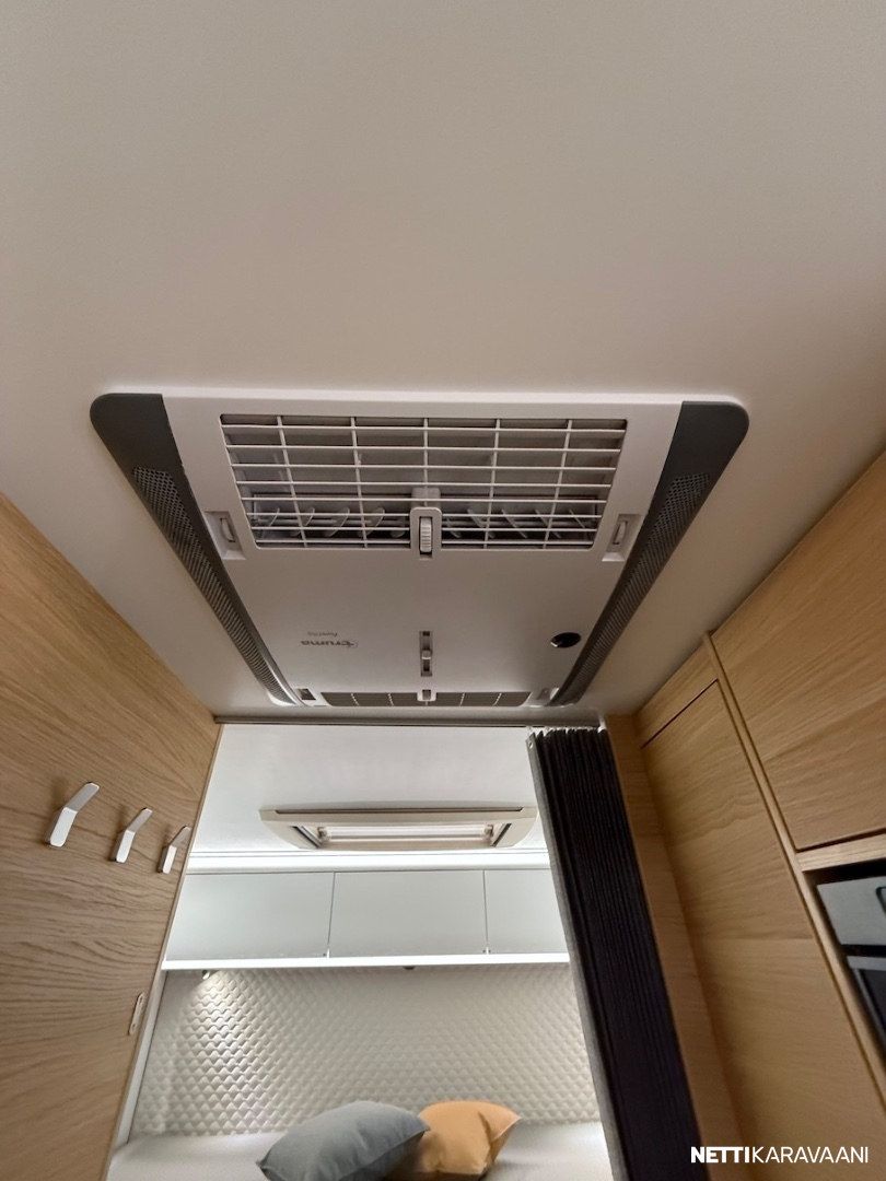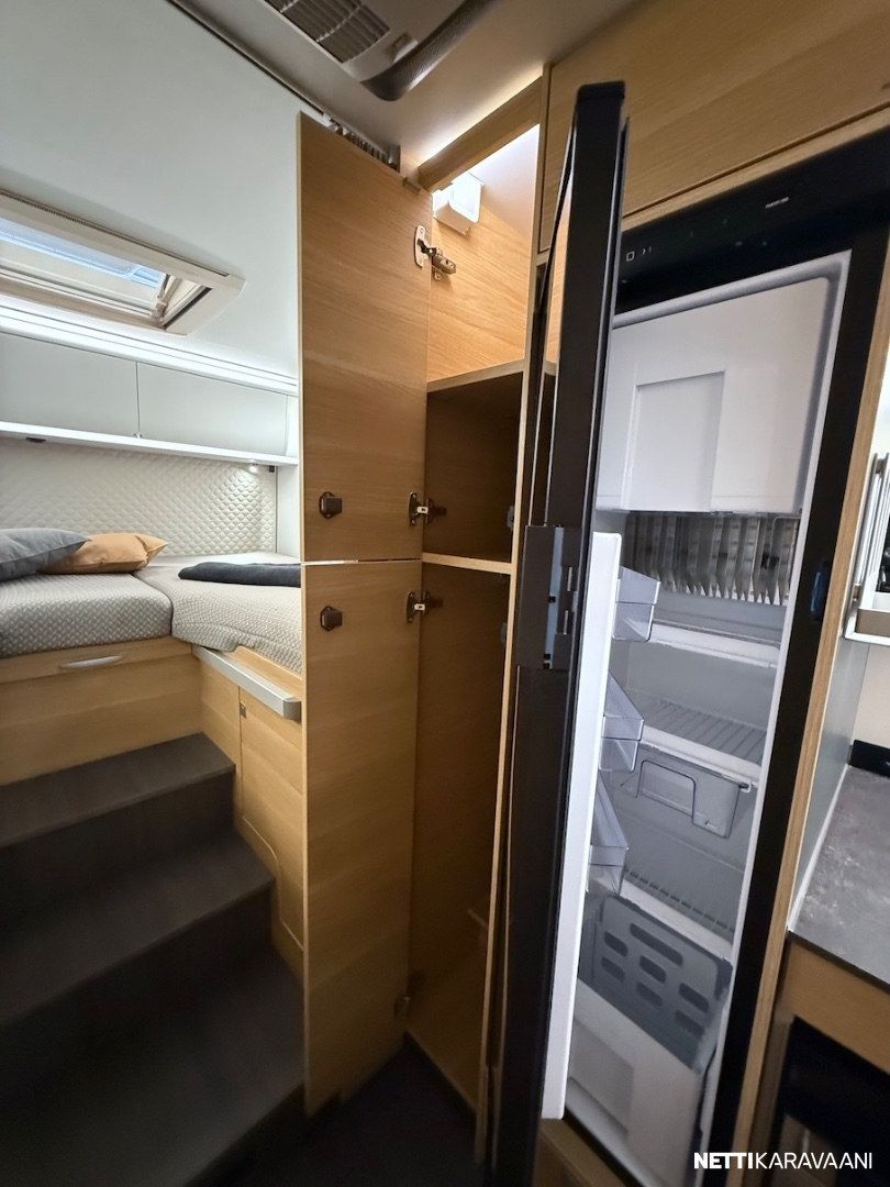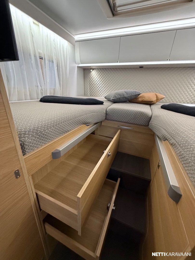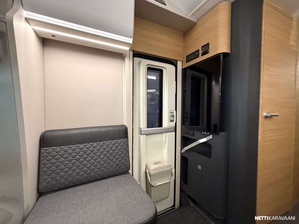 Nostovuoteellisista puoli-integroiduista malleista poiketen, ohjaamon päällä oleva, ylös käännettävä, lisävuode mahdollistaa todella tilavan oleskelutilan vaikka vuodetta käytetään.