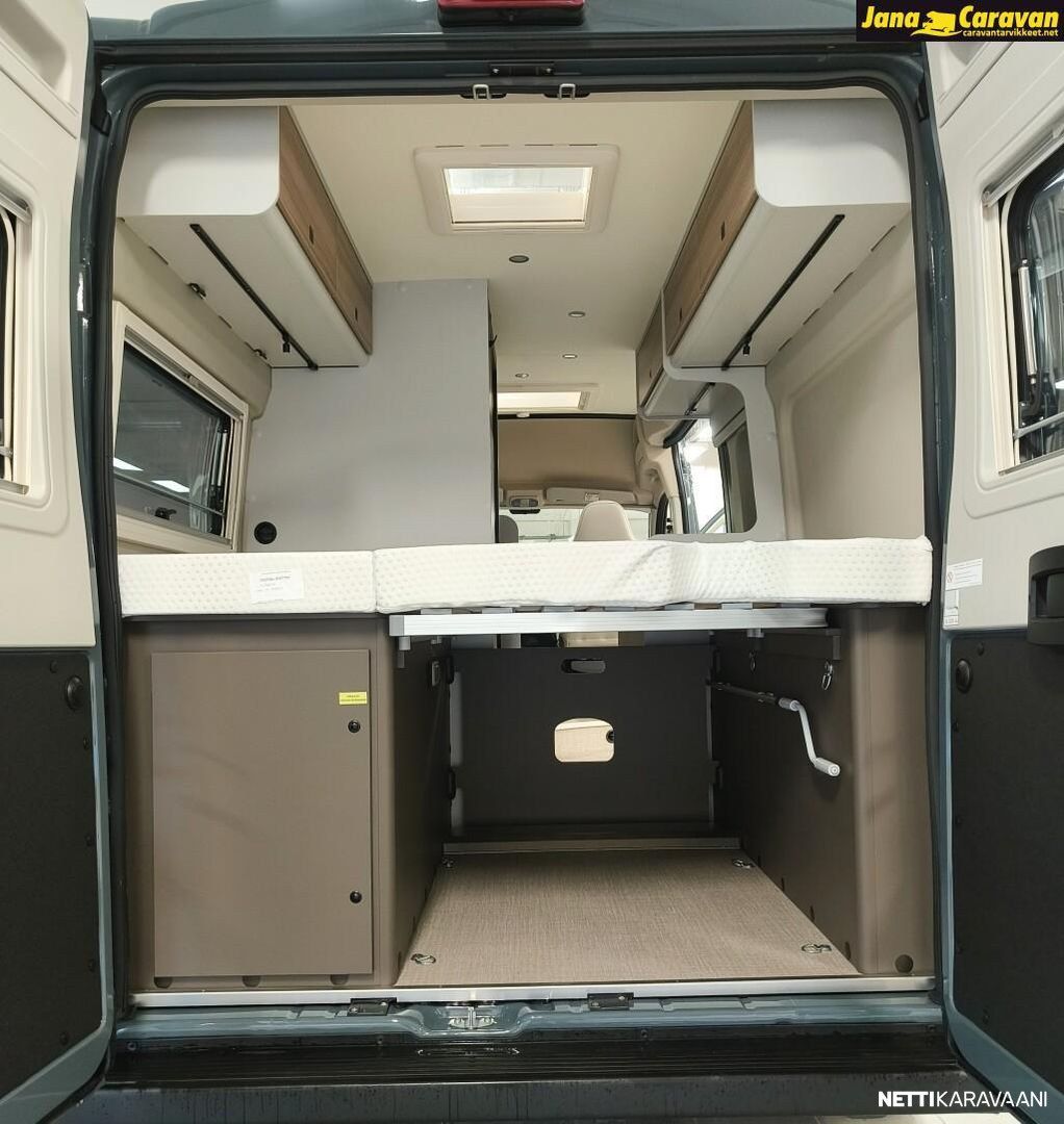 Takana parivuode, jonka alla iso tavaratila. Sängyn voi nostaa ylös, jolloin käytävän saa auki isojen tavaroiden kuljetusta varten.