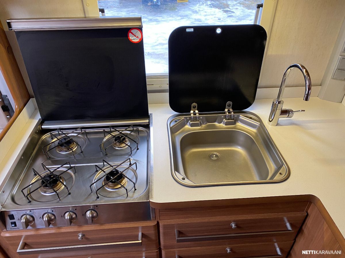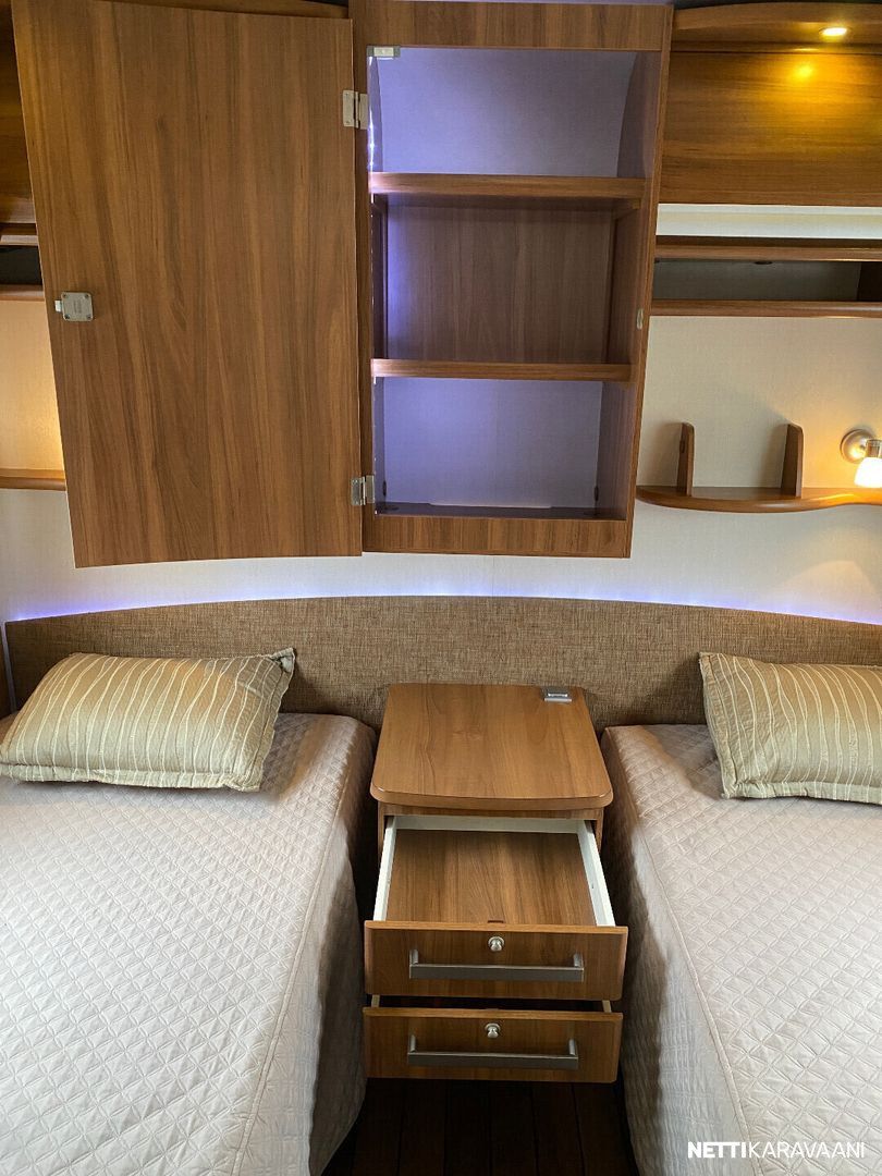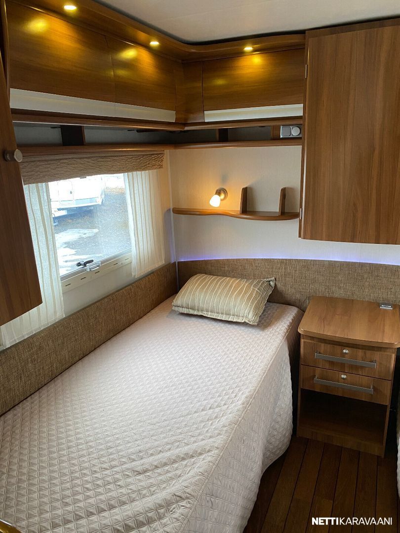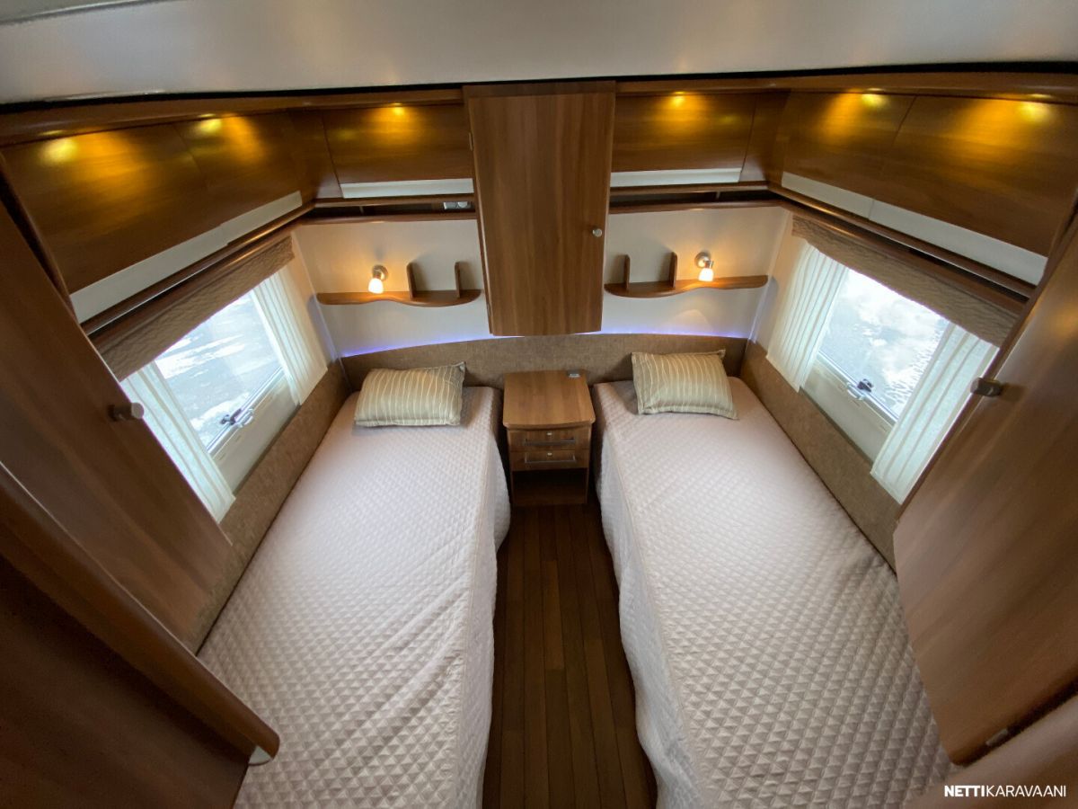 Erillisvuoteet, ATC-ajonvakautusjärjestelmä, Alde-nestekeskuslämmitys, nestekiertoinen lattialämmitys, sähköpatruuna, lämmin vesi, iso 2-ovi jää-/pakastinkaappi, liesituuletin, mikro-uuni, kiinteä raikasvesisäiliö, kiinteä harmaavesisäiliö, kasetti-wc, pyyhekuivain, kasettiverhot, kirkas kattoluukku, radio/cd, akku-/laturivarustus, sähkömittari, telttapalvelu, tv-antenni, tavaraluukku, suksiluukku, kitkavetopää, alu-vanteet, kaasupullo...