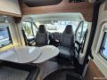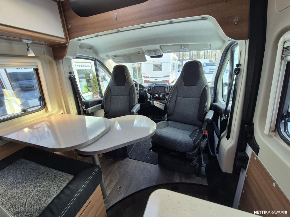 Etuosassa pöytäryhmä ja kääntyvät ohjaamon istuimet.