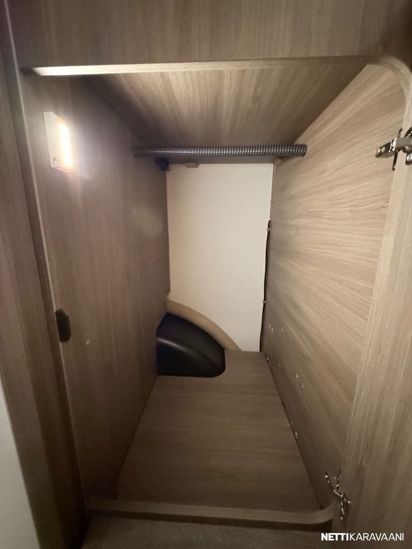 T448 -mallissa avara pohjaratkaisu jossa tavallista pidempi sivusohva ja nostovuode ei tuki uloskäyntiä. Kylppärissä todella näppärästi kääntyvä seinä mahdollistaa tarpeen tullen asiallisen suihkun.