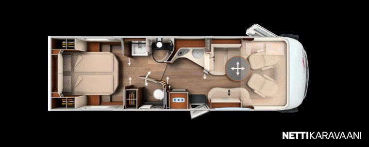 Vaihteisto: Automaatti Polttoaine: Diesel Vetotapa: Etuveto Leveys: 227 cm Pituus: 899 cm Matkustajat: 4 Kokonaismassa: 5 500 kg Oma massa: 4 428 kg Makuupaikat: 4 Ajokortti: C Lämmitys: Nestekiertoinen keskuslämmitys