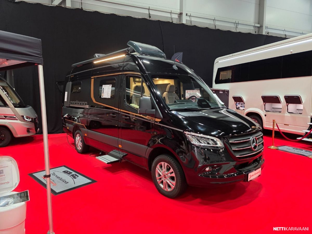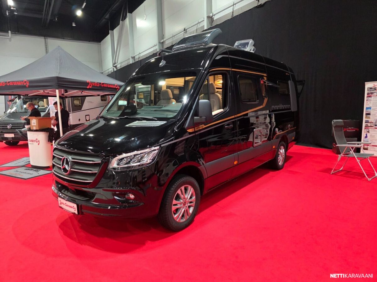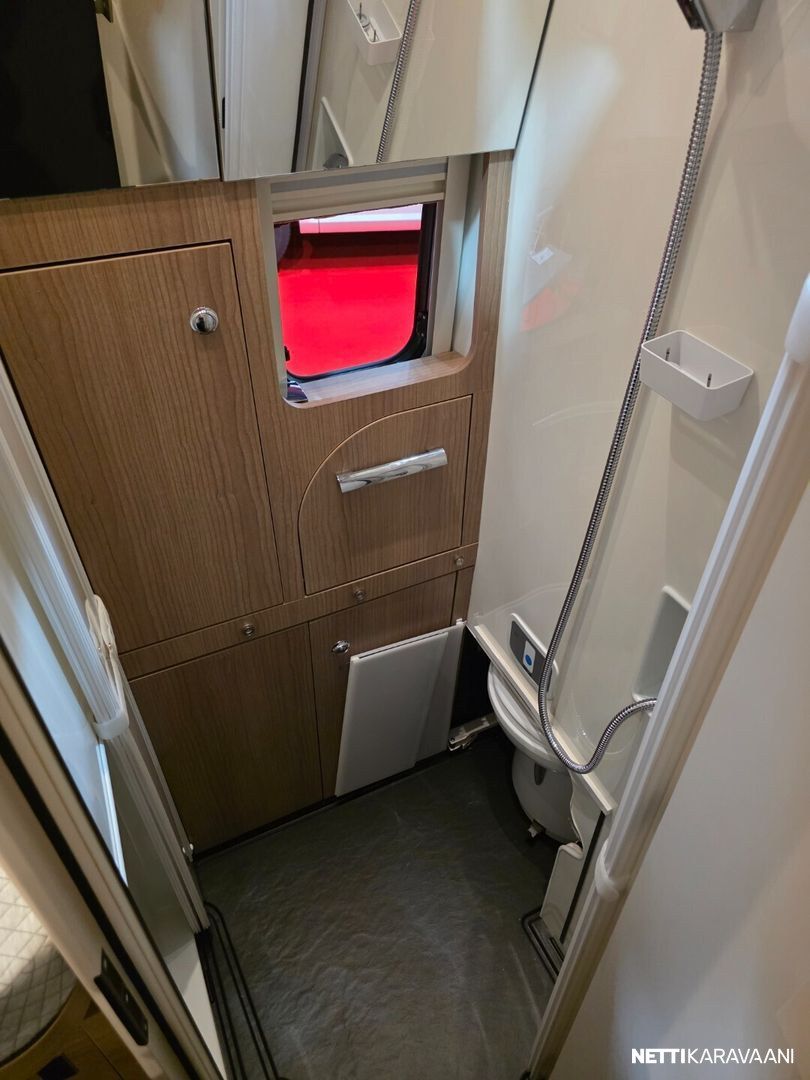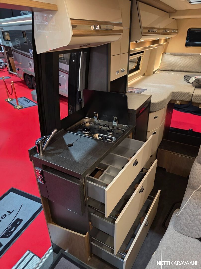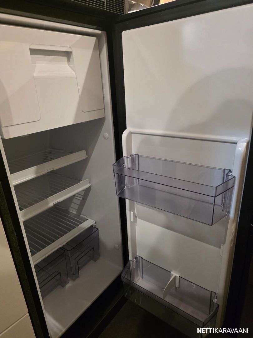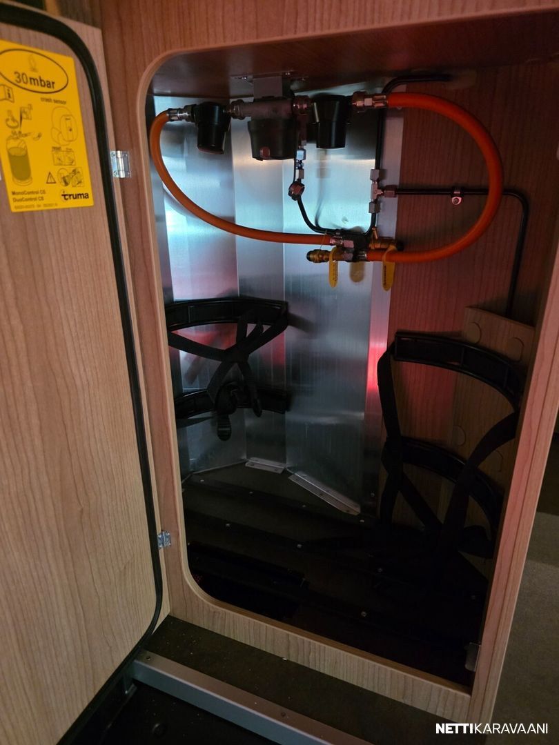-Asuinosan paketti (Truma digitaalinen ohjauspaneeli, hyttysverkko-ovi, kattoverhoilu mikrokuitua, raikasvesi- ja harmaavesisäiliö eristetty, raikasvesisäiliö myös lämmitetty, keittiön pöytätason jatko ja kermanvärisen vetolaatikot), epäsuora LED-valaistus asuinosassa, laadukkaat kylmävaahtopatjat takavuoteissa)
