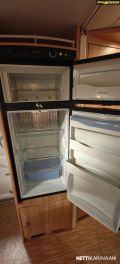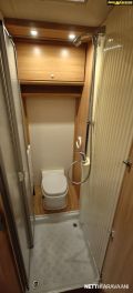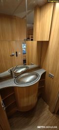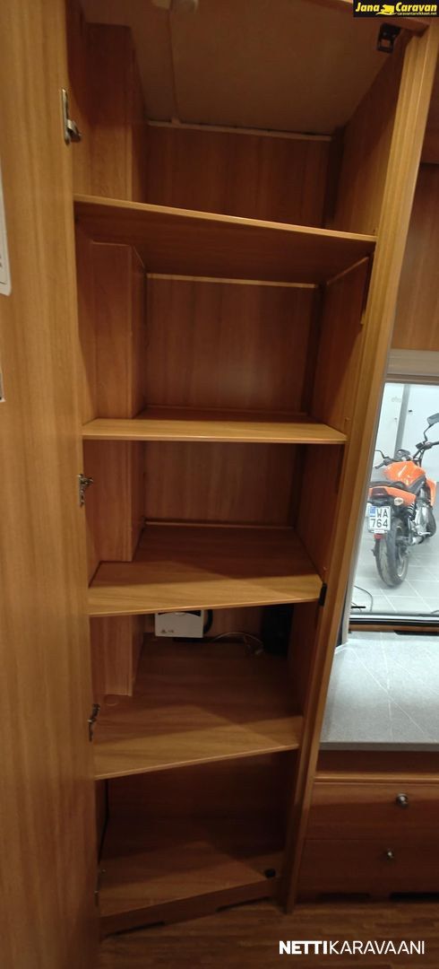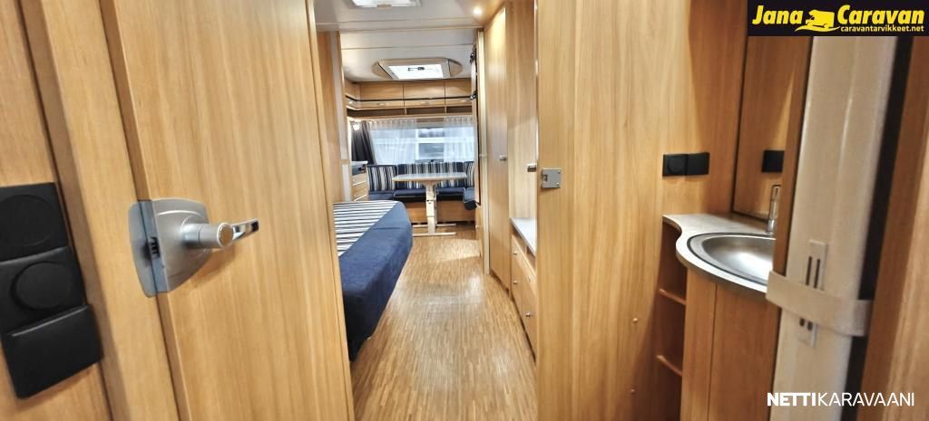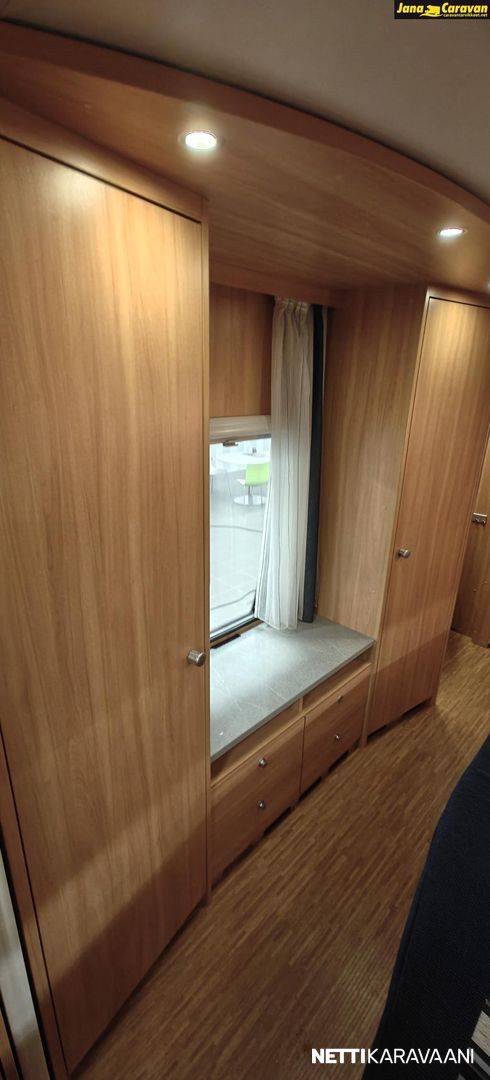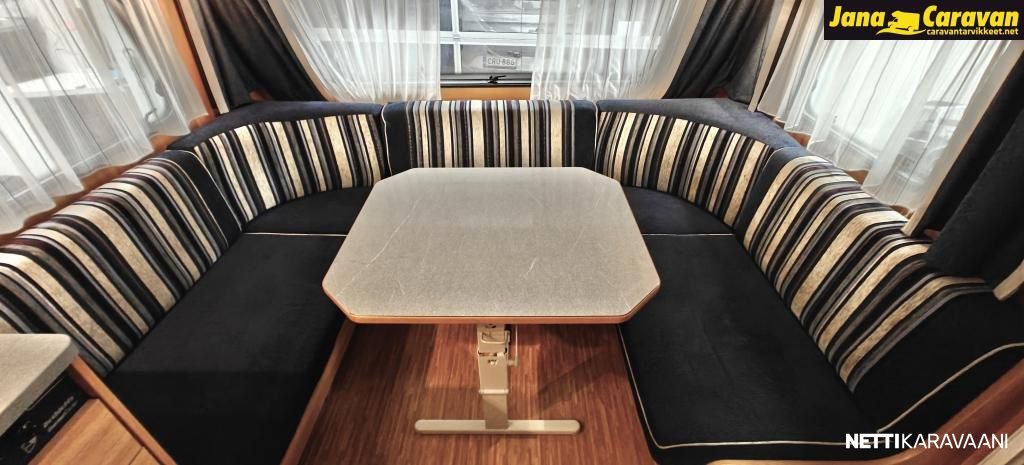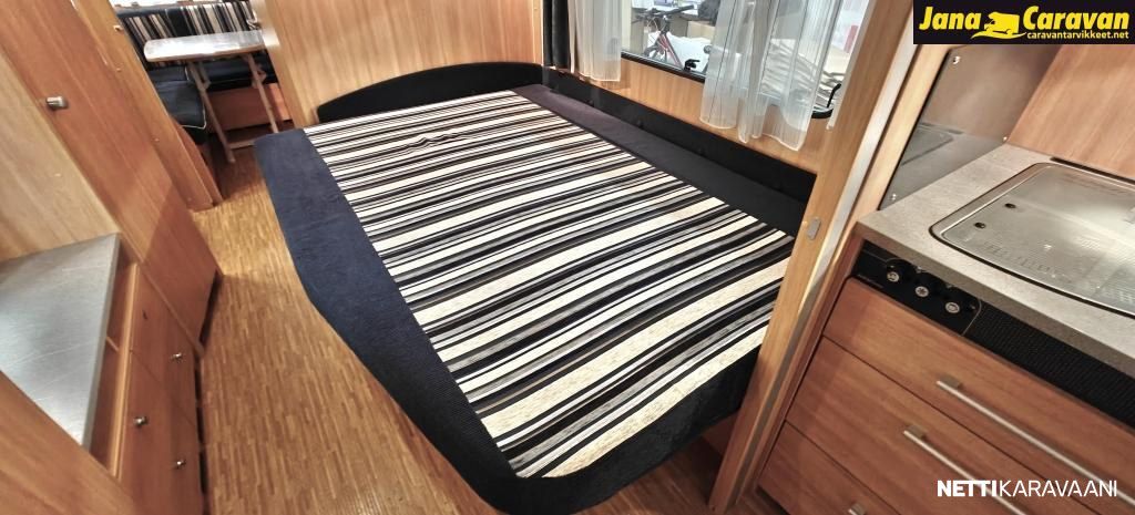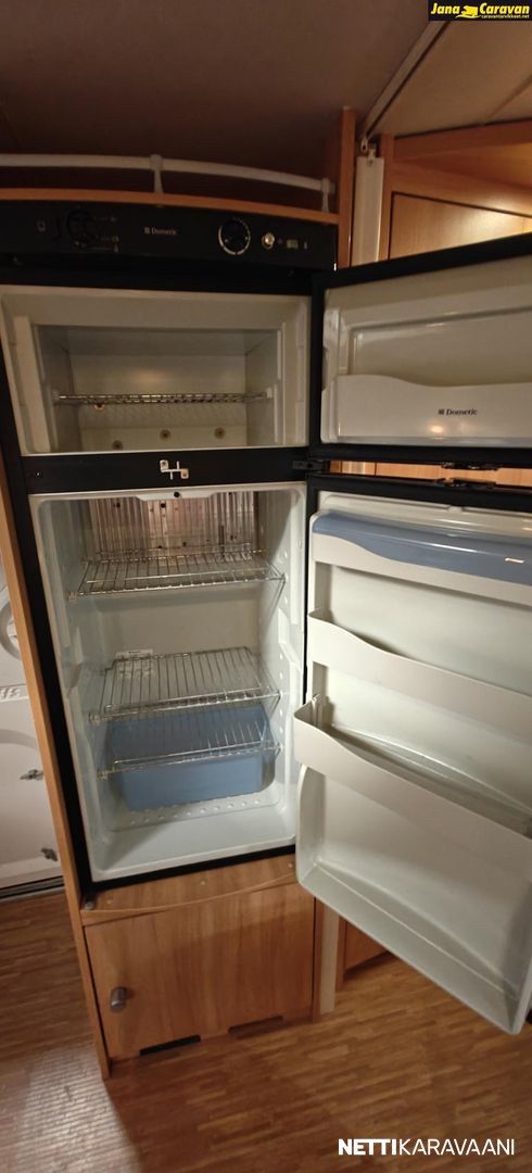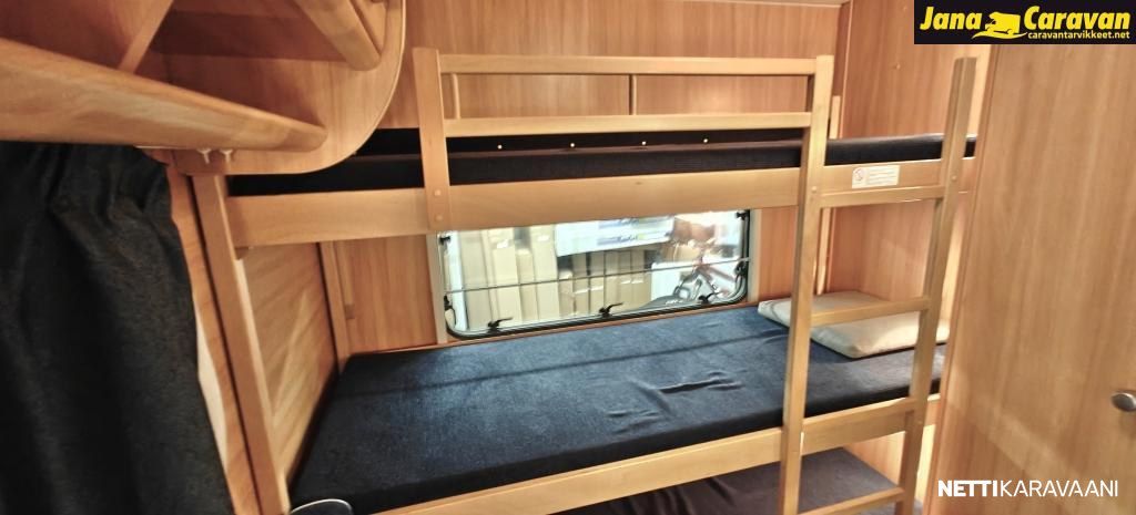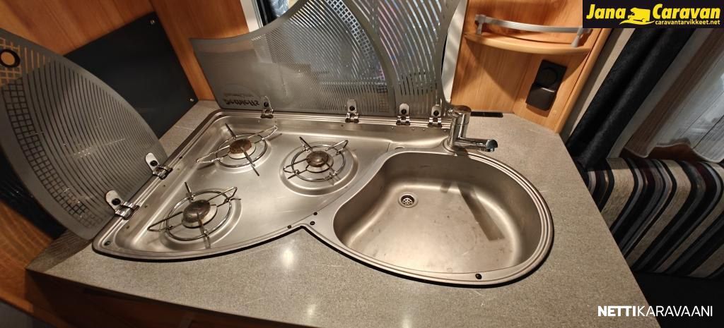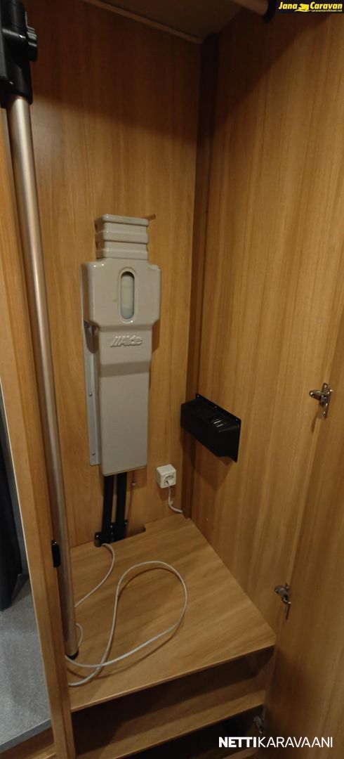 Kattoluukku, Kasetti WC, Suihku, Lämminvesiboileri, Liesi, Jääkaappi, Pakastelokero, Kasettiverhot, Tukijalat, Lattiamatot asunto-osassa, Pesuallas, Lattialämmitys, Sähköpatruuna, Alde