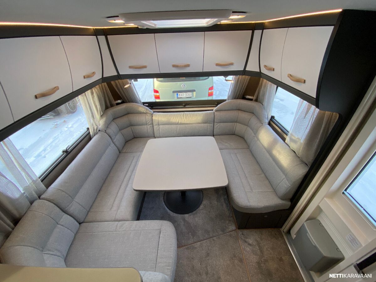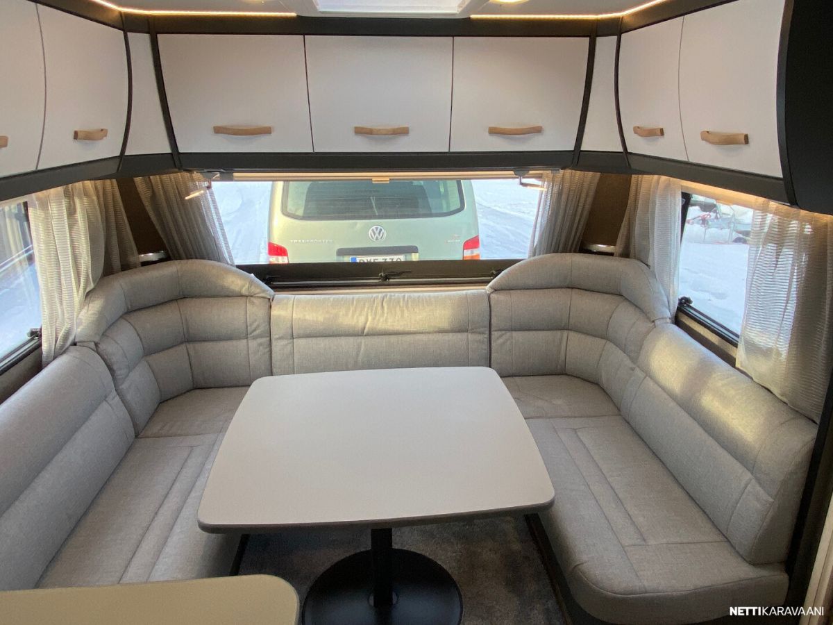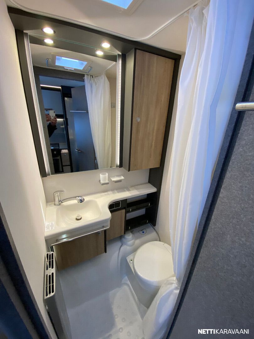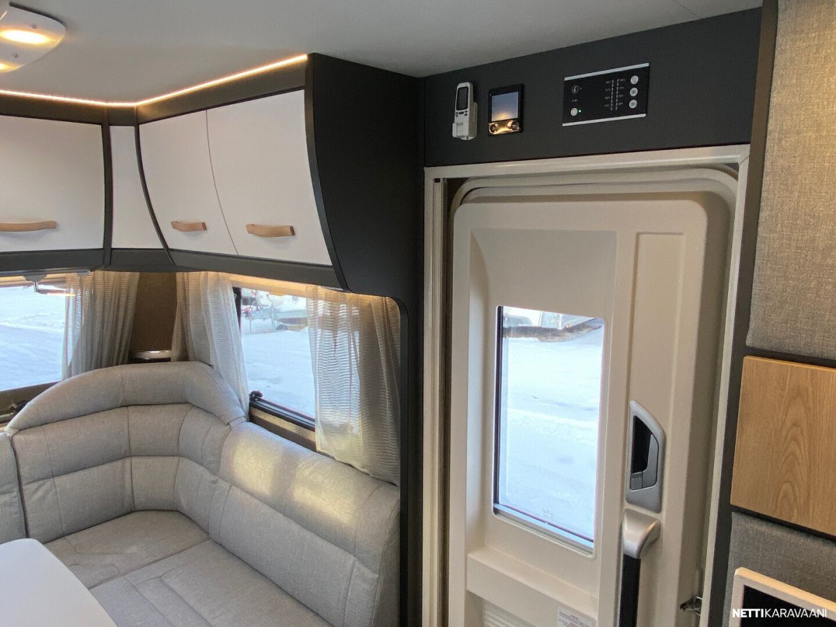 Ilmastointi kaukosäädöllä, Alde-nestekeskuslämmitys, nestekiertoinen lattialämmitys, sähköpatruuna, lämmin vesi, bidesuihku, liesi uuni, liesituuletin, iso jääkaappi/pakastin, kiinteä raikasvesisäiliö, kiinteä harmaavesisäiliö, niskatyynyt istuinruhmässä, mattosarja, kasetti-wc, kasettiverhot, akku-/ laturivarustus, tv-antenni, tv-teline, tavaraluukku, kitkavetopää, hyttysovi, alu-vanteet, automaattinen kaasupullonvaihtaja, kaasun-ulosotto sivuseinässä, Thule Omnistor kotelomarkiisi, kaasupullo...