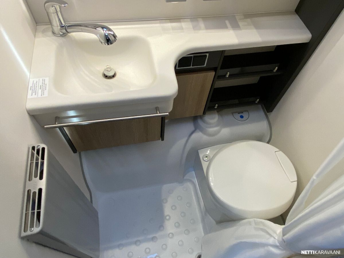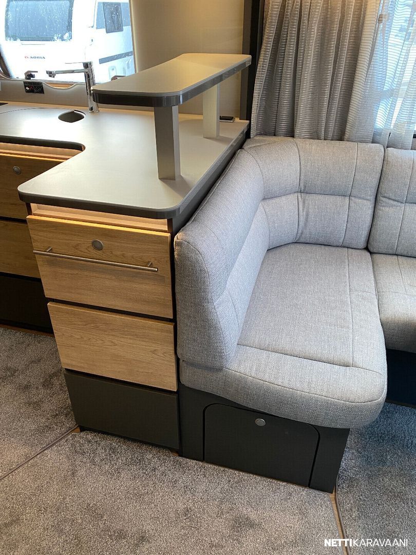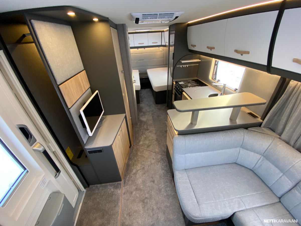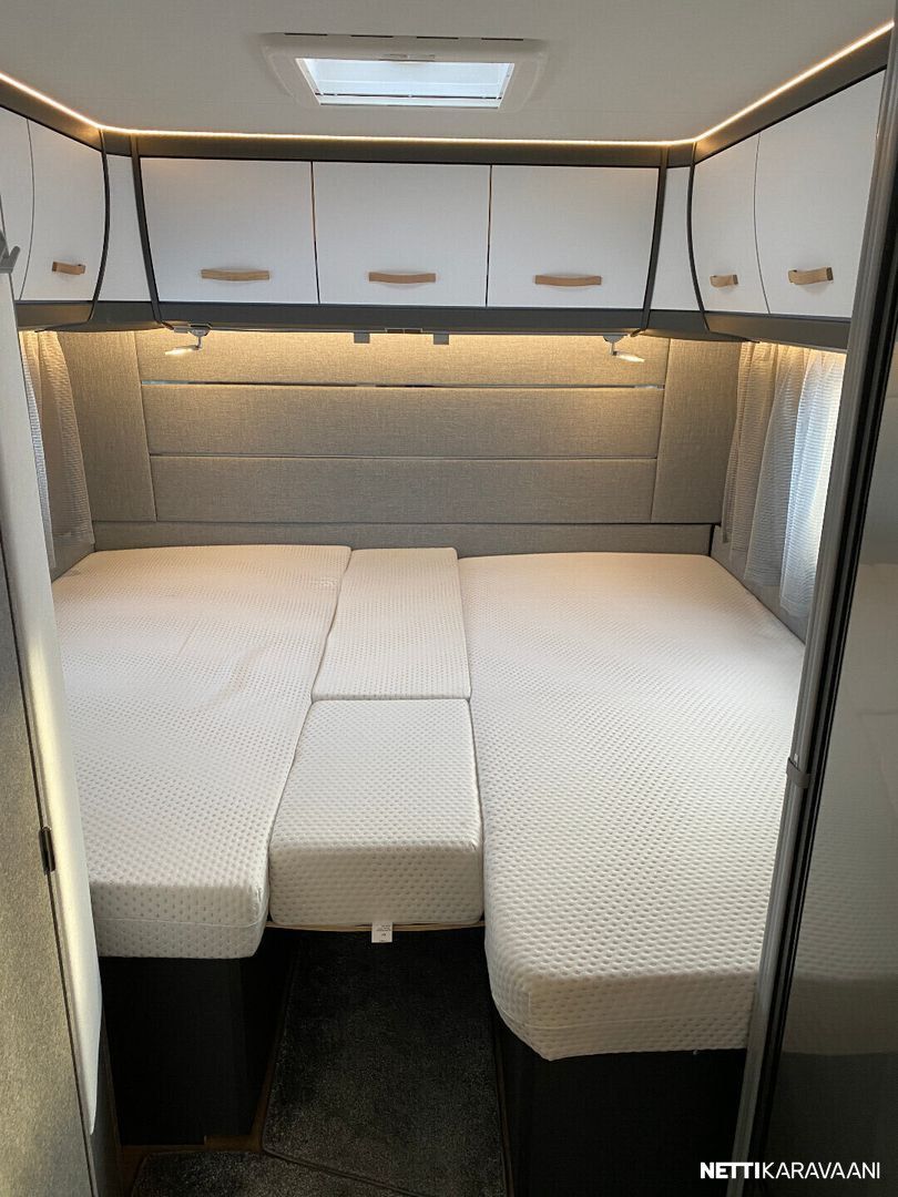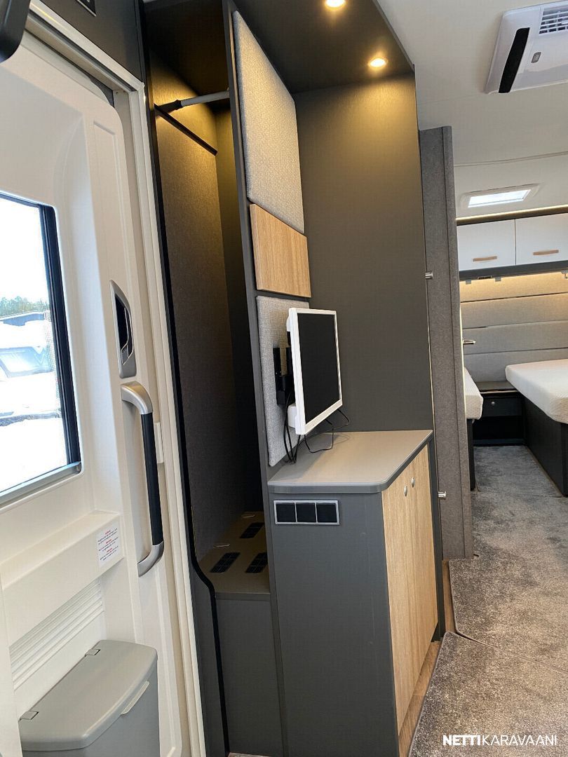 Ilmastointi kaukosäädöllä, Alde-nestekeskuslämmitys, nestekiertoinen lattialämmitys, sähköpatruuna, lämmin vesi, bidesuihku, liesi uuni, liesituuletin, iso jääkaappi/pakastin, kiinteä raikasvesisäiliö, kiinteä harmaavesisäiliö, niskatyynyt istuinruhmässä, mattosarja, kasetti-wc, kasettiverhot, akku-/ laturivarustus, tv-antenni, tv-teline, tavaraluukku, kitkavetopää, hyttysovi, alu-vanteet, automaattinen kaasupullonvaihtaja, kaasun-ulosotto sivuseinässä, Thule Omnistor kotelomarkiisi, kaasupullo...