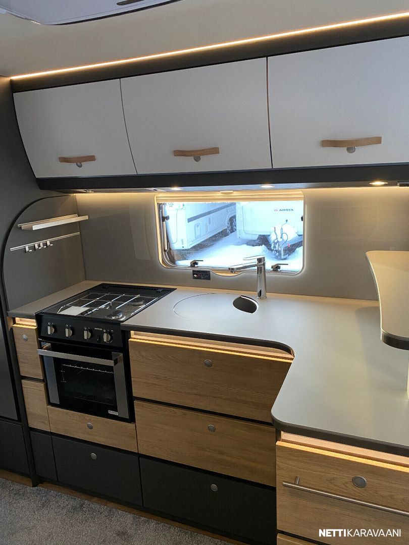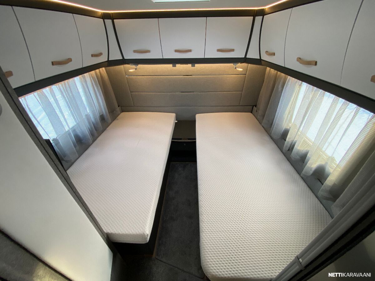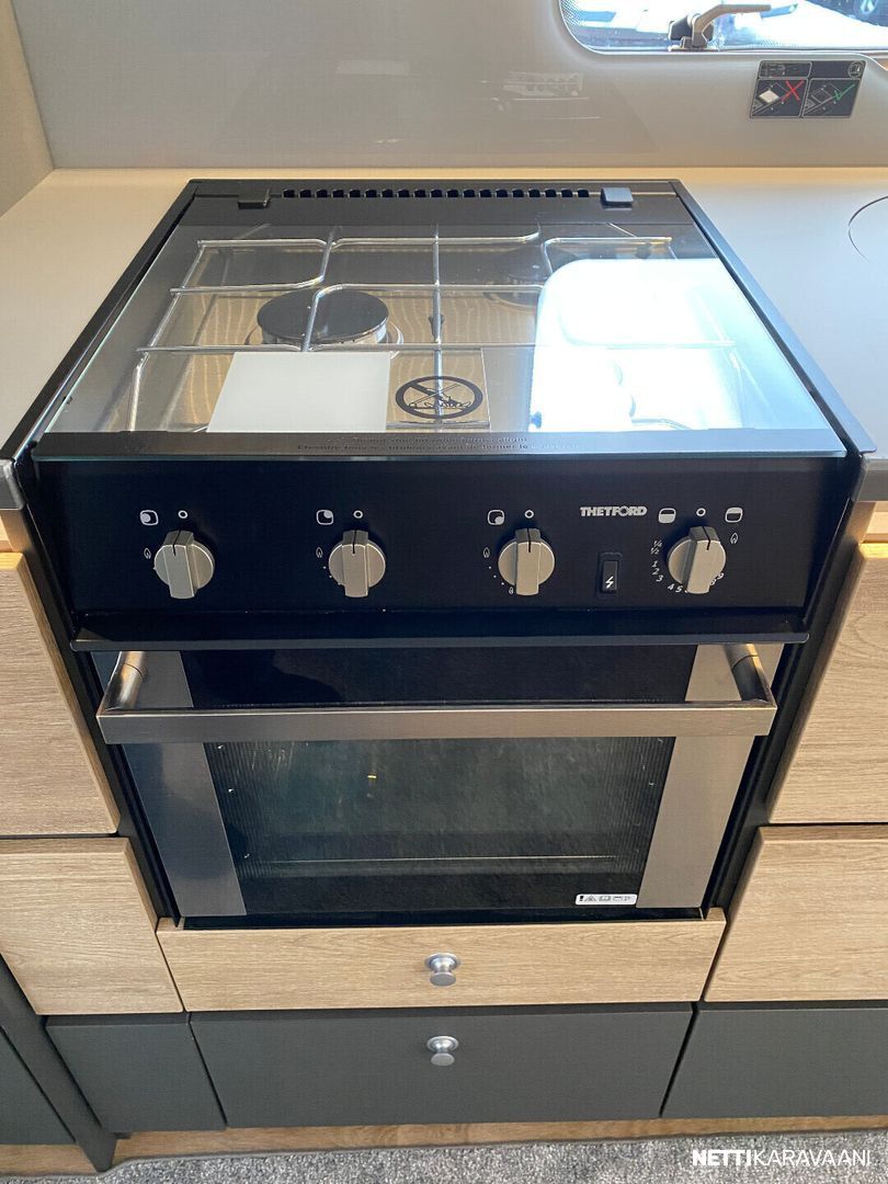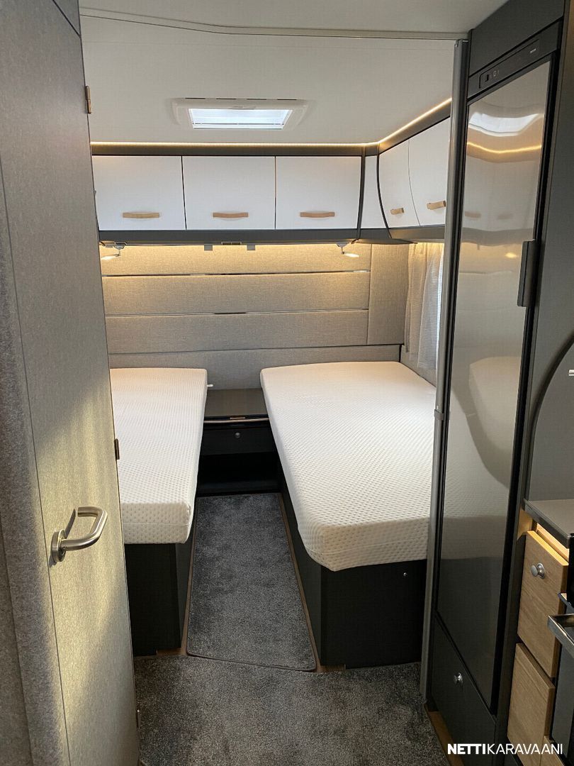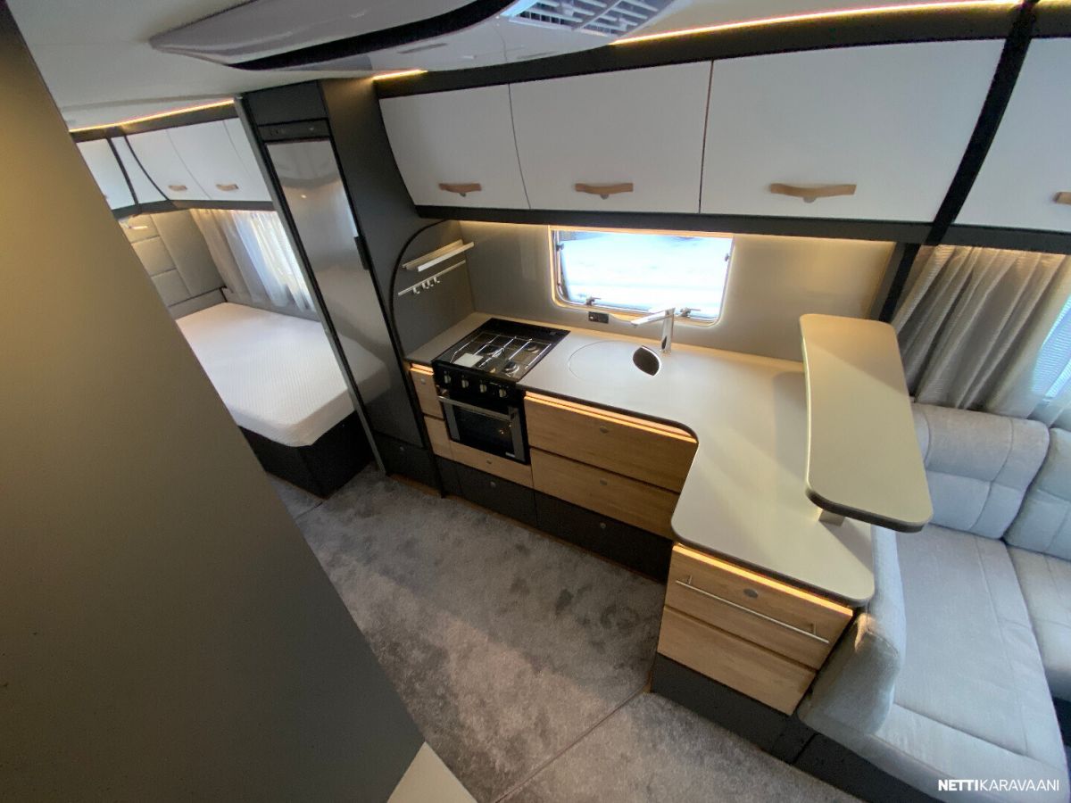 Ilmastointi kaukosäädöllä, Alde-nestekeskuslämmitys, nestekiertoinen lattialämmitys, sähköpatruuna, lämmin vesi, bidesuihku, liesi uuni, liesituuletin, iso jääkaappi/pakastin, kiinteä raikasvesisäiliö, kiinteä harmaavesisäiliö, niskatyynyt istuinruhmässä, mattosarja, kasetti-wc, kasettiverhot, akku-/ laturivarustus, tv-antenni, tv-teline, tavaraluukku, kitkavetopää, hyttysovi, alu-vanteet, automaattinen kaasupullonvaihtaja, kaasun-ulosotto sivuseinässä, Thule Omnistor kotelomarkiisi, kaasupullo...