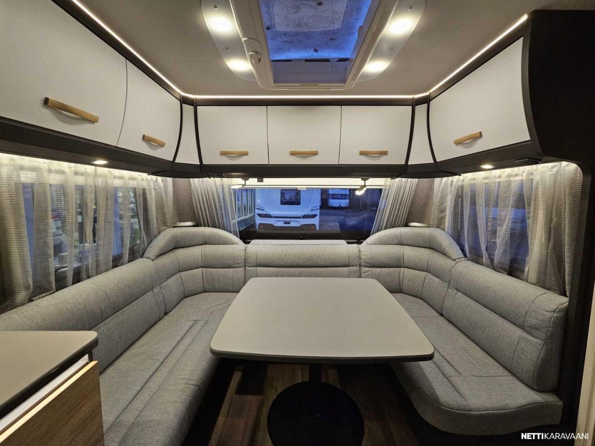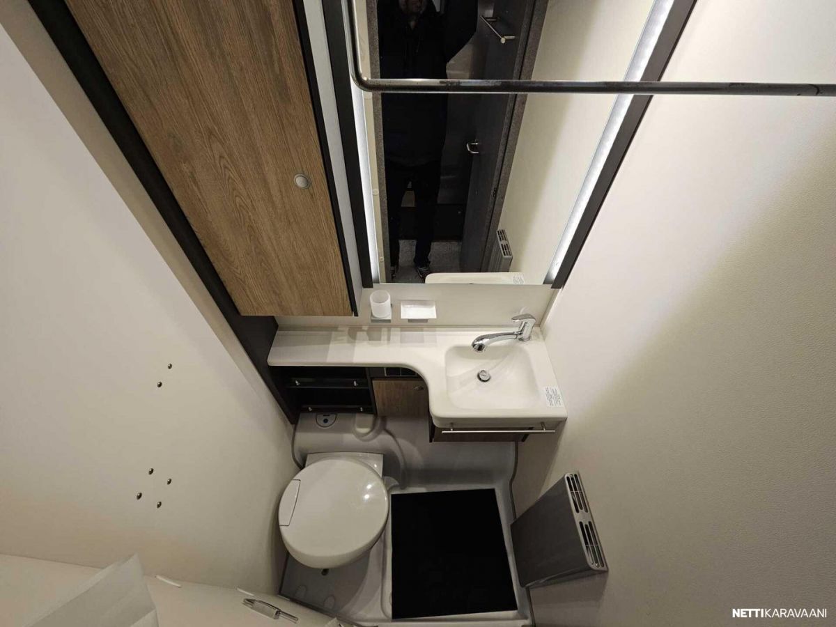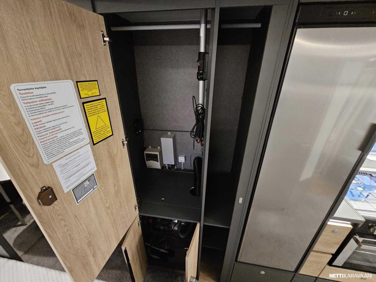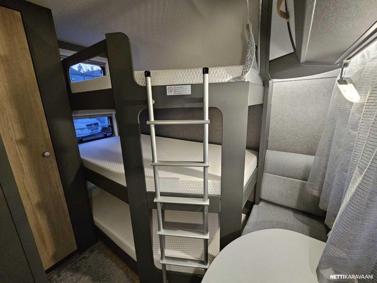 Kattoluukku, Kasetti WC, Lämminvesiboileri, Liesi, Jääkaappi, Pakastelokero, Kaasu-uuni, Eristetty harmaavesisäiliö, Kasettiverhot, Tukijalat, Lattiamatot asunto-osassa, Pesuallas, Lattialämmitys, Sähköpatruuna, Alde, Ilmastointi: Manuaalinen