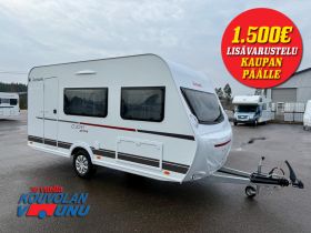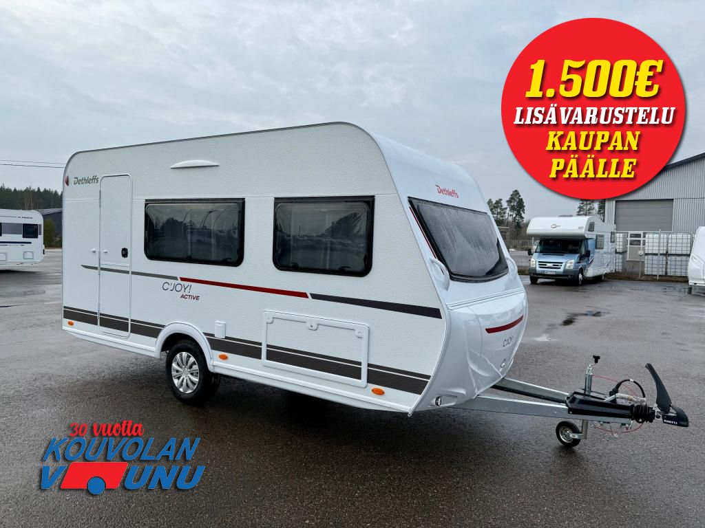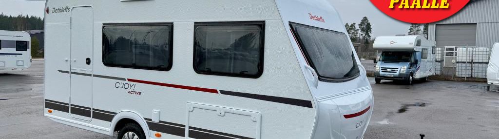 TÄHÄN VAUNUUN 1.500E LISÄVARUSTELU KAUPAN PÄÄLLE. TARJOUS VOIMASSA 30.04.2026 ASTI, C’joy sopii täydellisesti perheen ensimmäiseksi matkailuvaunuksi sekä hintatietoisille campinglomailijoille. Erityisesti ACTIVE-versiona se on todellinen löytö! 420QSH:ssa on tilava parivuode poikittain edessä onka alle jää tilava tavararila suurella luukulla varustettuna puutarhakalusteille tai harrastusvälineille. Istuinryhmästä saa lisävuoteen jopa kahdelle pienemmälle., Perusvaunu: 23.290eur, Tässä vaunussa lisävarusteet:, Active-paketti Erikoishintaan 1€ (OVH 1 315€): (Truma Therme lämminvesijärjestelmä - Raikasvesisäiliö 44l - Kitkavetopää, Hyttysverkko-ovi - Tavaraluukku oikealla edessä 1000 x 420mm - Valokiskoon kiinnitettävä USB-pistorasia - Kattoikkuna 700 x 500mm - Etuikkuna - Alustan kantavuus 1 350kg), Perusvaunu: 23.290eur, Vapaana-paketti 1 (sis. AGM Akku 95Ah - Laturi - 12V pääkatkaisija - Jännitteen näyttö - 12V puhallin lämmittimeen) 1.305eur, Kapan-verhoilu, Jääkaappi, Kasetti WC, Kattoluukku, Keskuslämmitys, Liesi, Lämminvesiboileri, Pakastelokero, Takakeittiö, Trumatic