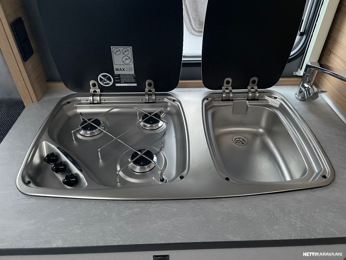Jääkaappi, Kasetti WC, Kasettiverhot, Lattiamatot asunto-osassa, Liesi, Lämminvesiboileri, Pakastelokero, Pesuallas, Alde, Erikoisvanteet, Lattialämmitys, Sähköpatruuna, Tukijalat