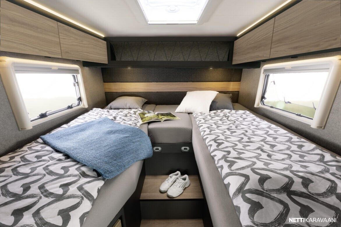 Tämän auton erillisvuoteet 15 cm paksuilla EvoPore-patjoilla tarjoavat erinomaisen nukkumismukavuuden ja tarjoavatkin todella maittavat unet.