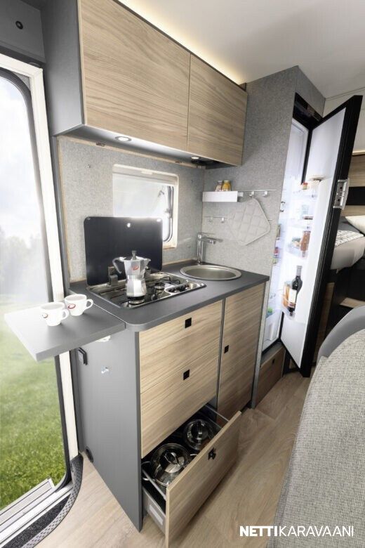 Sisätilat tuntuvat tilavilta ja kutsuvilta. Korkealaatuinen eristys ja vakiovarusteinen 6kw:n diesellämmitin pitävät sisätilat lämpiminä ja viihtyisinä – jopa kovilla pakkasilla.