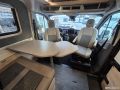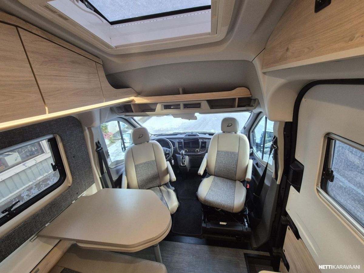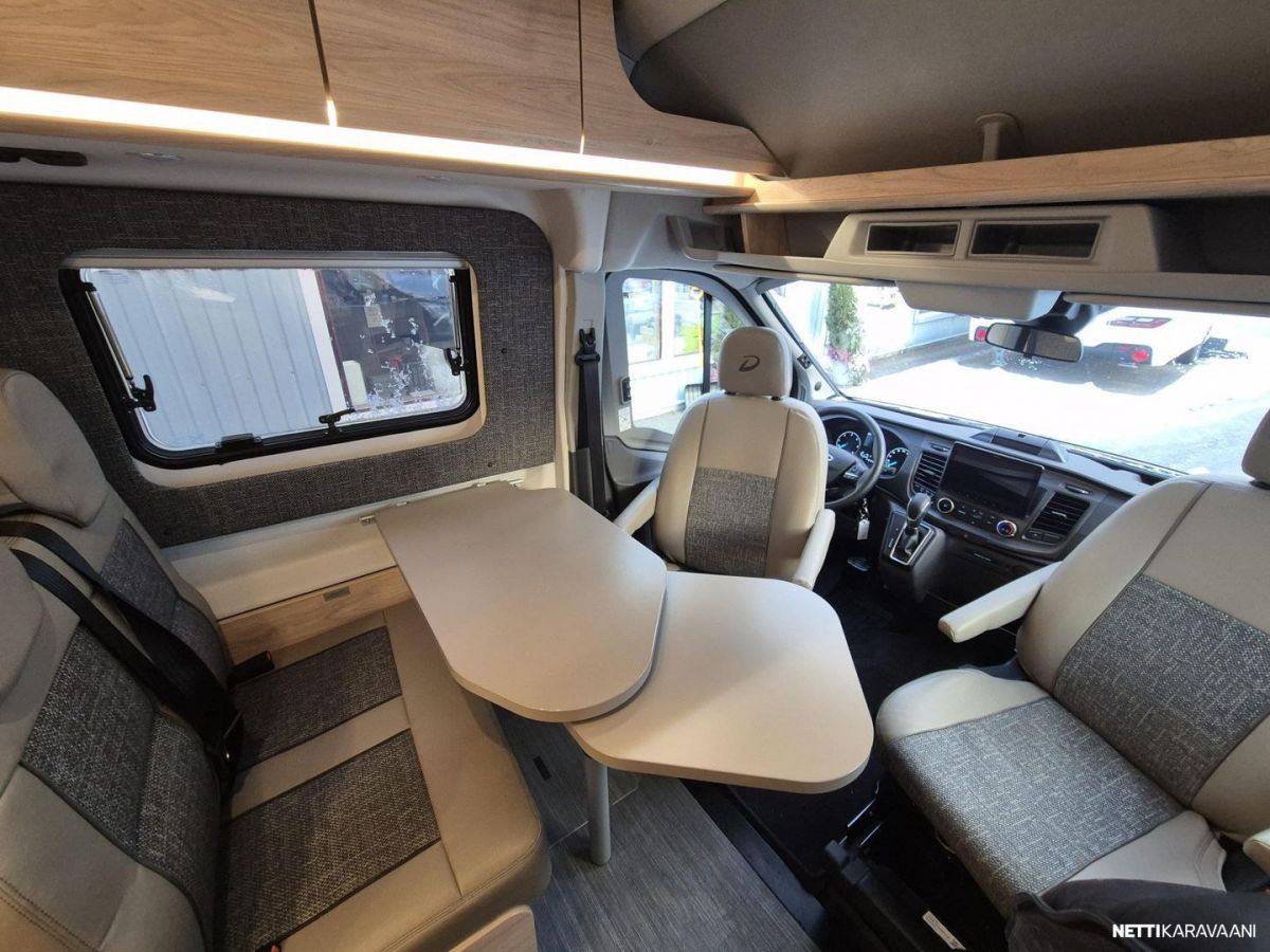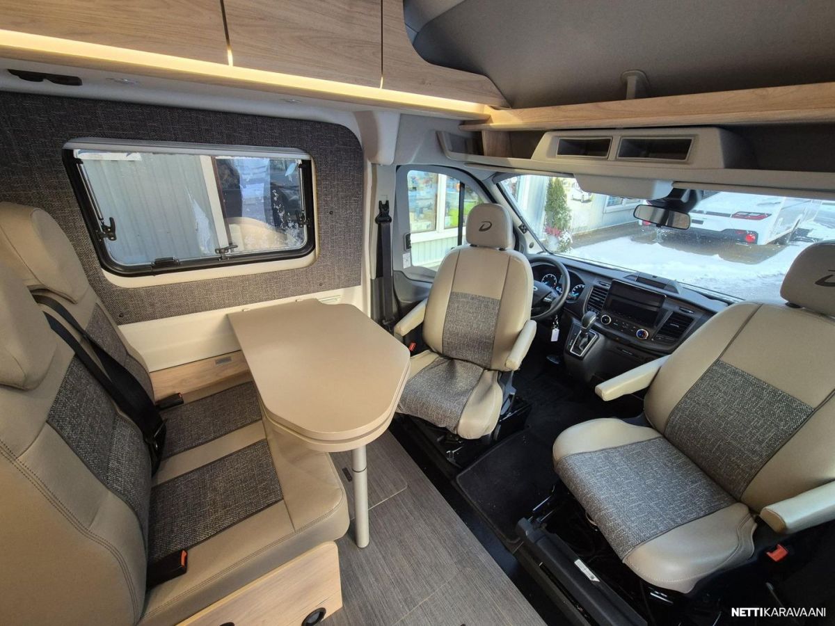 Etuosassa pöytäryhmä ja kääntyvät ohjaamon istuimet.