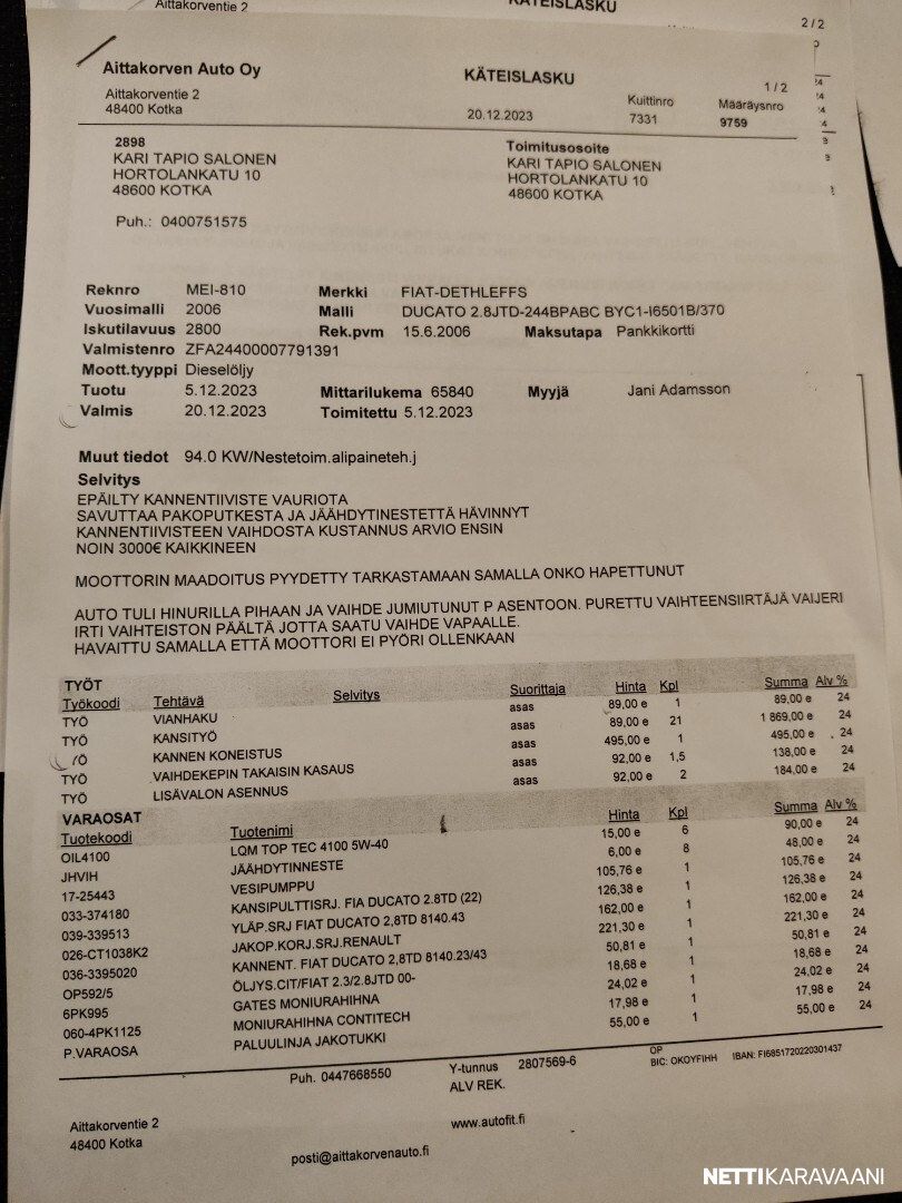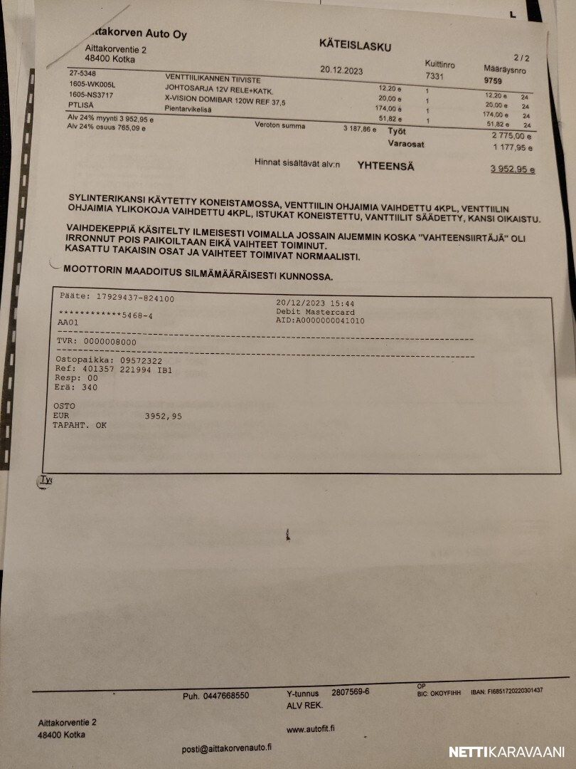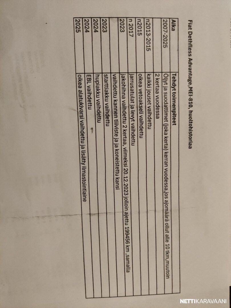 Automaatti Alden nestekeskuslämmitys kaasulla ja sähköllä Peruutus kamera Markiisi Ikkuna peite 2x renkaat omilla vanteillaan Kesärenkaat alumiini vanteilla Polkupyörä teline Katto kaiteet ja tikkaat Korkea jääkaappi ja erillinen pakastin Lämmin vesi Suihku Mikro Alas laskettava lisävuode ohjaamon päälle Hyvä huolto historia Ollut samalla omistajalla vuodesta 2007 Katsastettu 27.8.2025 Seuraava katsastus 7.9.2026