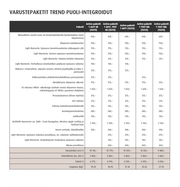TULOSSA MAALISKUUSSA 2026, Uudistunut Trend-malli todella kattavalla Active-varustelulla! Active-paketissa tulee mukana mm. Ikkunallinen asunto-osan ovi keskuslukituksella, Ohjaamon kaihdinverhot, Light Moments epäsuora valaistus, Erillisvuoteiden yhdistämismahdollisuus, Metallimusta ohjaamon väri, Gt advance ulkoväritys, Multimediasoitin peruutuskameralla sis. Apple Carplay ja Android Auto, Heron puolinahkaverhoilu, ikkuna pesutilassa, Auto perusvarusteilla: 96.690eur, Fiat 140hv 8-vaihteisella automaattivaihteistolla 3.670eur, Active-paketti Trend 3.860eur , Sähköinen laskuvuode kahdelle 2.095eur, Alde nestekeskuslämmitys (kaasu/sähkö) 3.305eur, Nestekiertoinen lattialämmitys 1.295eur, Ohjaamon nestekiertoinen lämmitysmatto 995eur, Eristetty harmaavesisäiliö 215eur, Heron-verhoilu, Alde, Eristetty harmaavesisäiliö, Kasettiverhot, Keskuslämmitys, Lattialämmitys, Nestekiertolämmitys, Suihku, Sähköpatruuna, Vak.nopeudensäädin