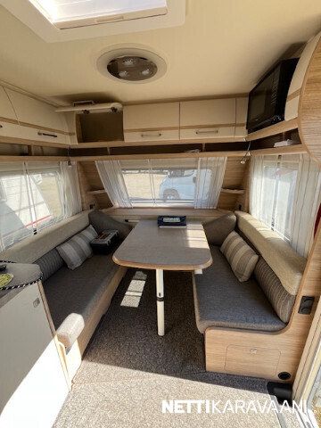 Jääkaappi, Kasetti WC, Kasettiverhot, Lattiamatot asunto-osassa, Liesi, Lämminvesiboileri, Markiisi, Mikroaaltouuni, Pakastelokero, Pesuallas, Sisätilanpistoke, TV-antenni tai lautasantenni, Eristetty harmaavesisäiliö, Huoltokirja, Kattoluukku, Lattialämmitys, Trumatic, Tukijalat