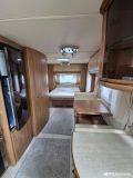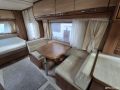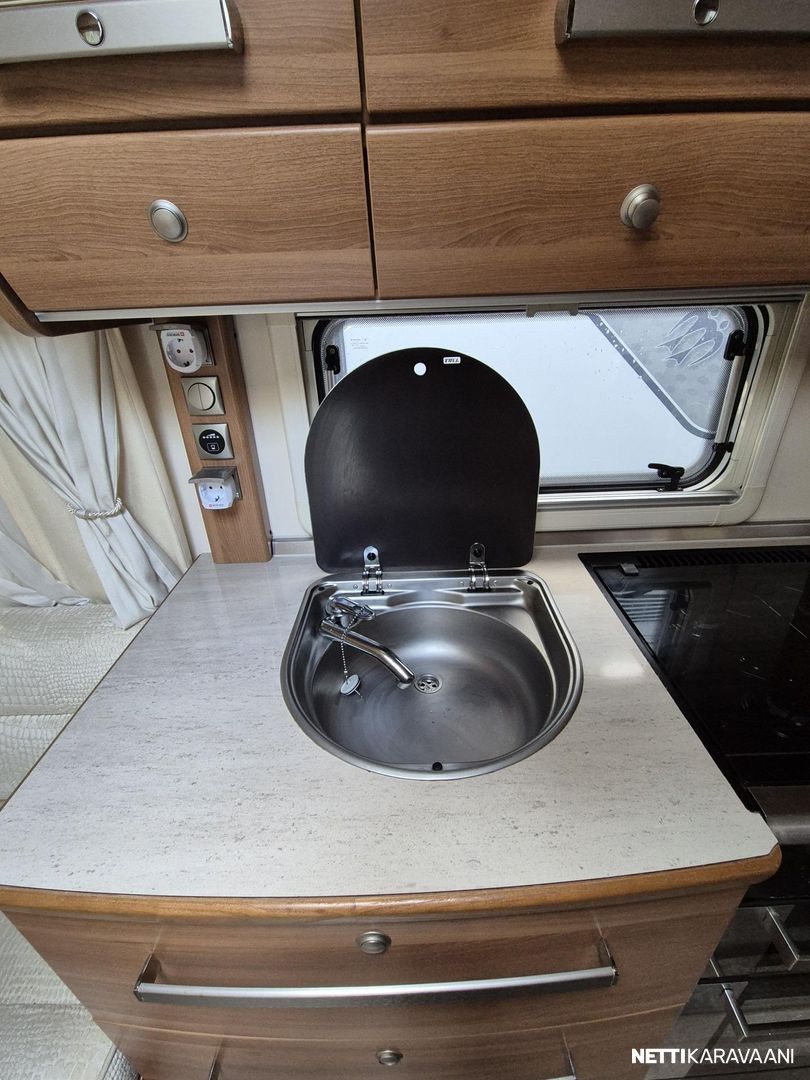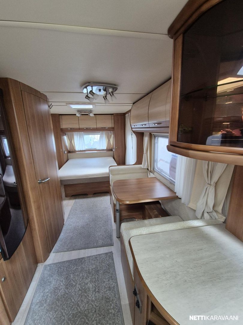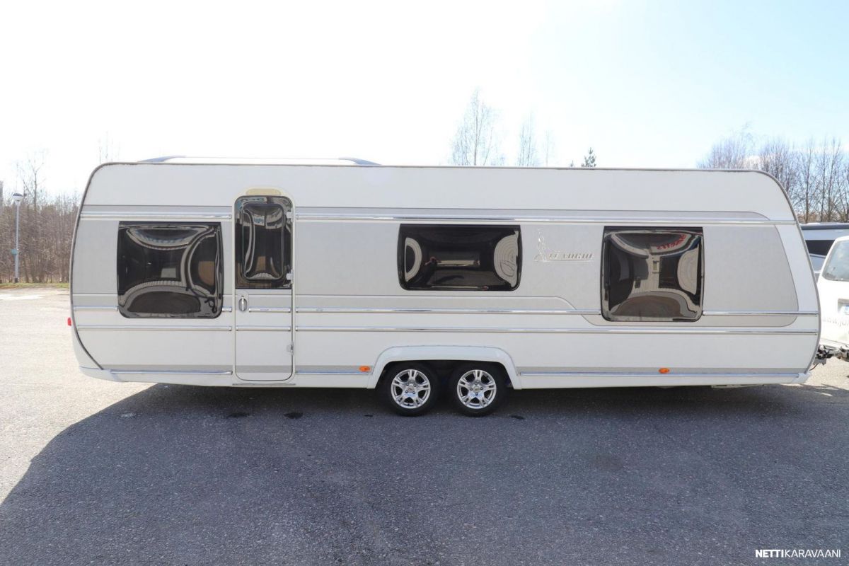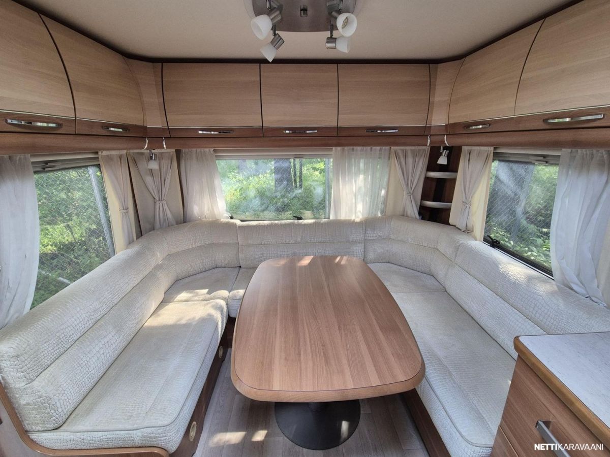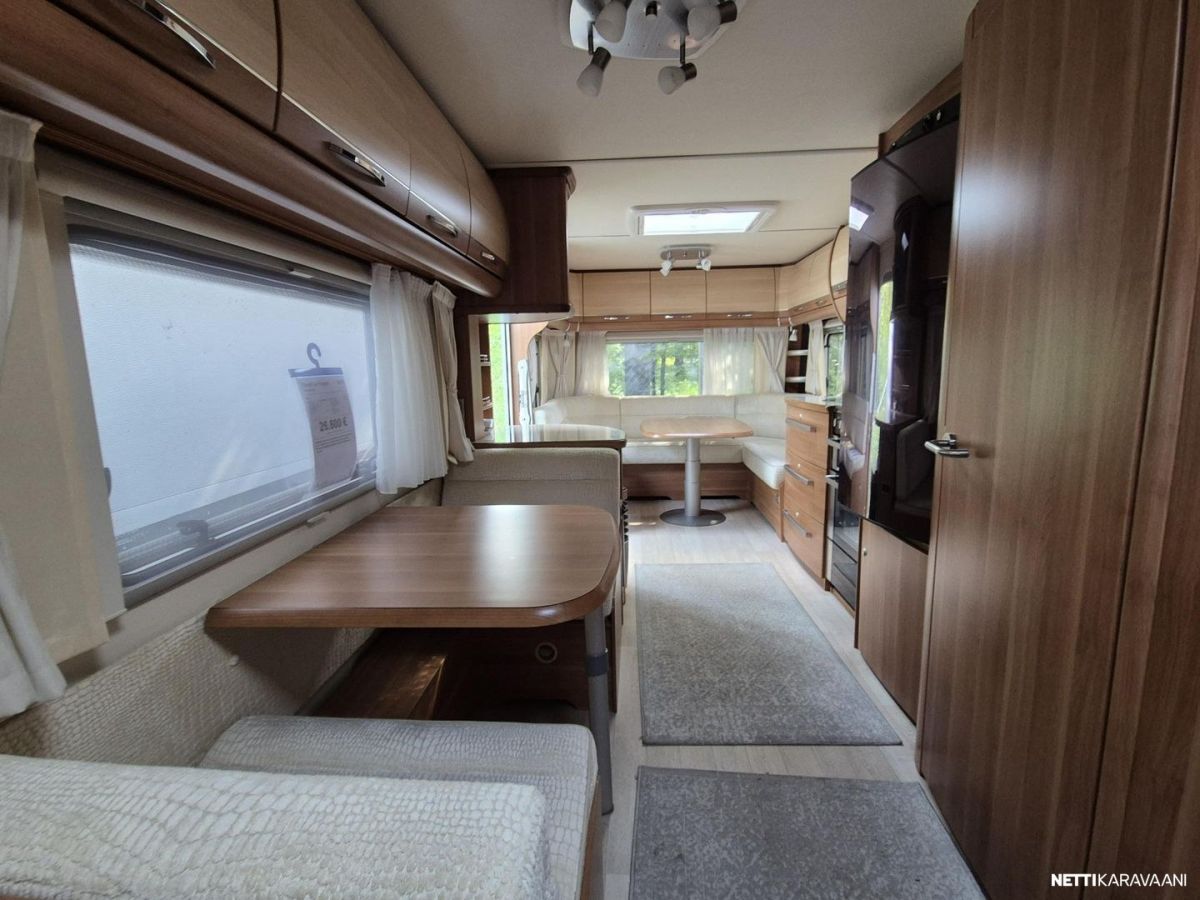 Tästä tilaa ja tyylikkyyttä kesän reissuihin tai kausipaikalle. Tämä pienen rivitalonpätkän mittainen vaunu tarjoaa tilaa kuin Turhapuron kartano konsanaan. Ihan eri tarvitse itäsiivestä länsisiipeen soittaa, mutta ei paljoa puutu. Vaunun keulassa parivuode pitkittäin. Keskiosassa iso wc tila suihkulla, vastapäätä pöytäryhmä kahdelle, josta teet vuoteen tarvittaessa. Keskiosassa myös reilusti säilytystilaa, jääkaappi pakastelokerolla ja keittiö hellalla ja kaasu-uunilla. Takana iso u-pöytyryhmä, josta rakennat vuoteen kahdelle. Vaunu on kosteusmitattu ja kuivaksi todettu, myydään huollettuna ja katsastettuna ostajan löydyttyä.