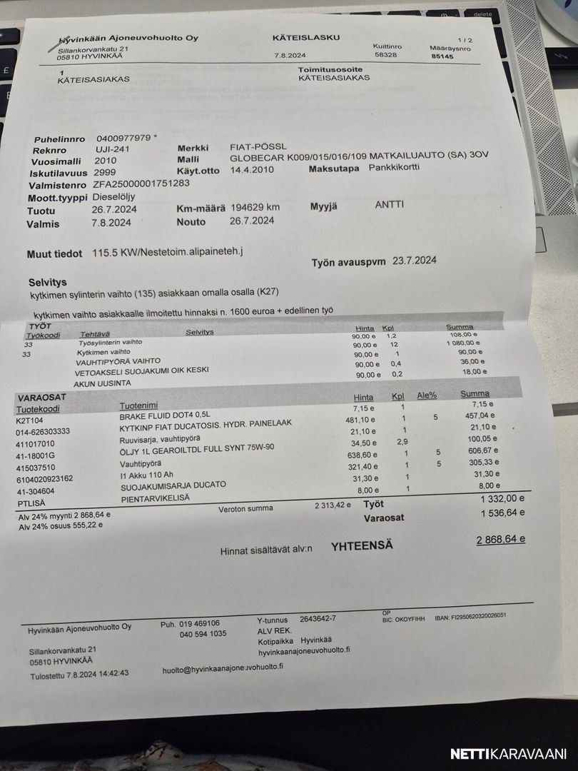 Vaihteisto: Manuaali Polttoaine: Diesel Vetotapa: Etuveto Leveys: 205 cm Pituus: 600 cm Rekisteröity: 01.04.2010 Katsastettu: 01.05.2025 Matkustajat: 4 Kokonaismassa: 3 300 kg Oma massa: 2 935 kg Makuupaikat: 2 Ajokortti: B Lämmitys: Ilmakeskuslämmitys