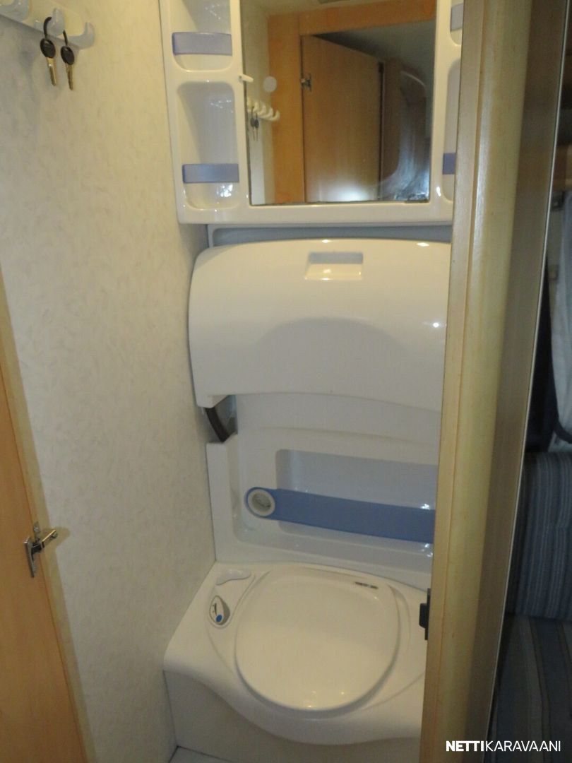 Jääkaappi, Kasetti WC, Kasettiverhot, Liesi, Lämminvesiboileri, Markiisi, Pakastelokero, Pesuallas, TV-antenni tai lautasantenni, Kattokaiteet/tikkaat, Kattoluukku, Lattialämmitys, Sähköpatruuna, Trumatic, Tukijalat