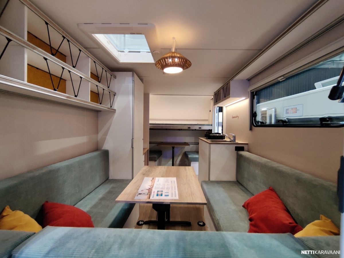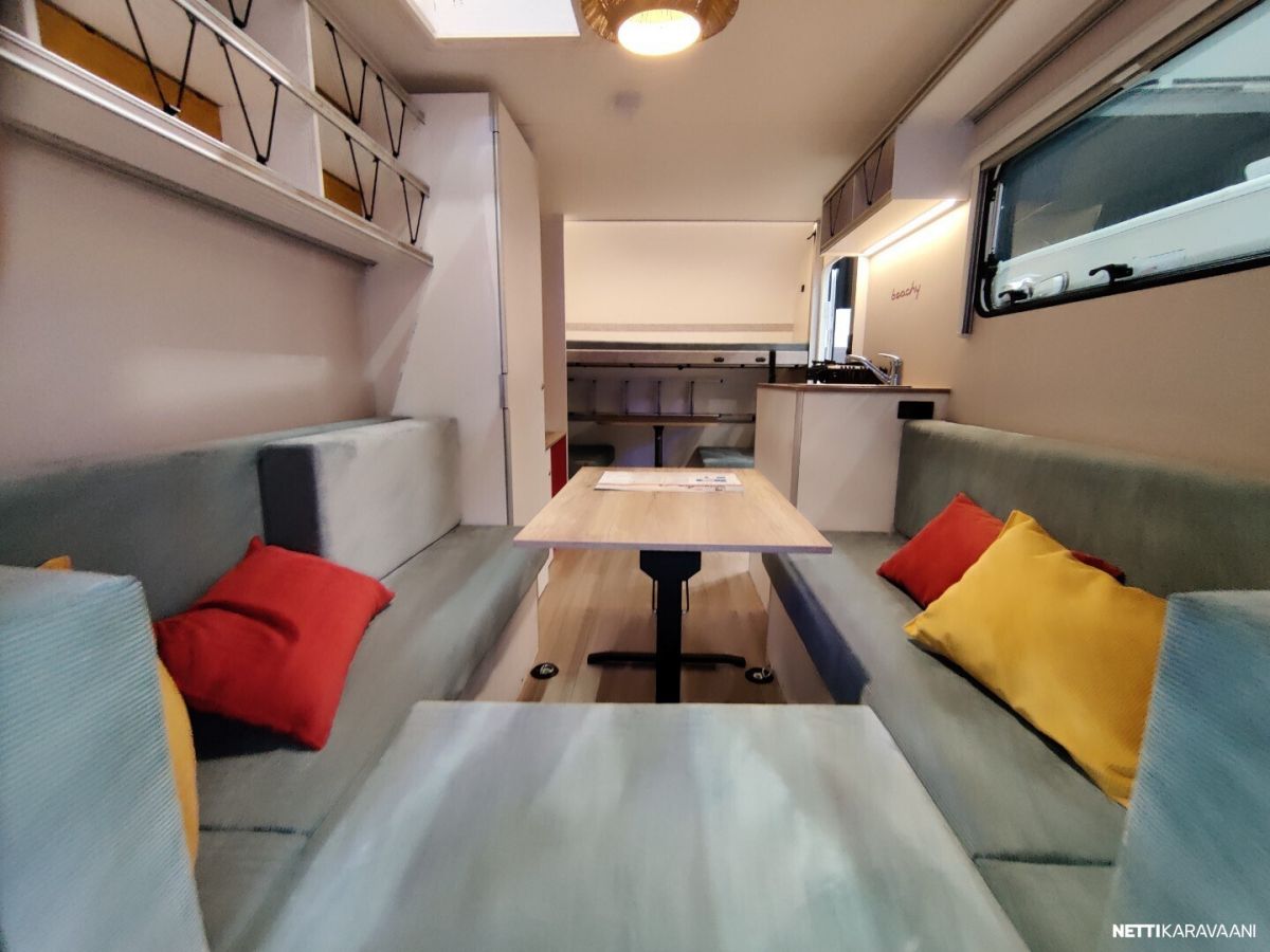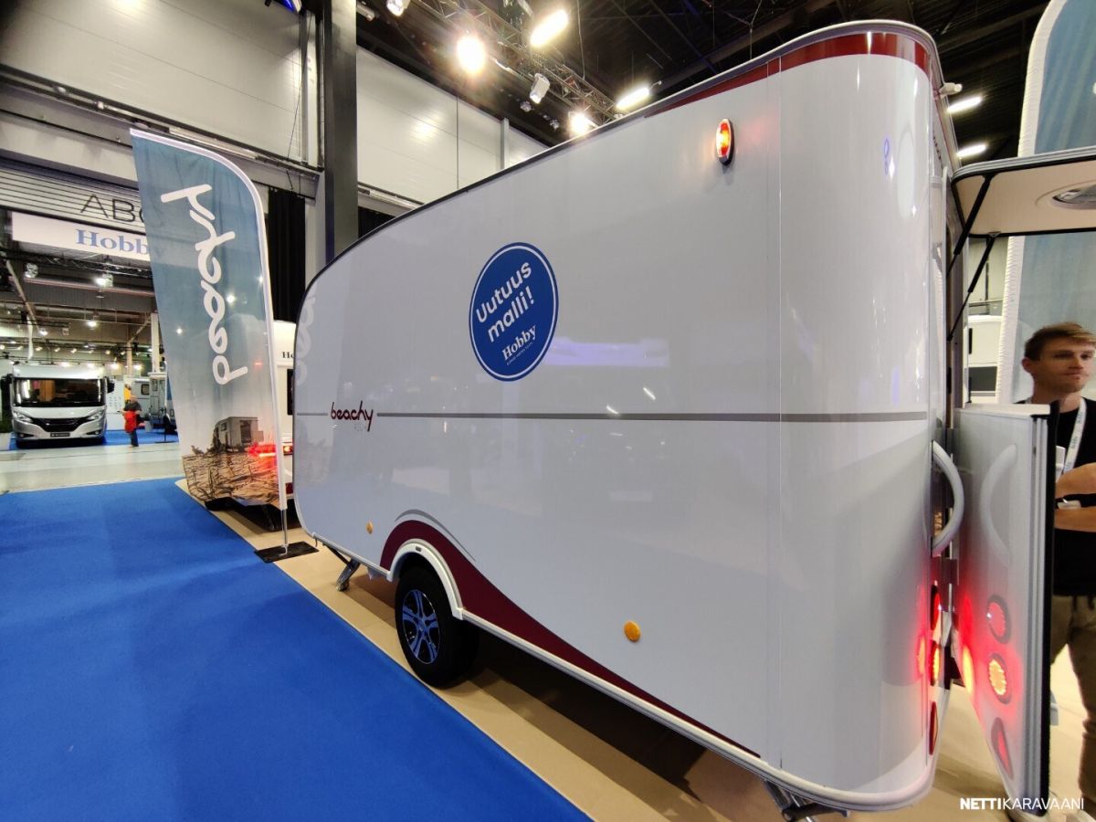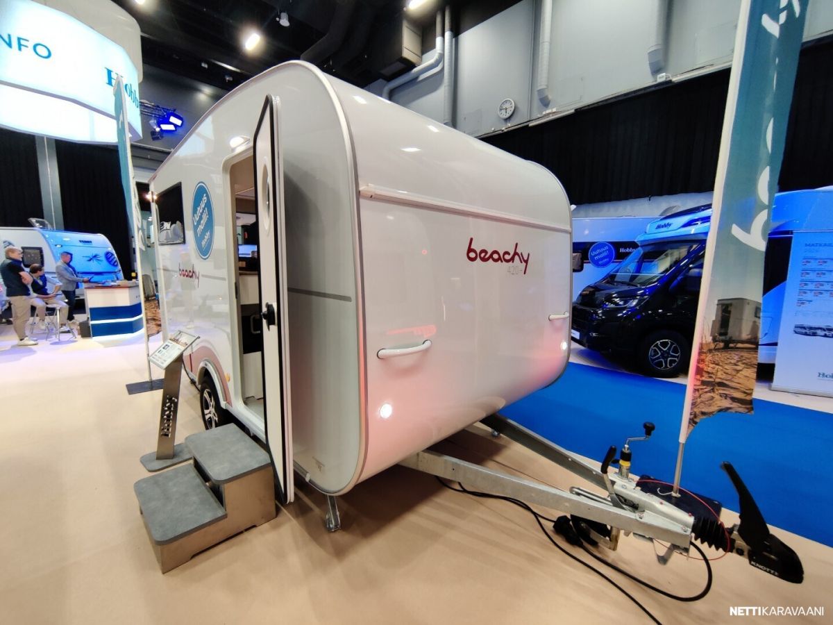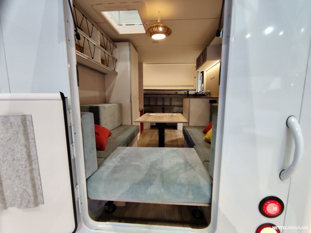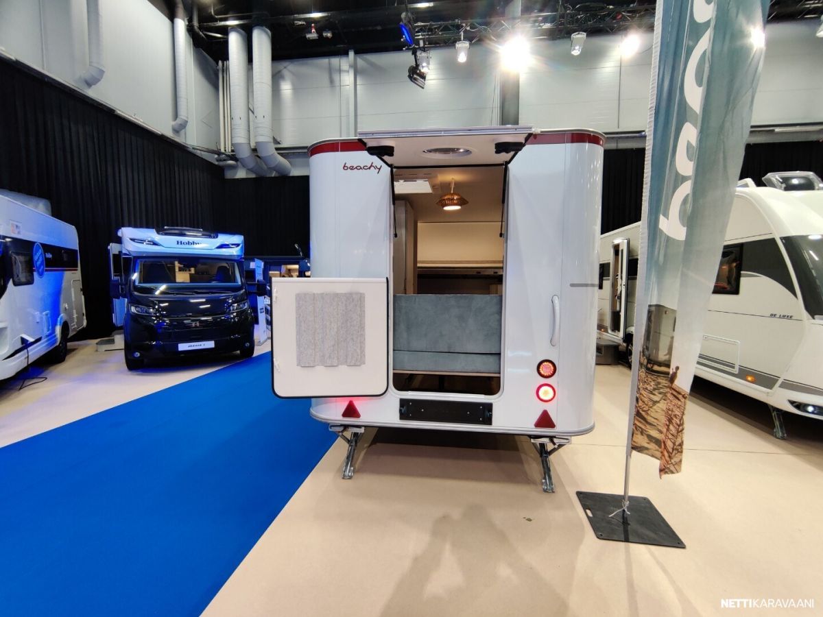 Uusi beachyn monikäyttöinen vaunu Vuoteet jopa 4 hlöä Etukerrosvuoteen saa käännettyä pois ja alla olevan sängyn pöytäryhmäksi Takaovesta saa isommankin tavaran sisään jopa polkupyörät tai surffilaudan Akku varustus Alumiini vanteet Kitkavetopää