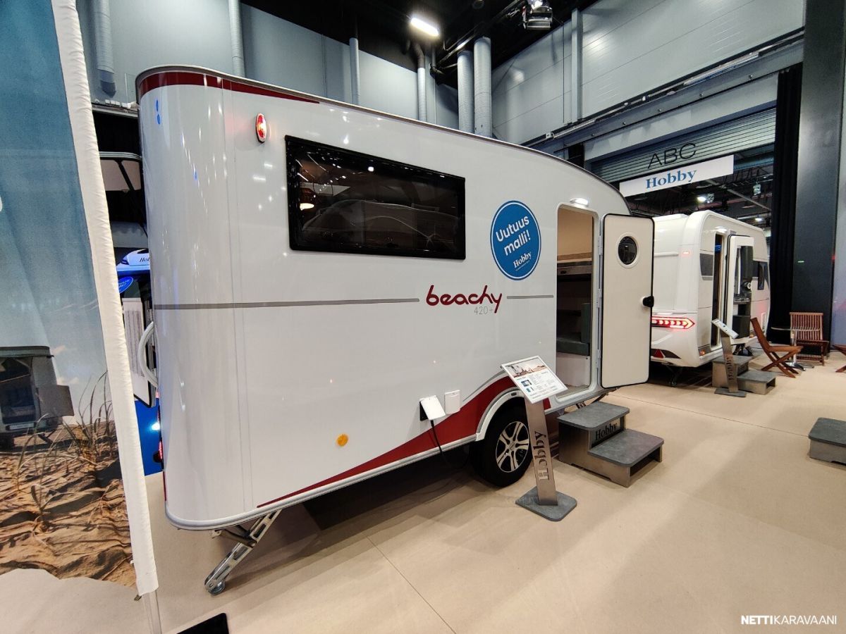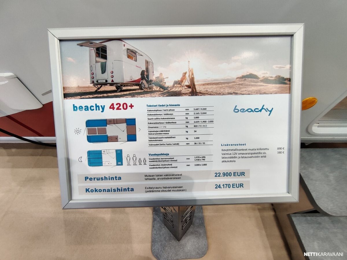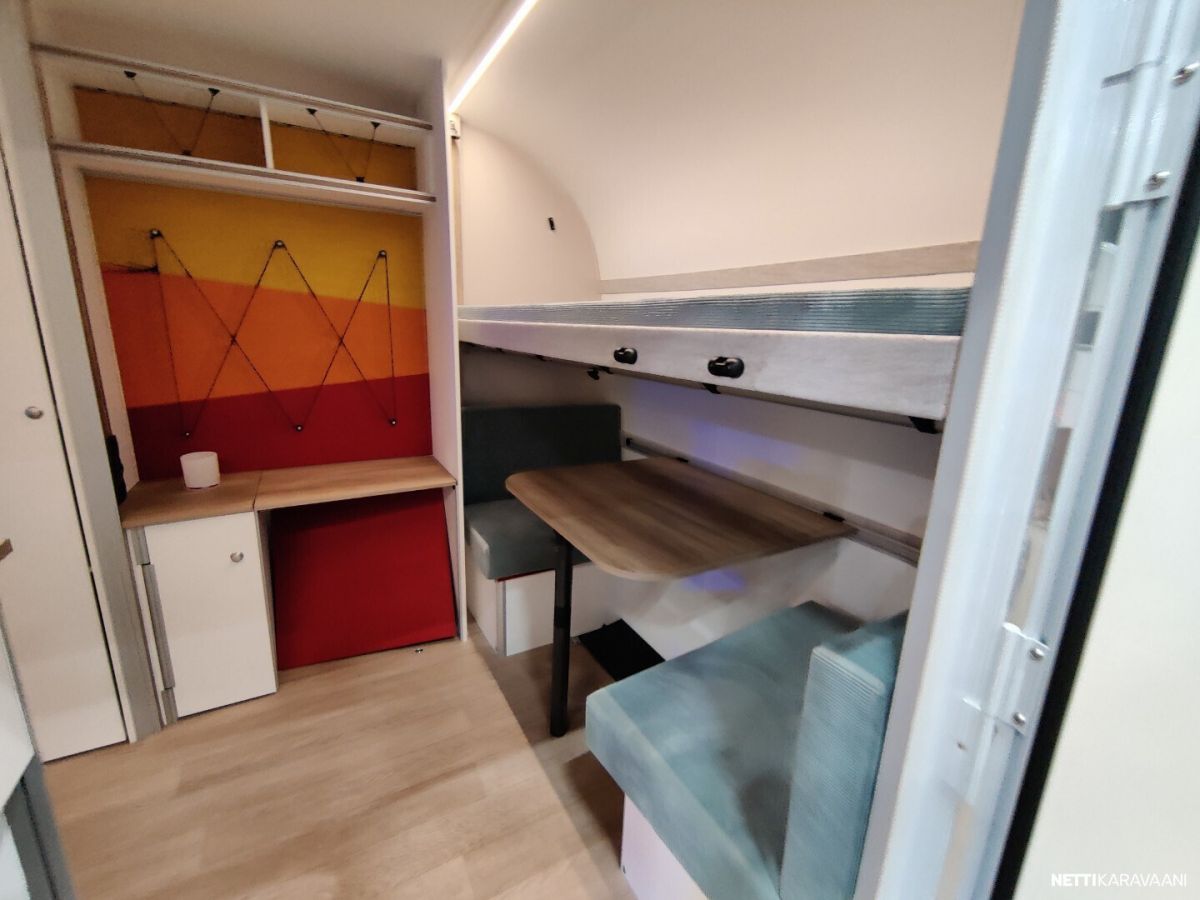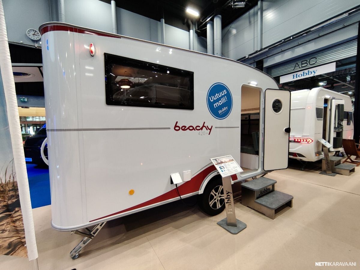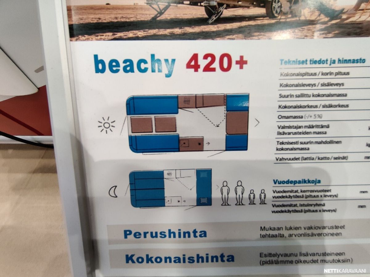 Uusi beachyn monikäyttöinen vaunu Vuoteet jopa 4 hlöä Etukerrosvuoteen saa käännettyä pois ja alla olevan sängyn pöytäryhmäksi Takaovesta saa isommankin tavaran sisään jopa polkupyörät tai surffilaudan Akku varustus Alumiini vanteet Kitkavetopää