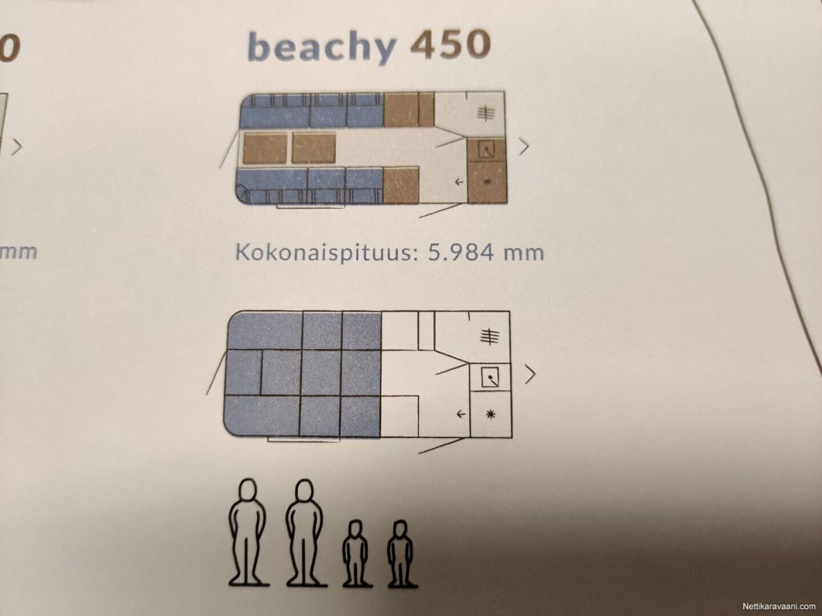 Leveys: 216 cm Pituus: 598 cm Kokonaismassa: 1 000 kg Oma massa: 861 kg Makuupaikat: 4 Lämmitys: Ei määritelty