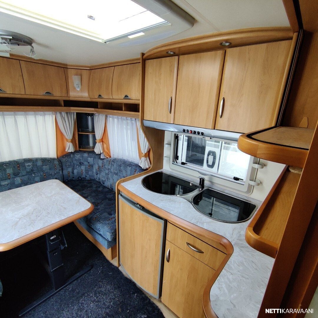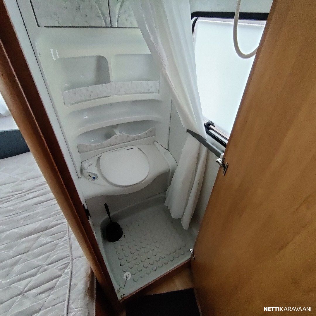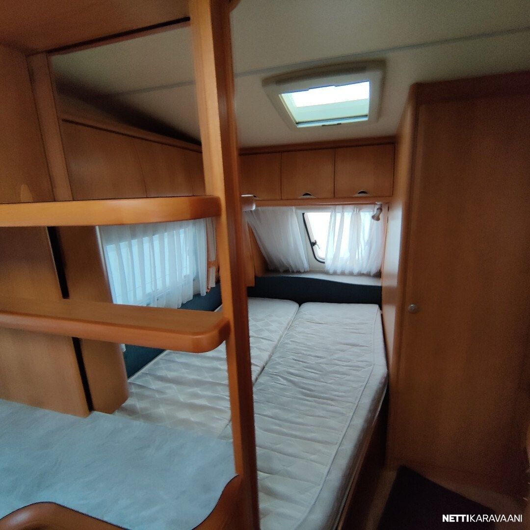 Kevyt vetää pienemmallakin autolla Trumatic ilmakeskuslammtys kaasulla Iso valoisa kattoluukku Akku ja laturi TV antenni vahvistimella Tavara luukku vuoteen alle Kitkavetopää Lämmin vesi Suihku Mikro Lattialämmitys Katto tikkaat ja kaiteet Katsastettu 12/2025 Seuraava katsastus 12/2027
