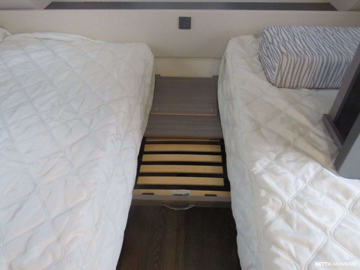 Trumatic ilmakeskuslämmitys, sähkövastus, lattialämmitys, lämminvesi, kaasuhälytin, liesituuletin, tavaraluukku, Reimo Casa Royal 320-osateltta, erillisvuoteet yhdistämismahdollisuudella