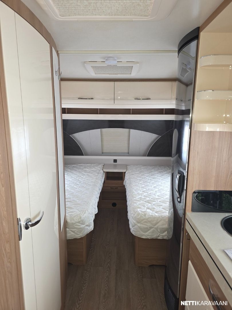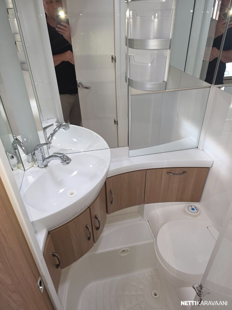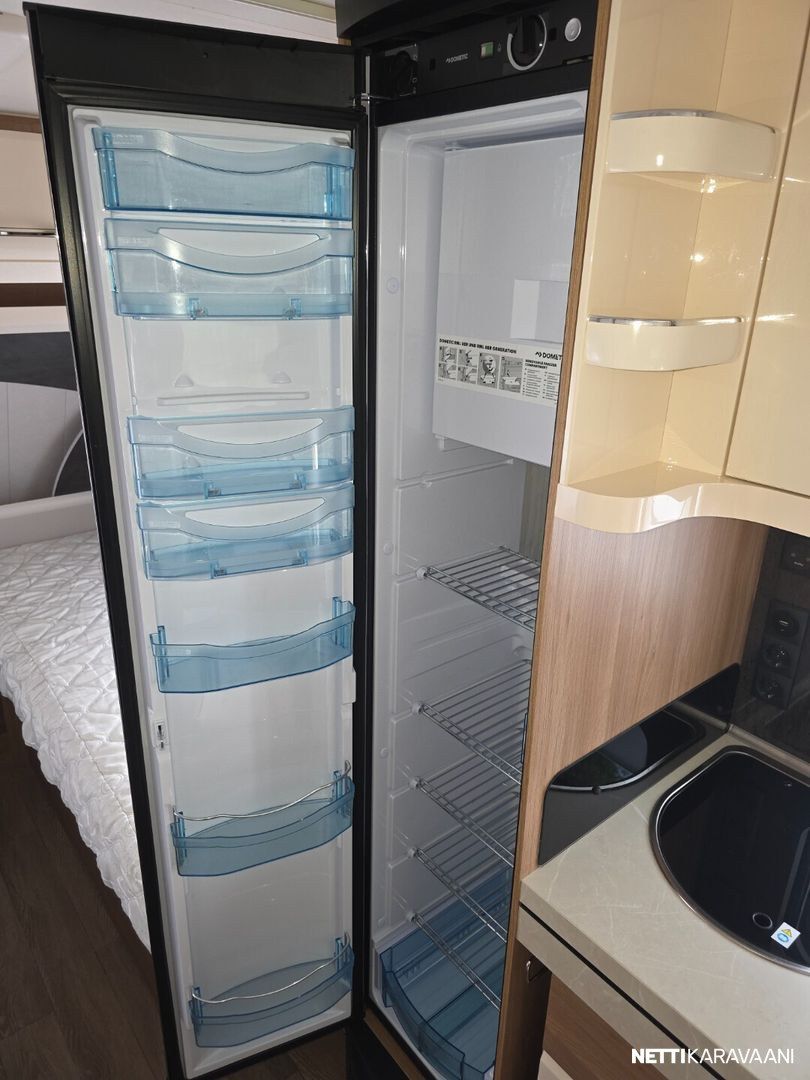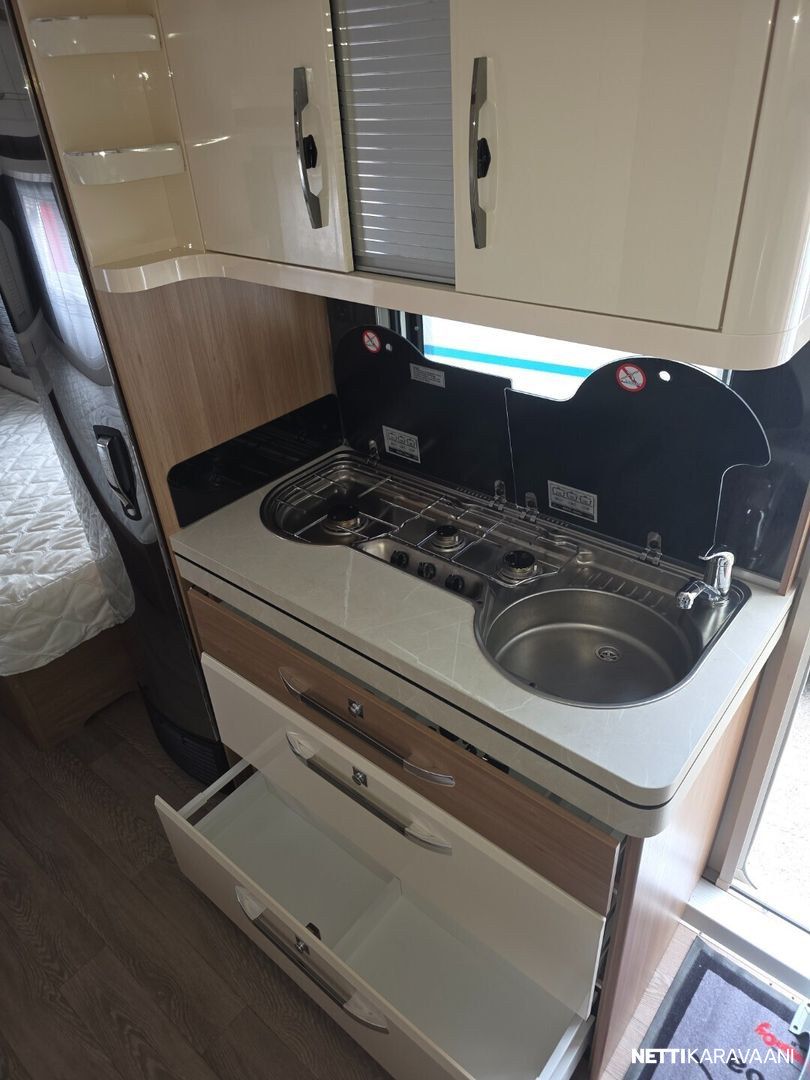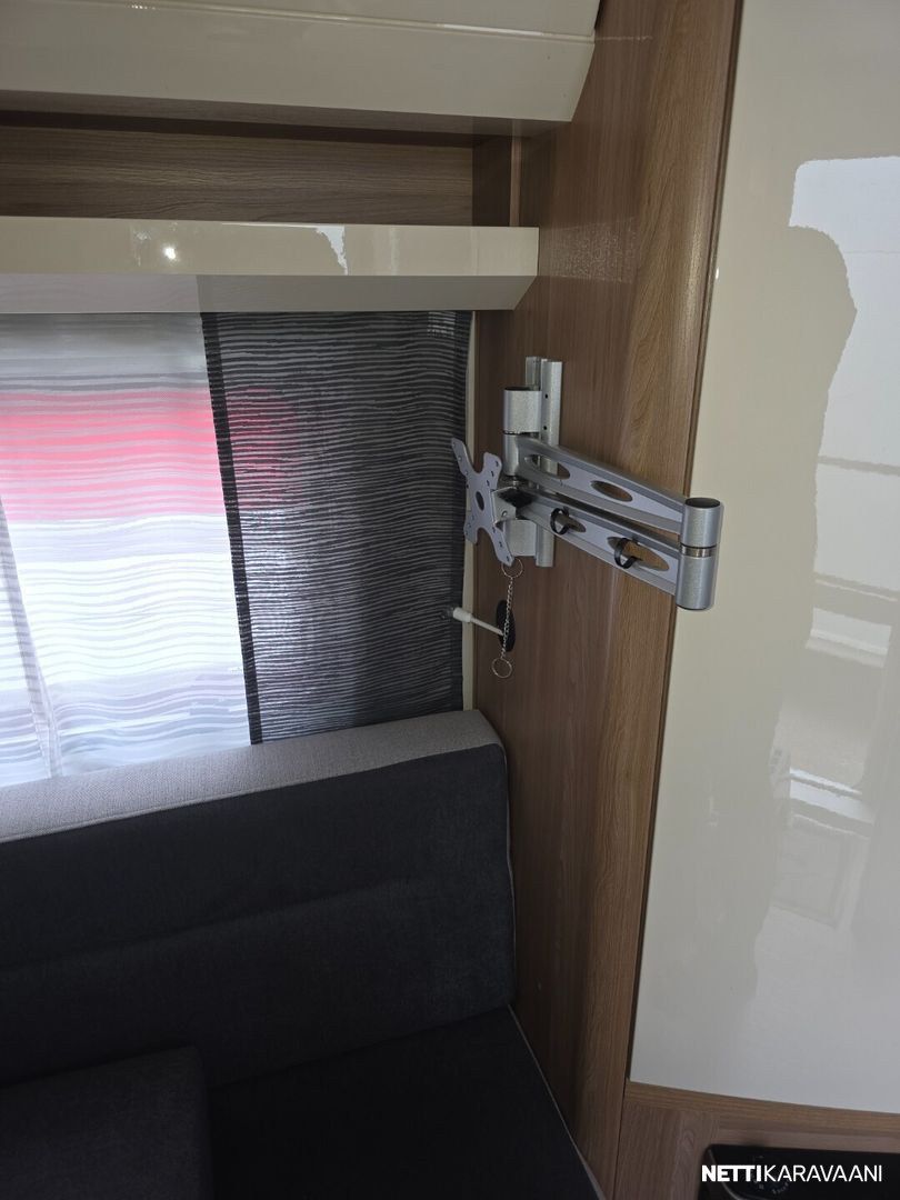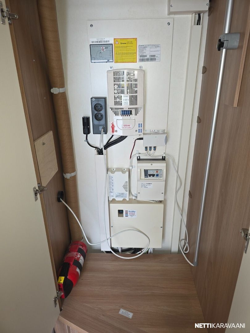 Jääkaappi, Kasetti WC, Kasettiverhot, Lattiamatot asunto-osassa, Liesi, Lämminvesiboileri, Markiisi, Kattoluukku, Lattialämmitys, Pesuallas, TV-antenni tai lautasantenni, Sähköpatruuna, Trumatic, Tukijalat