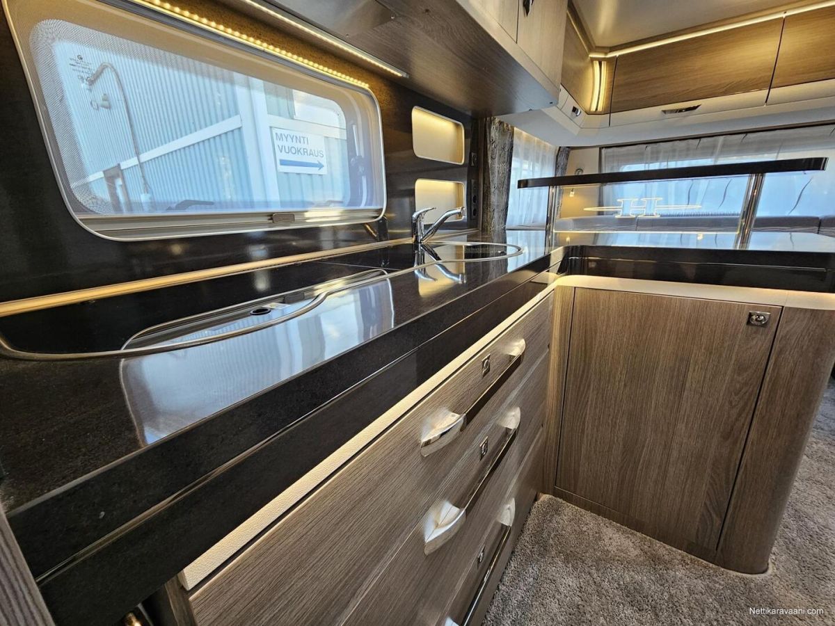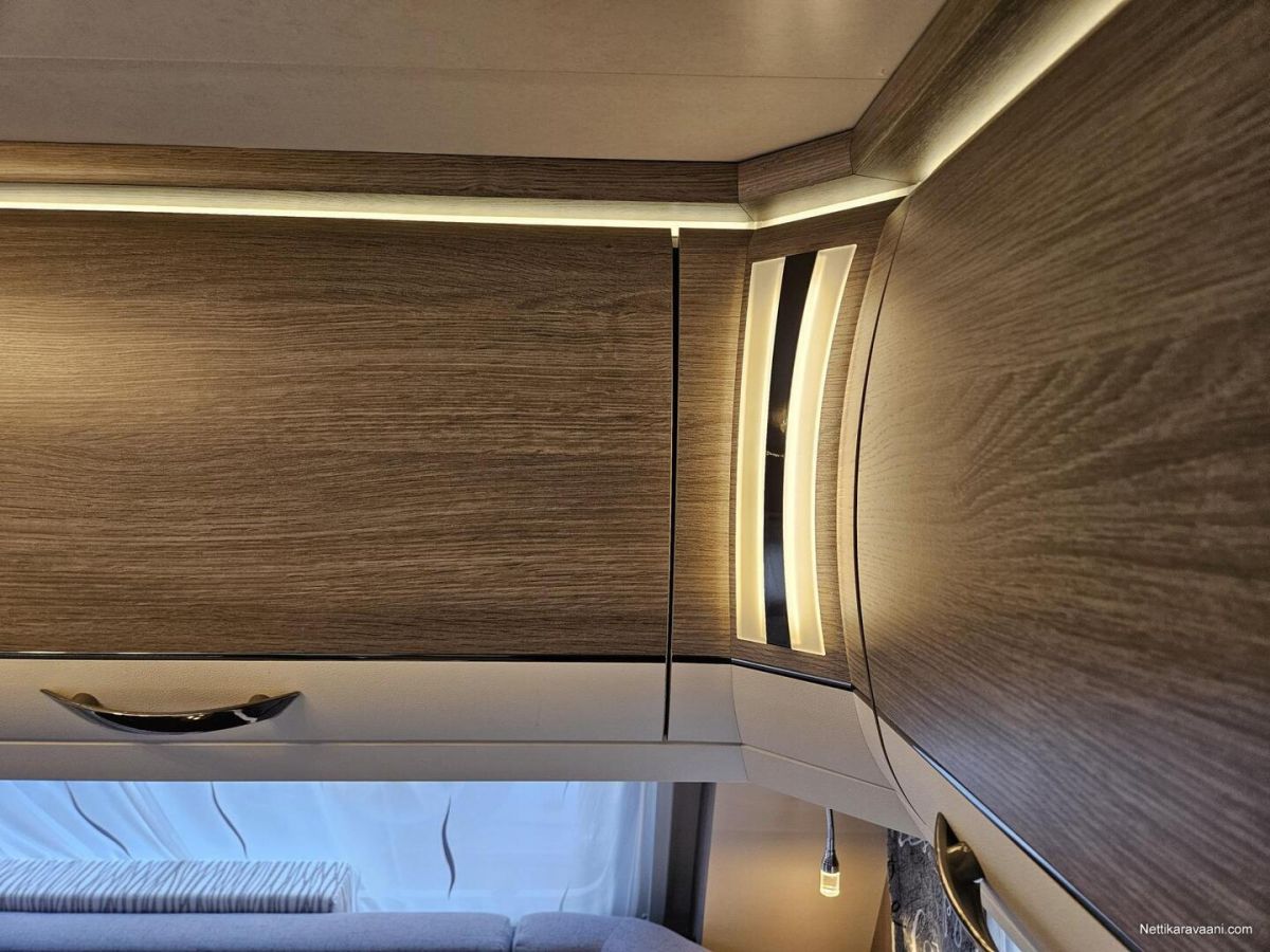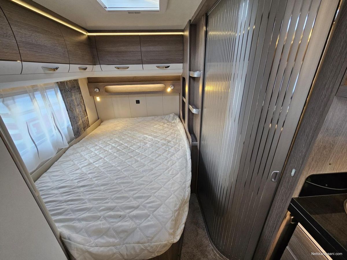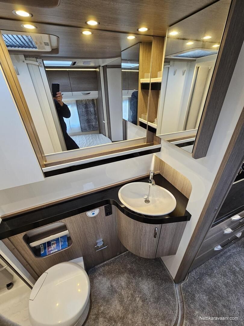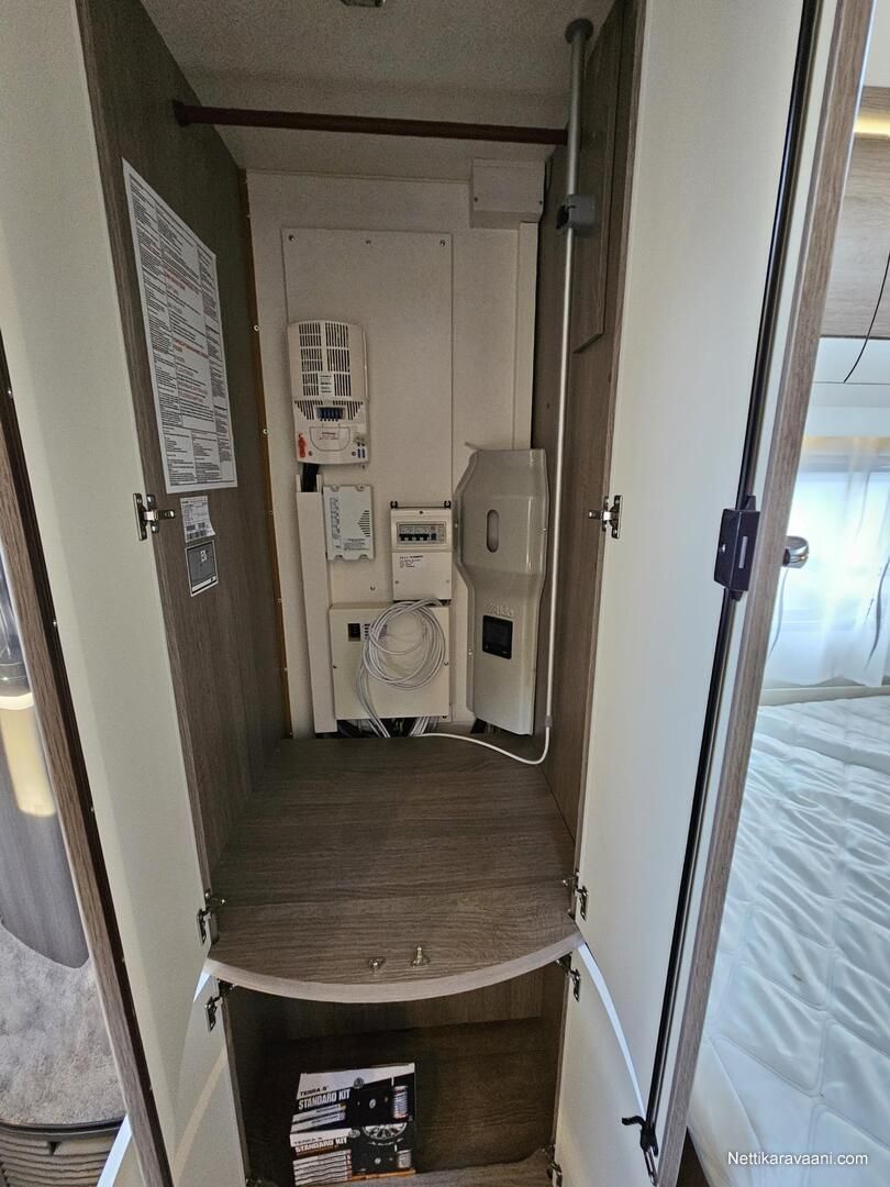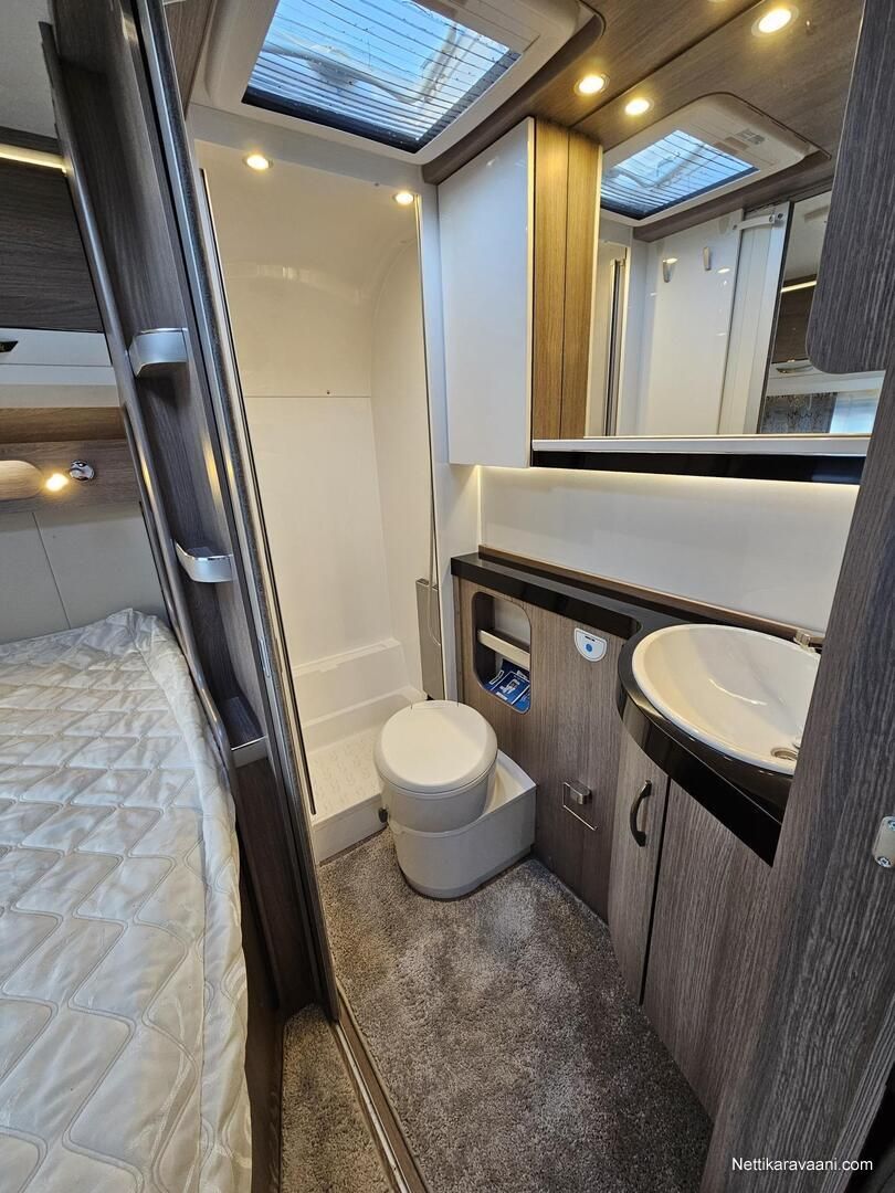 Kattoluukku, Kasetti WC, Suihku, Lämminvesiboileri, Liesi, Jääkaappi, Pakastelokero, Kasettiverhot, Tukijalat, Lattiamatot asunto-osassa, Pesuallas, Lattialämmitys, Sähköpatruuna, Alde