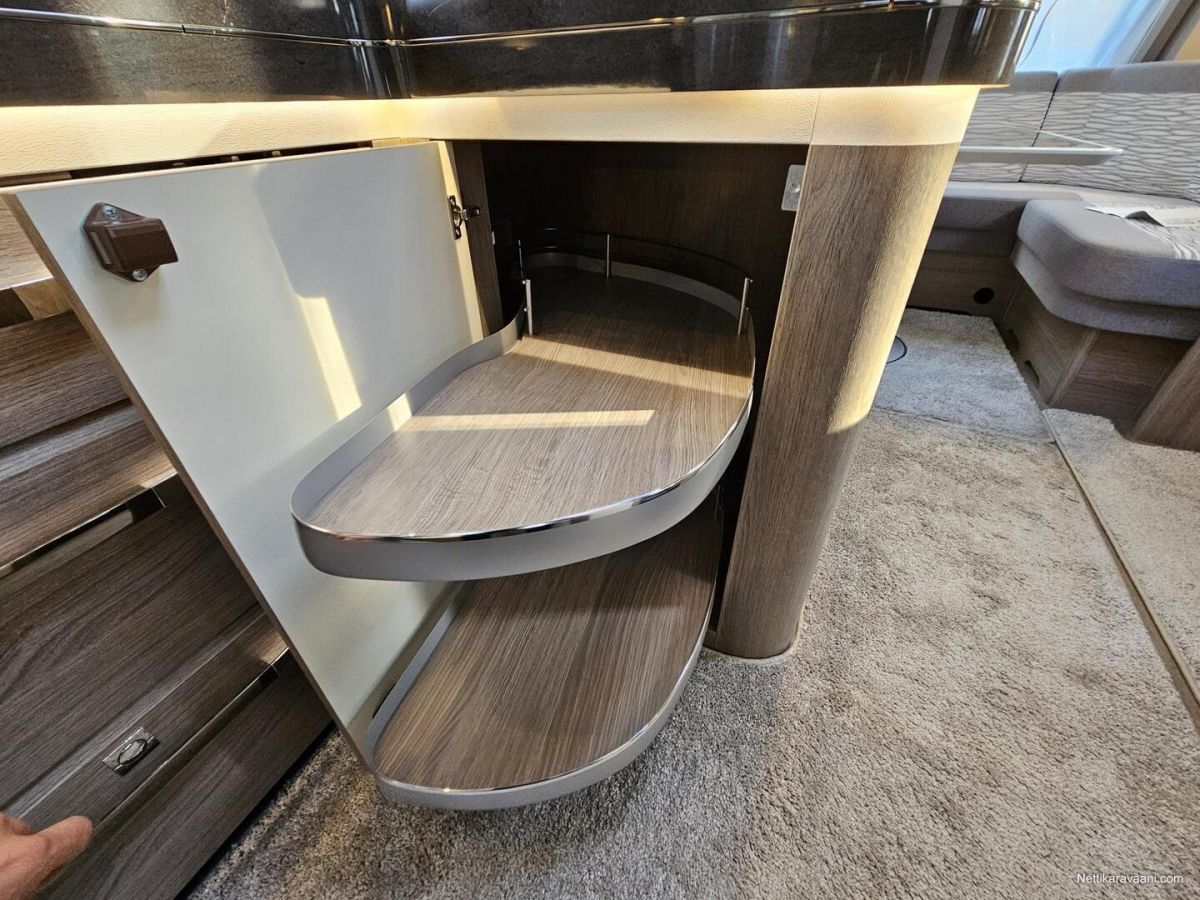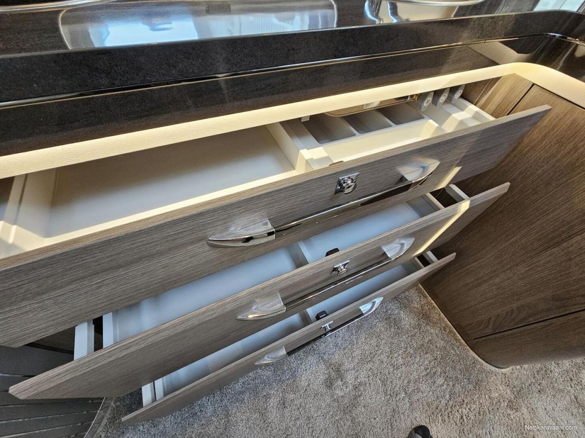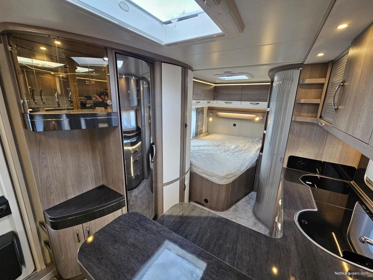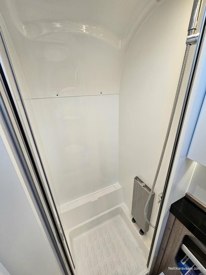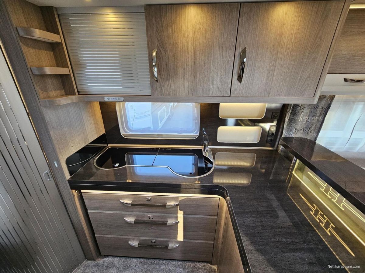 Kattoluukku, Kasetti WC, Suihku, Lämminvesiboileri, Liesi, Jääkaappi, Pakastelokero, Kasettiverhot, Tukijalat, Lattiamatot asunto-osassa, Pesuallas, Lattialämmitys, Sähköpatruuna, Alde