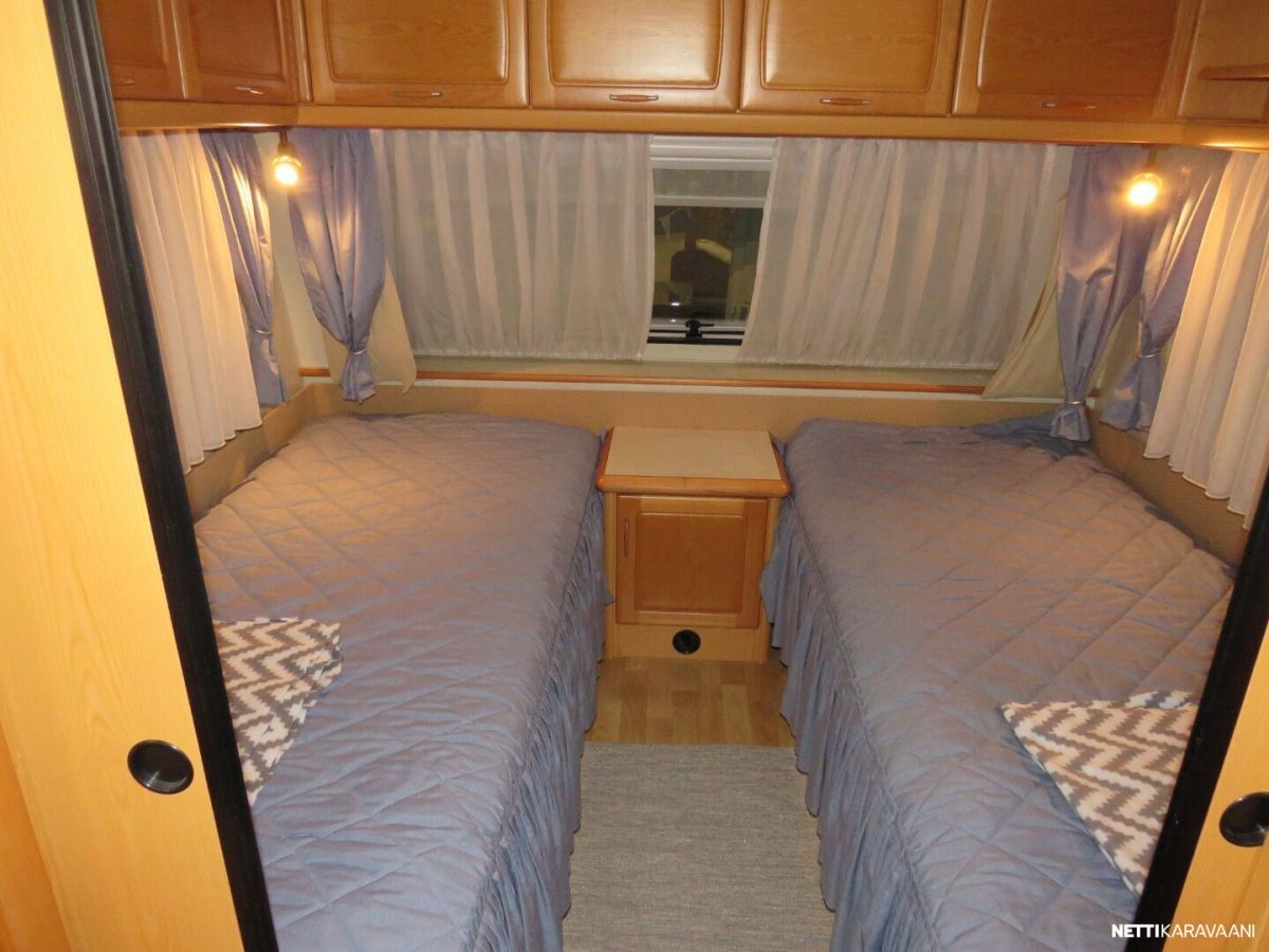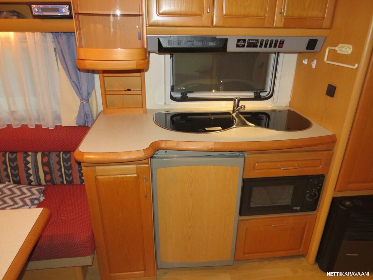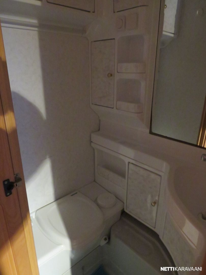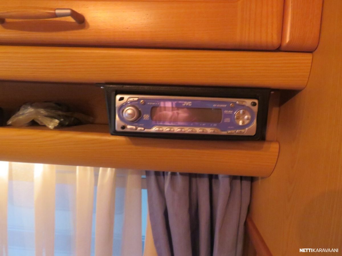 Jääkaappi, Kasetti WC, Kasettiverhot, Liesi, Lämminvesiboileri, Mikroaaltouuni, Pakastelokero, Pesuallas, TV-antenni tai lautasantenni, Kattoluukku, Lattialämmitys, Sähköpatruuna, Trumatic, Tukijalat