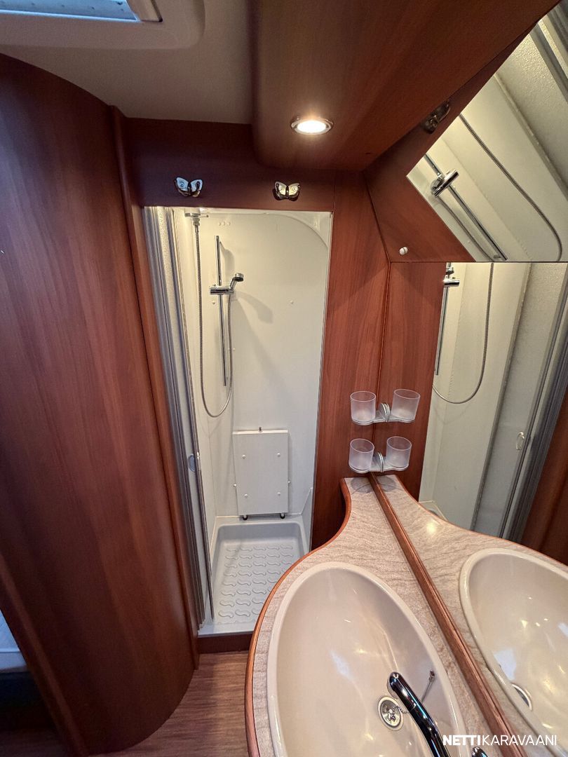 Dometic ilmastointi kaukosäädöllä, Alde-nestekeskuslämmitys, lattialämmitys, sähköpatruuna, lämmin vesi, jää-/pakastinkaappi, kaasuliesi, liesituuletin, kiinteä raikasvesisäiliö, kasettiverhot, kirkas kattoluukku, akku-/laturivarustus, tv-antenni, kitkavetopää, sähkömittari, Truma mover ajomoottorit, kaasupullo, ym...