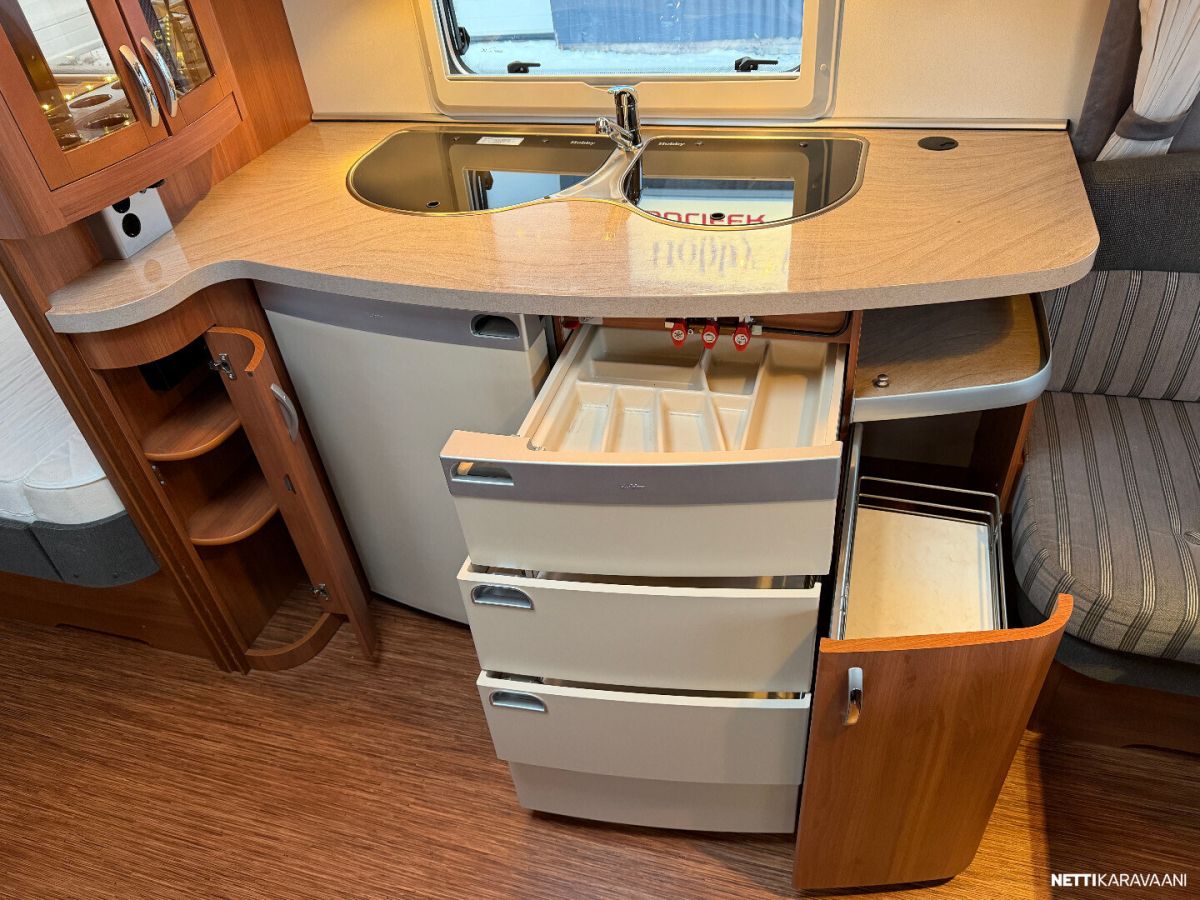 Dometic luftkonditionering, Alde vattenburen-centralvärme, elvärme, golvvärme, varmvatten, kyl-/frysskåp, spis, spisfläk, fast vattentank, kasettrullgardin, takfönster, tv-antenn, batteri/laddar, säkerhetskoppling, elmätare, Truma mover, gasflaska, mm...