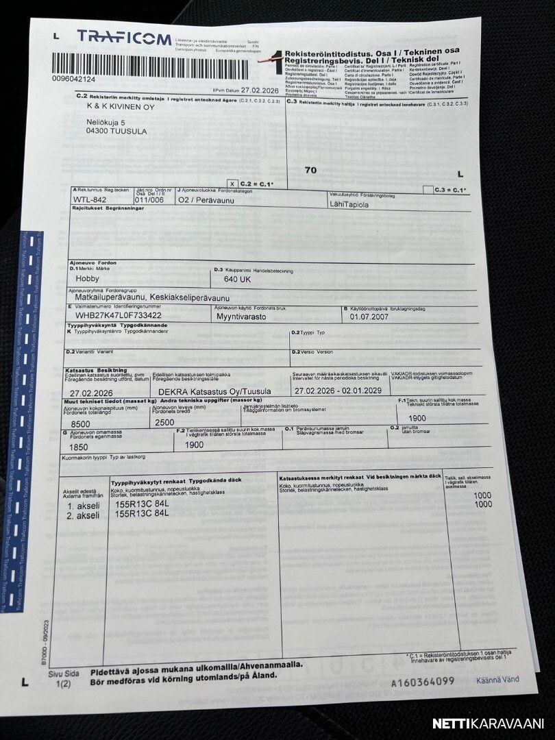 Leveys: 250 cm Pituus: 850 cm Rekisteröity: 01.01.2007 Kokonaismassa: 1 900 kg Oma massa: 1 850 kg Makuupaikat: 5 Lämmitys: Ei määritelty