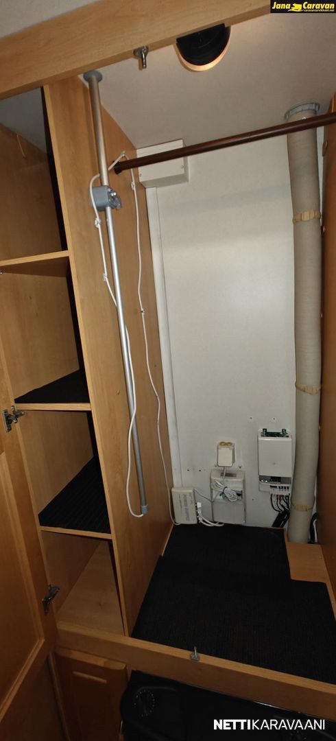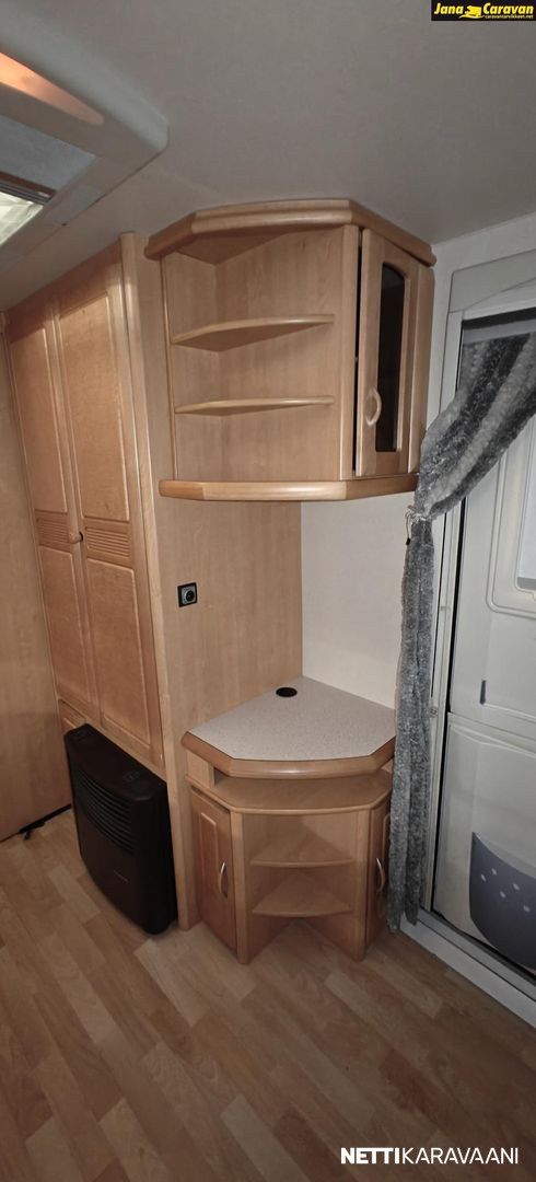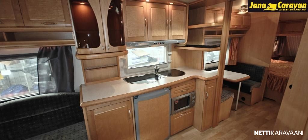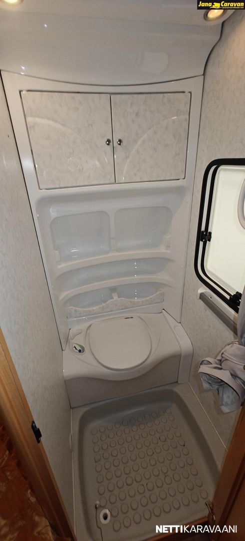Kattoluukku, Kasetti WC, Suihku, Lämminvesiboileri, Liesi, Jääkaappi, Pakastelokero, Mikroaaltouuni, Kasettiverhot, Sähköpatruuna