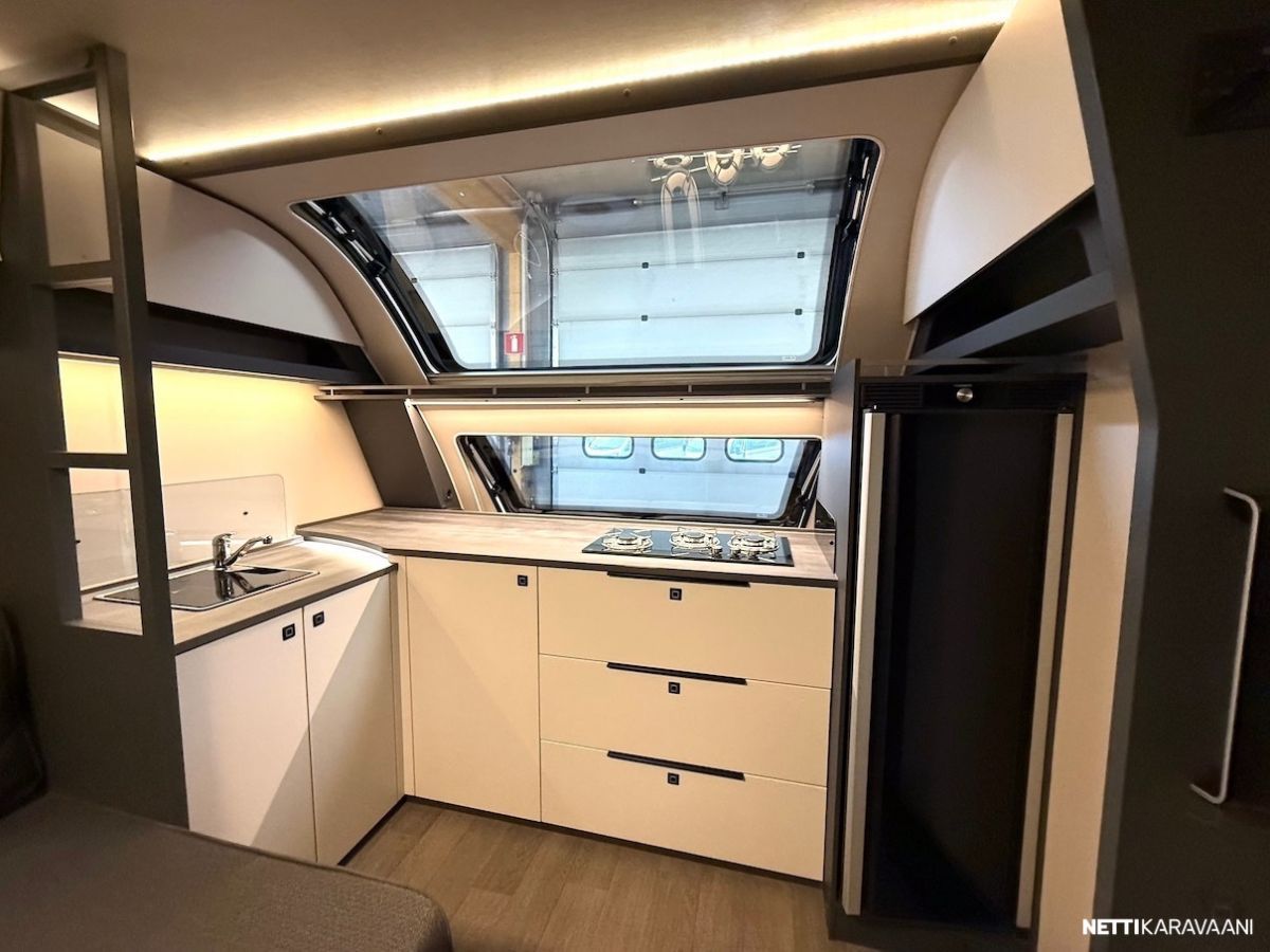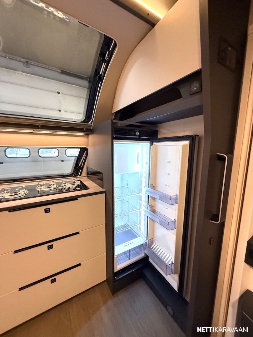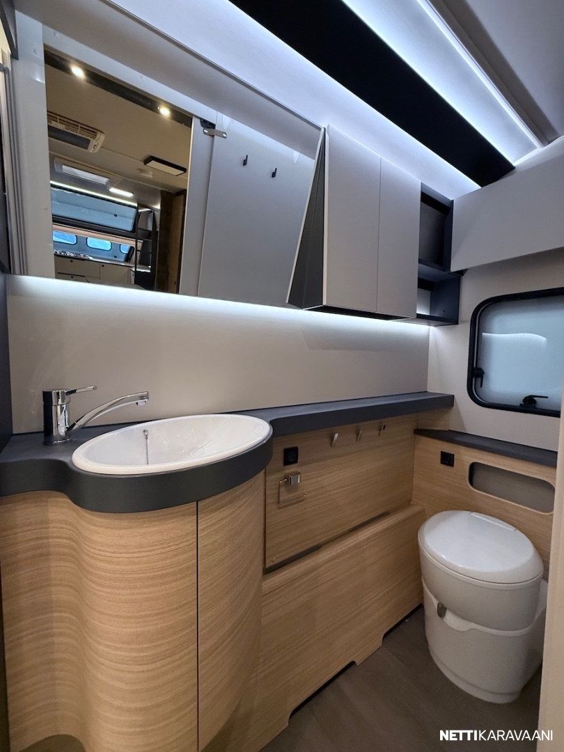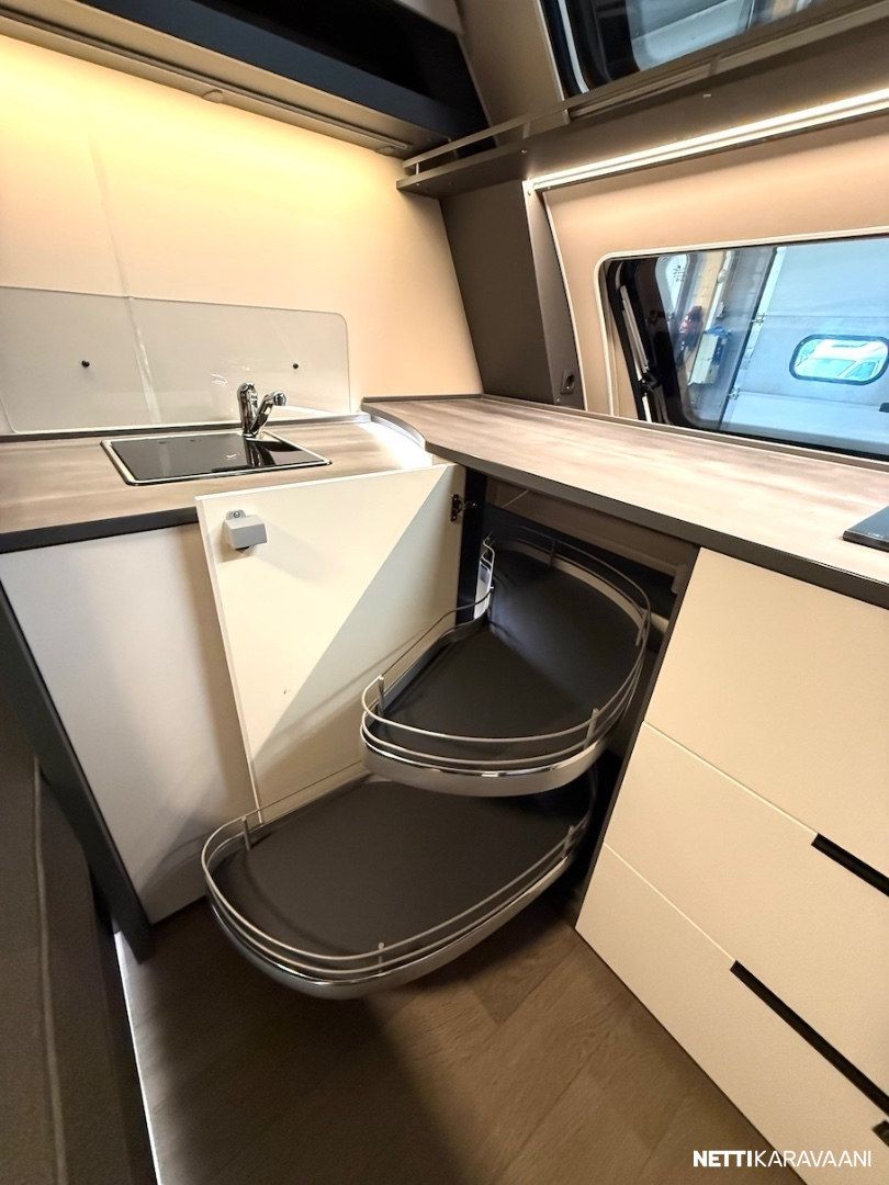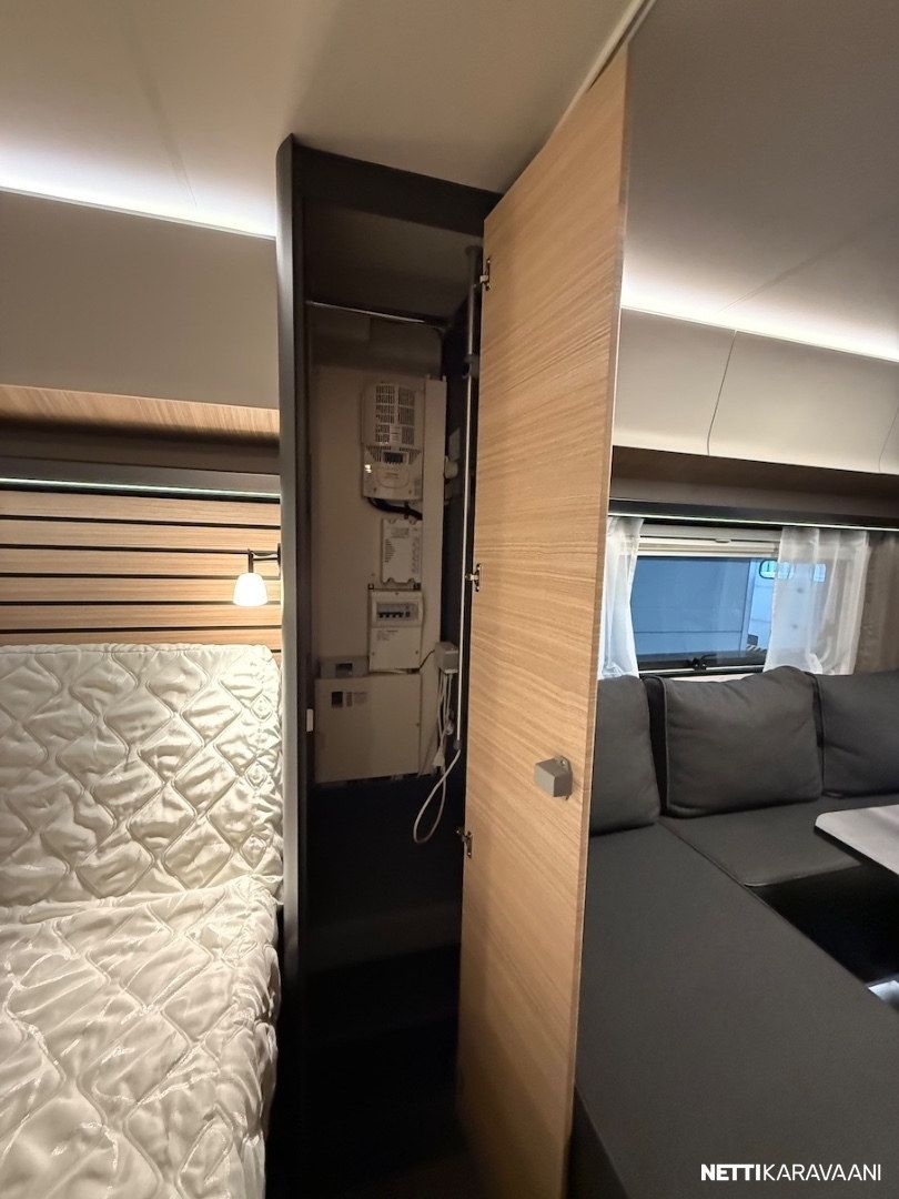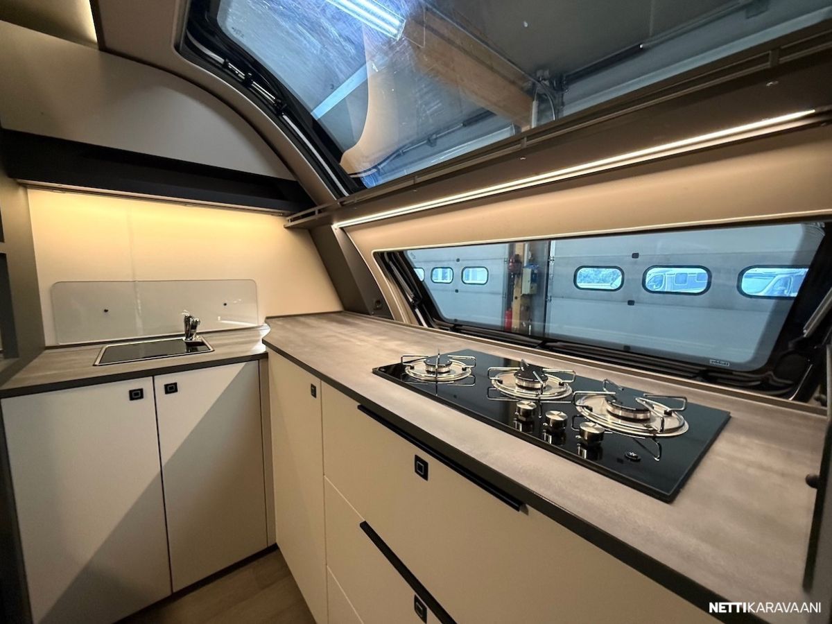 Dometic -asuinosan ilmastointi, musta Thule -kotelomarkiisi, Alde -nestekeskuslämmitys, nestekiertoinen lattialämmitys, tilava SlimTower -kompressorijääkaappi, ikkunallinen ulko-ovi, hyttysverkko-ovi, keulan panoraama kattoikkuna, LED-valaistus ja epäsuora tunnelmavalaistus, lepoasentoon työnnettävä saarekevuode, kitkavetopää, alumiinivanteet, näppärä kulmakaruselli keittiön kaapissa, TV-antenni, TV-teline ja paikka vaikka isollekin televisiolle, sähkön ulosottorasia.