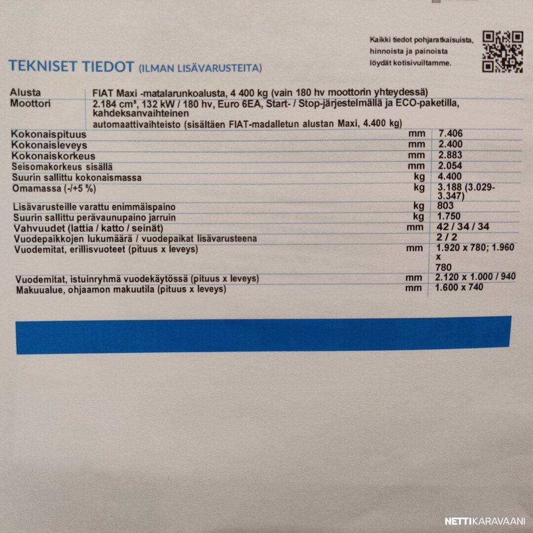 Vaihteisto: Automaatti Polttoaine: Diesel Vetotapa: Etuveto Leveys: 240 cm Pituus: 740 cm Matkustajat: 4 Kokonaismassa: 4 400 kg Oma massa: 3 188 kg Makuupaikat: 4 Ajokortti: C Lämmitys: Ei määritelty