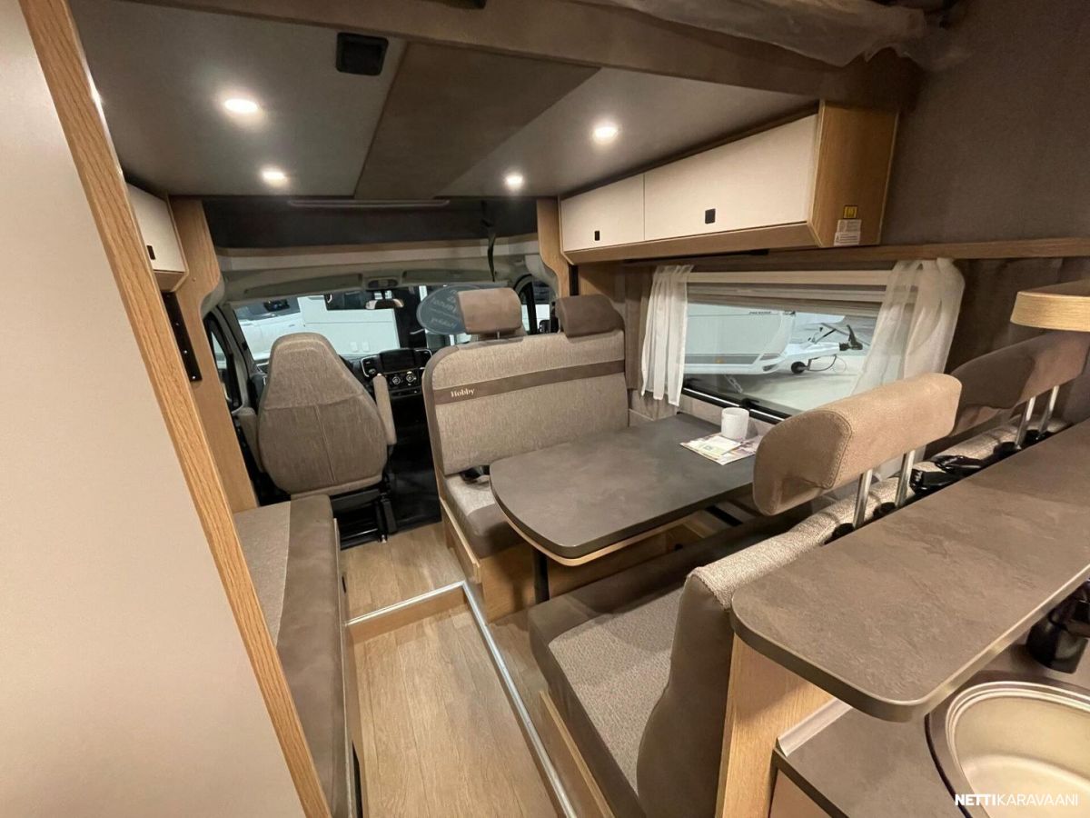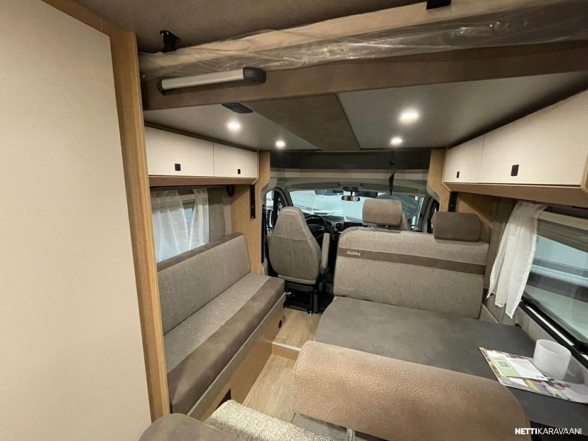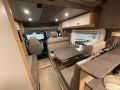 Etuosassa iso pöytäryhmä, sivusohva ja nostovuode. Kääntyvät ohjaamon istuimet.