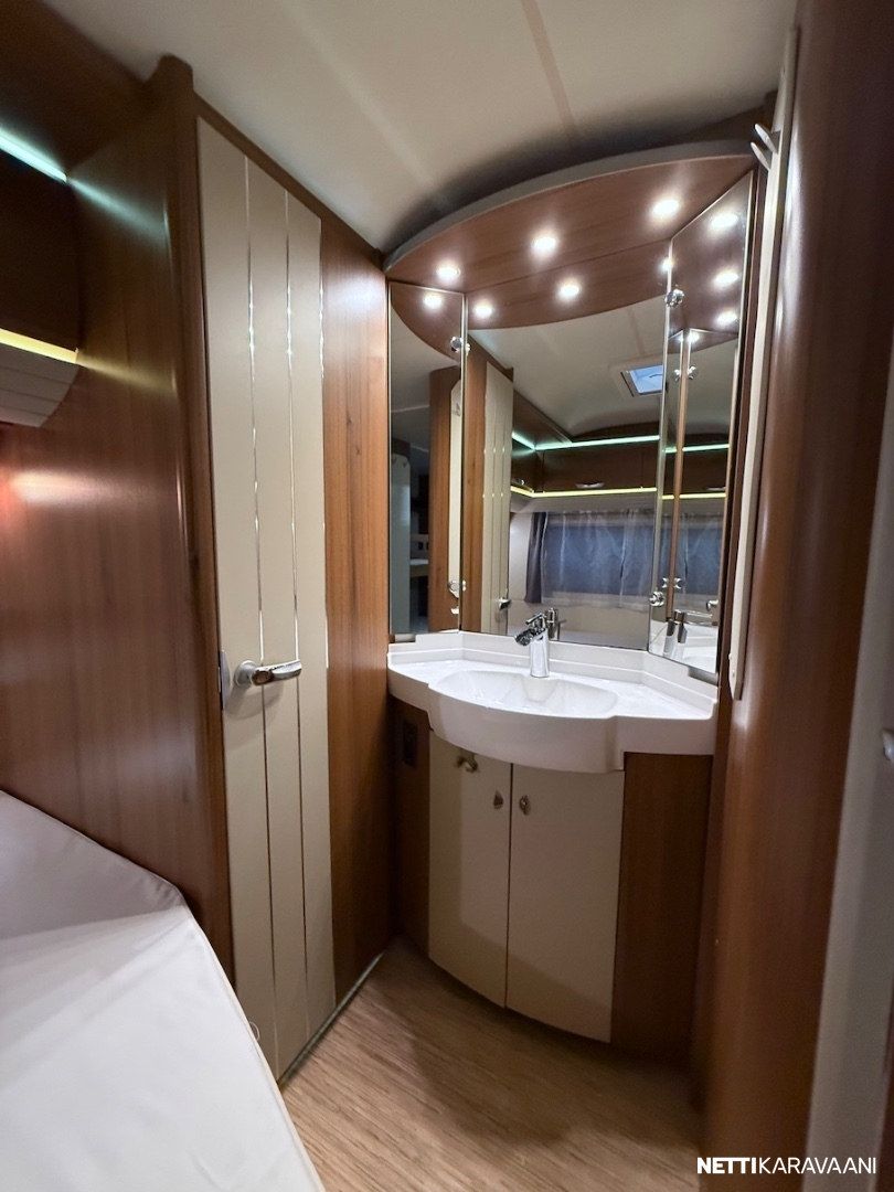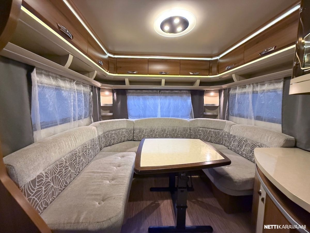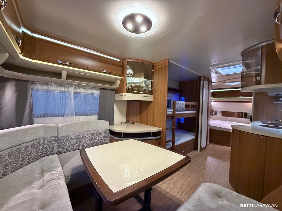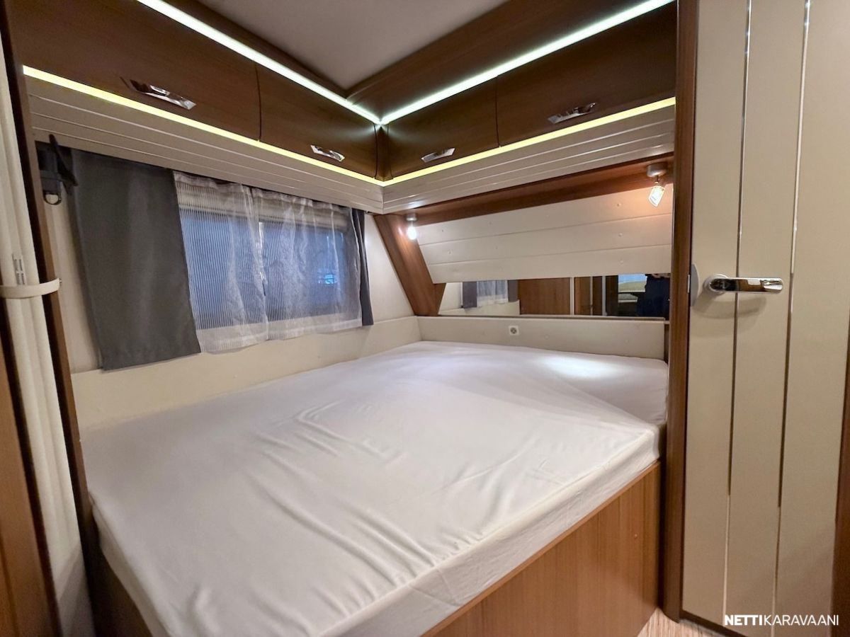 Alde -nestekeskuslämmitys kaasulla ja sähköllä, lattialämmitys, Thule -kotelomarkiisi, kitkavetopää, aluvanteet, kahdet renkaat, tilava SlimTower -jääkaappi, liesituuletin, ikkunallinen ulko-ovi, LED-valaistus ja epäsuora tunnelmavalaistus, kerrosvuoteet, pussimarkiisi, TV-antenni ja teline, kirkkaat Heki -kattoikkunat, CD-radio, aurinkopaneelit.