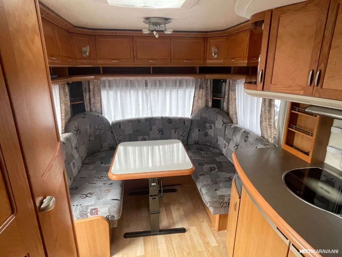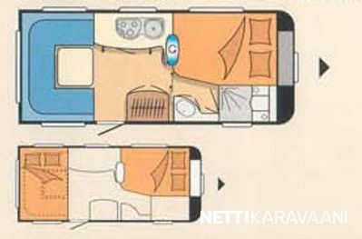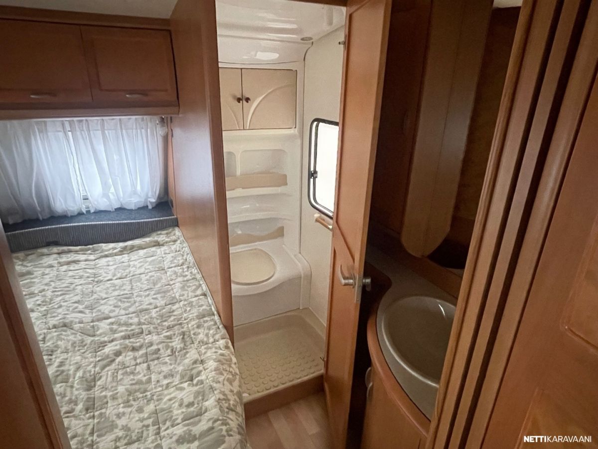 Jääkaappi, Kasetti WC, Kasettiverhot, Liesi, Lämminvesiboileri, Pakastelokero, Pesuallas, Sisätilanpistoke, TV-antenni tai lautasantenni, Kattoluukku, Lattialämmitys, Sähköpatruuna, Trumatic, Tukijalat